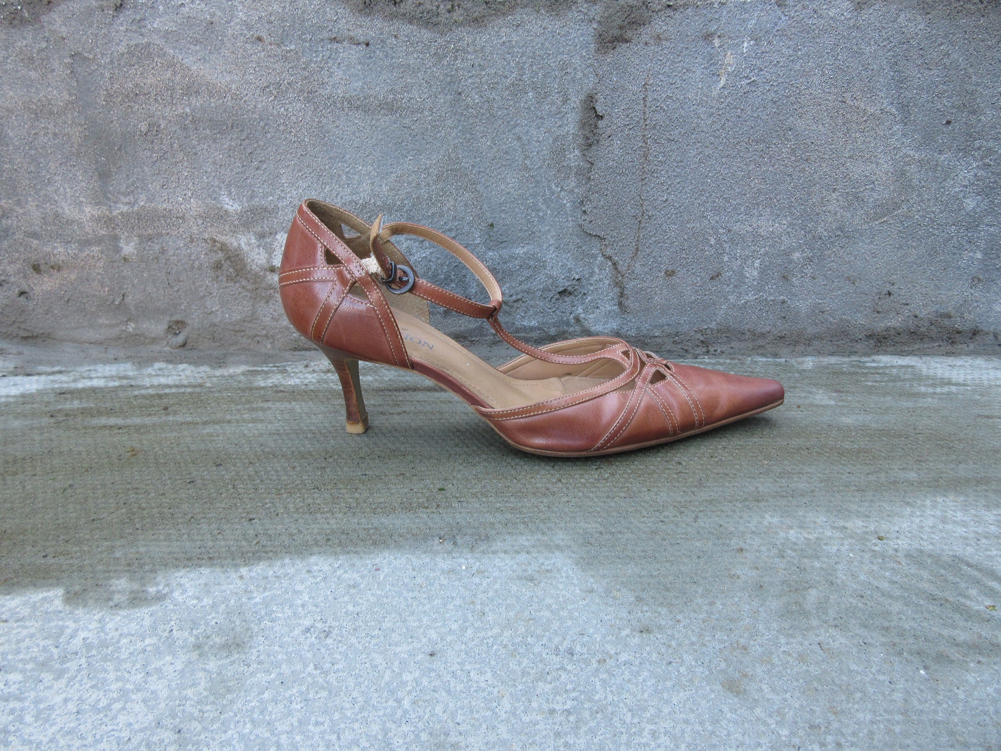 Genuine leather tan brown pointed toe court heels with t-strap, white stitching detail and front cross detail, fastens with strap buckle.