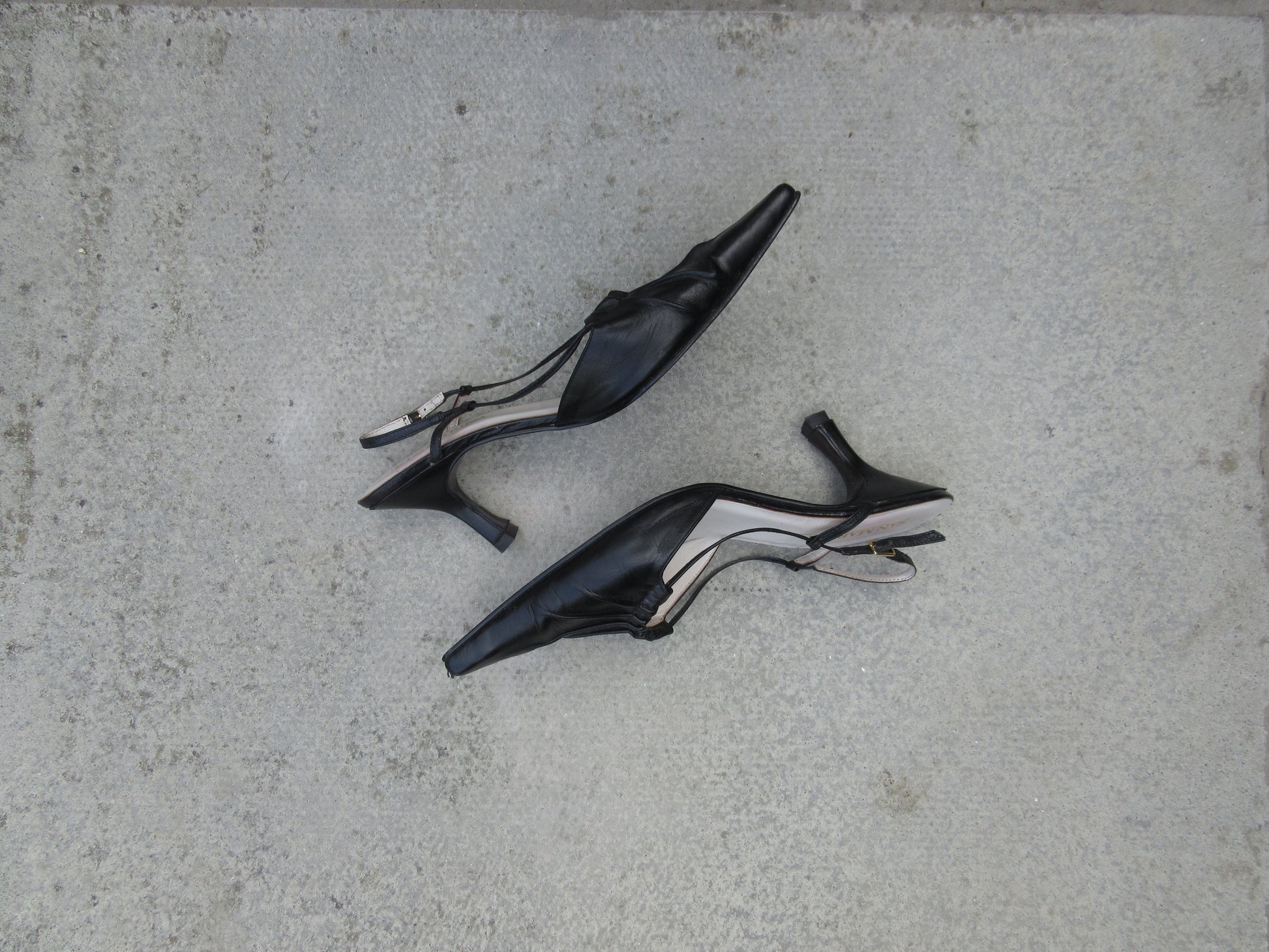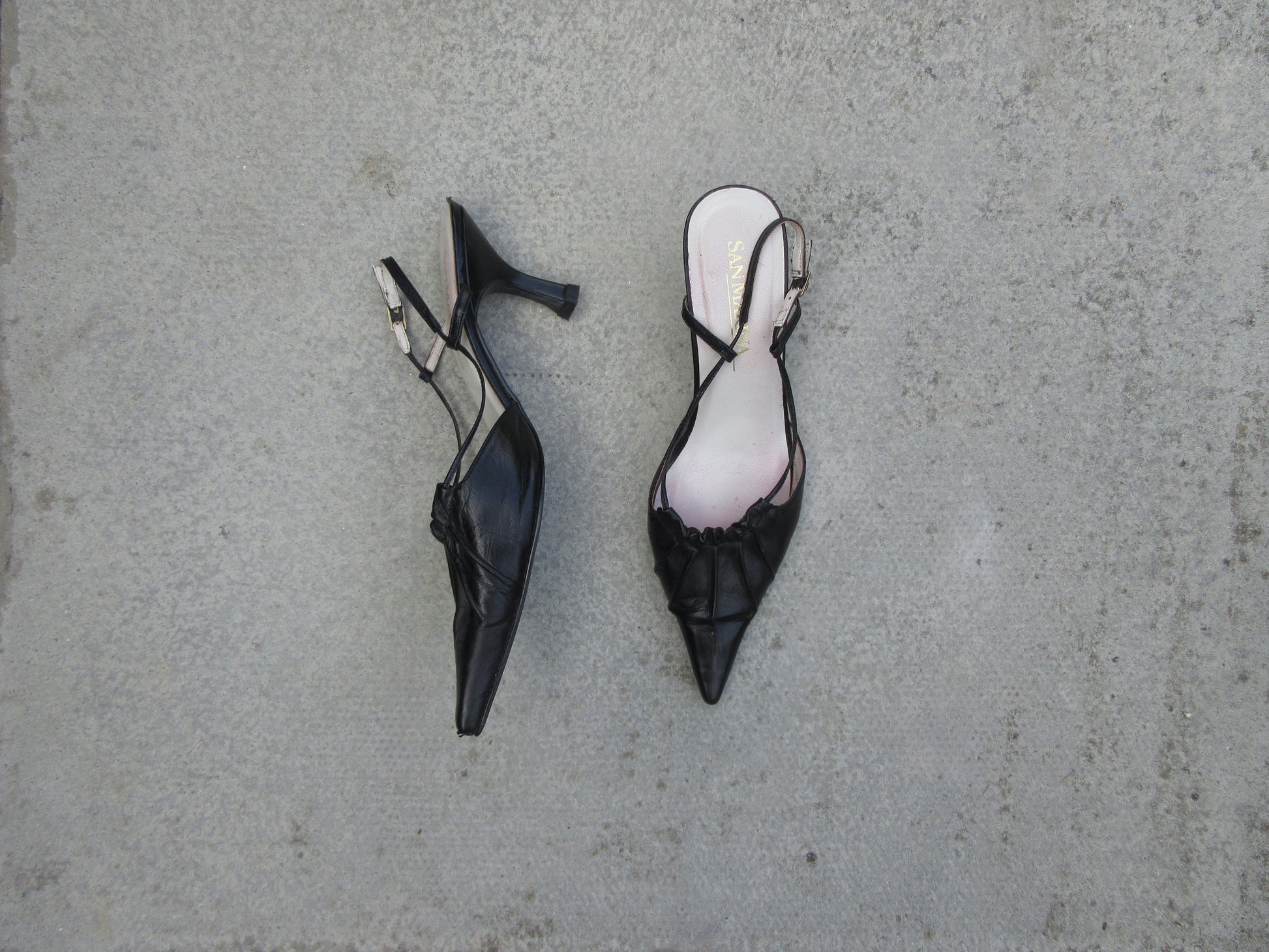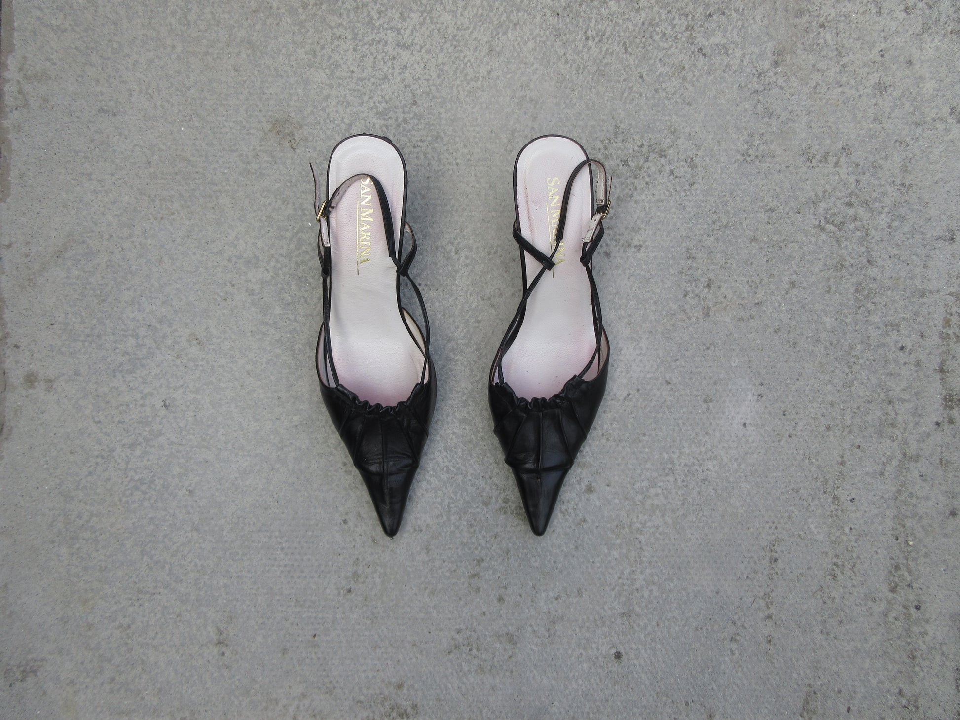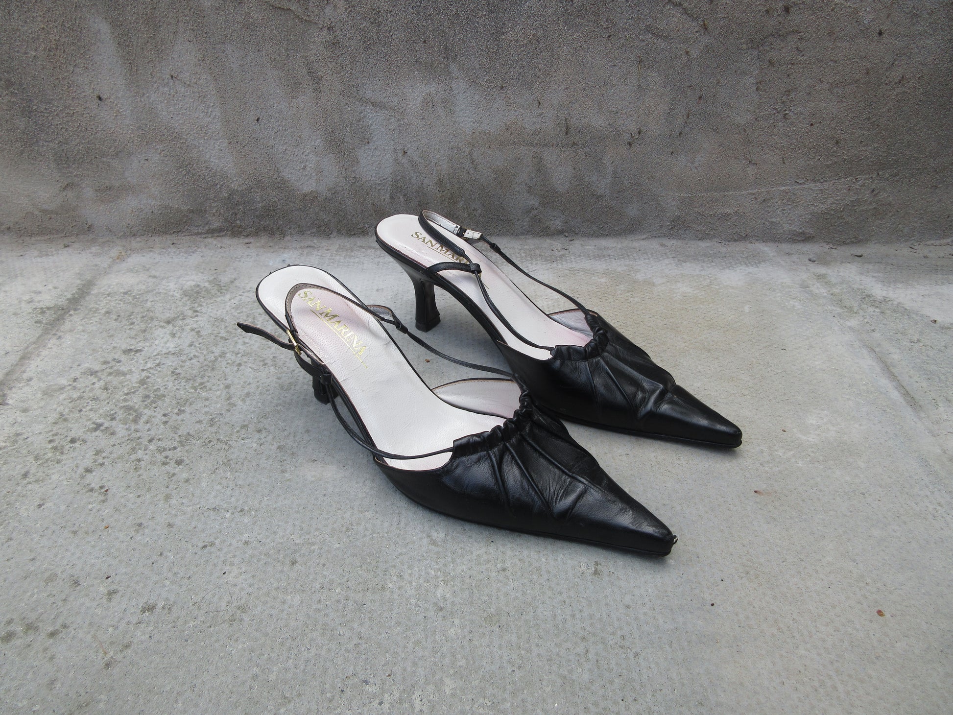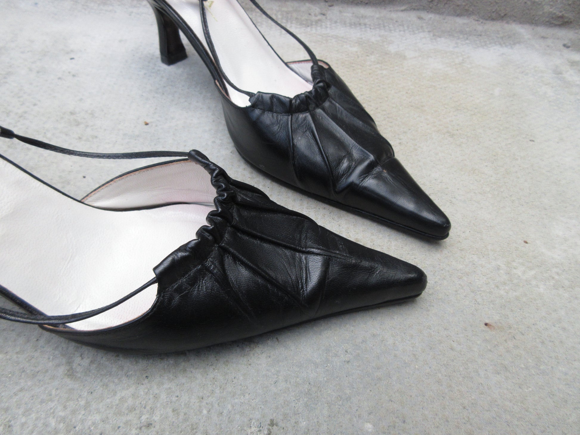 Genuine leather black pointed toe slingback heels with front ruched detailing.