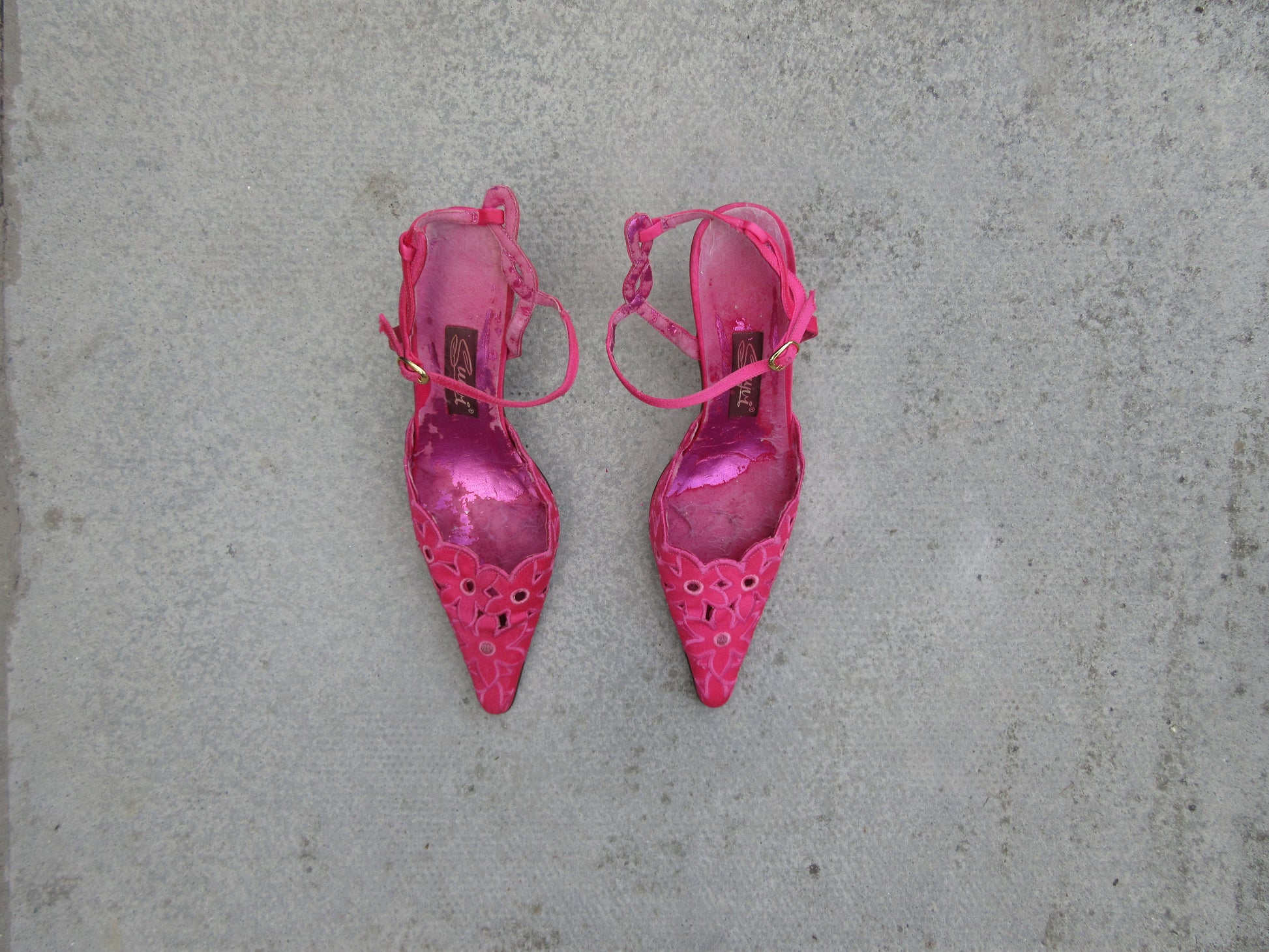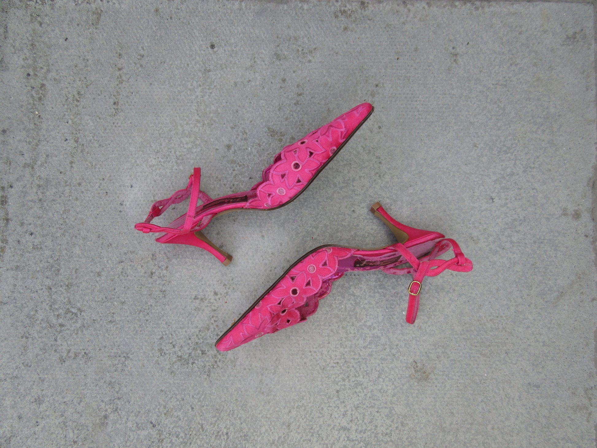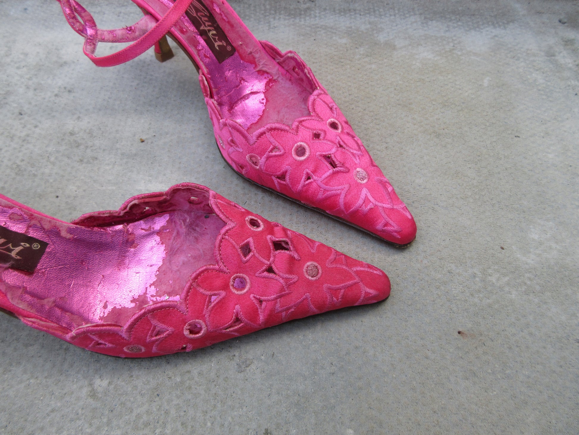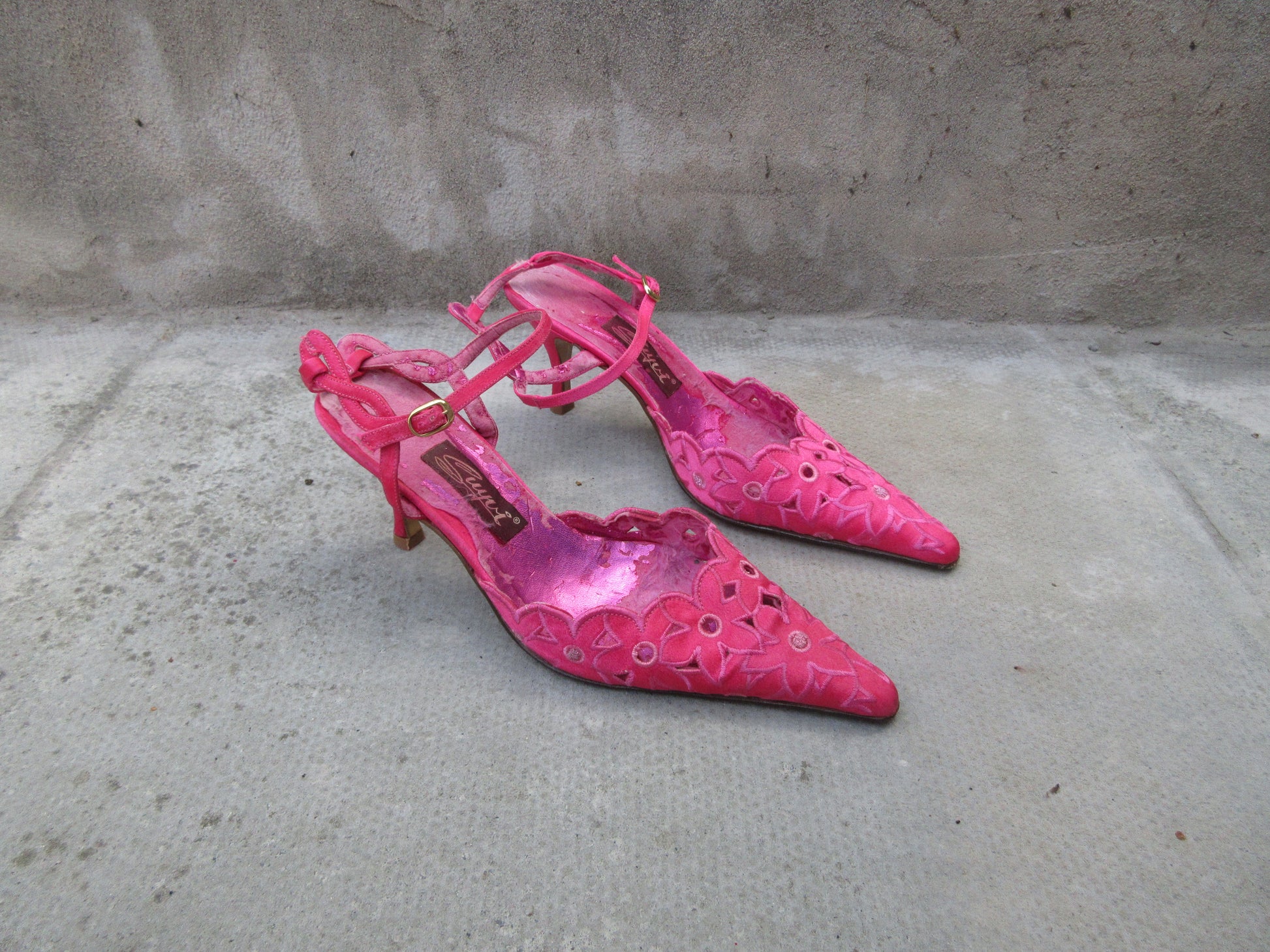 Bright pink pointed toe heels with floral shaped trimming design across the front and the ankle straps.