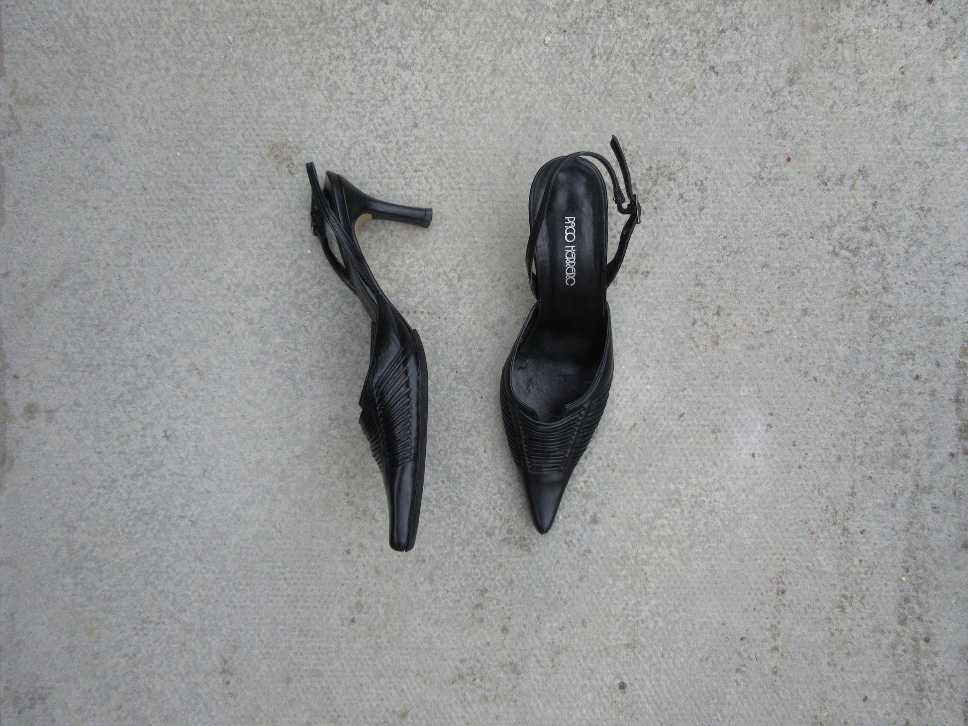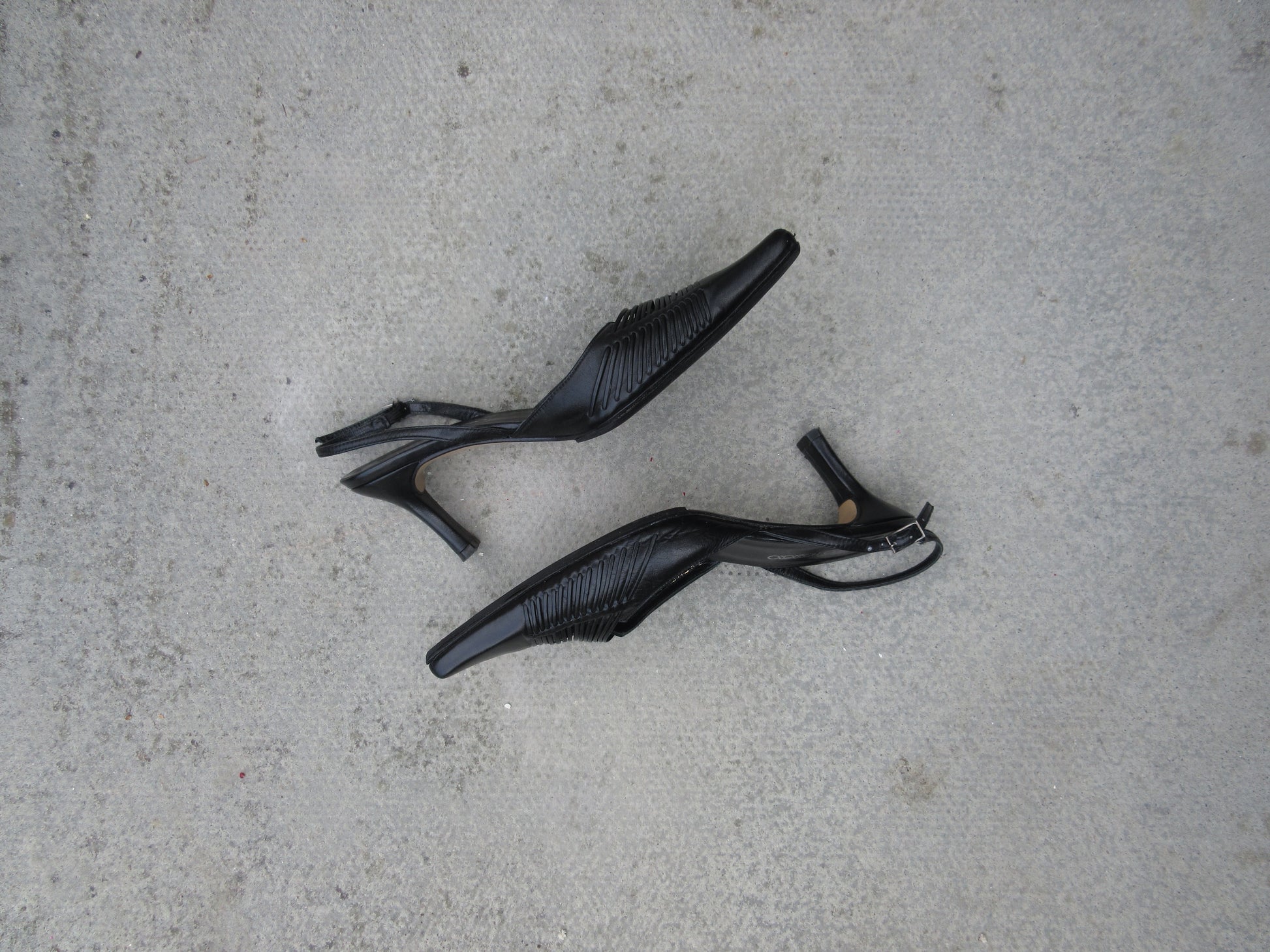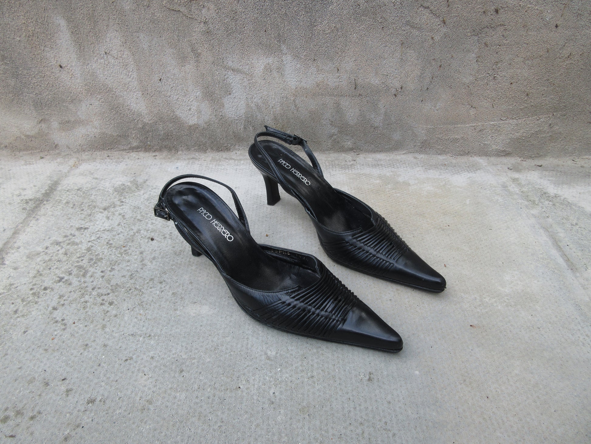Genuine leather black pointed toe slingback heels with front cross lace stitching detail.