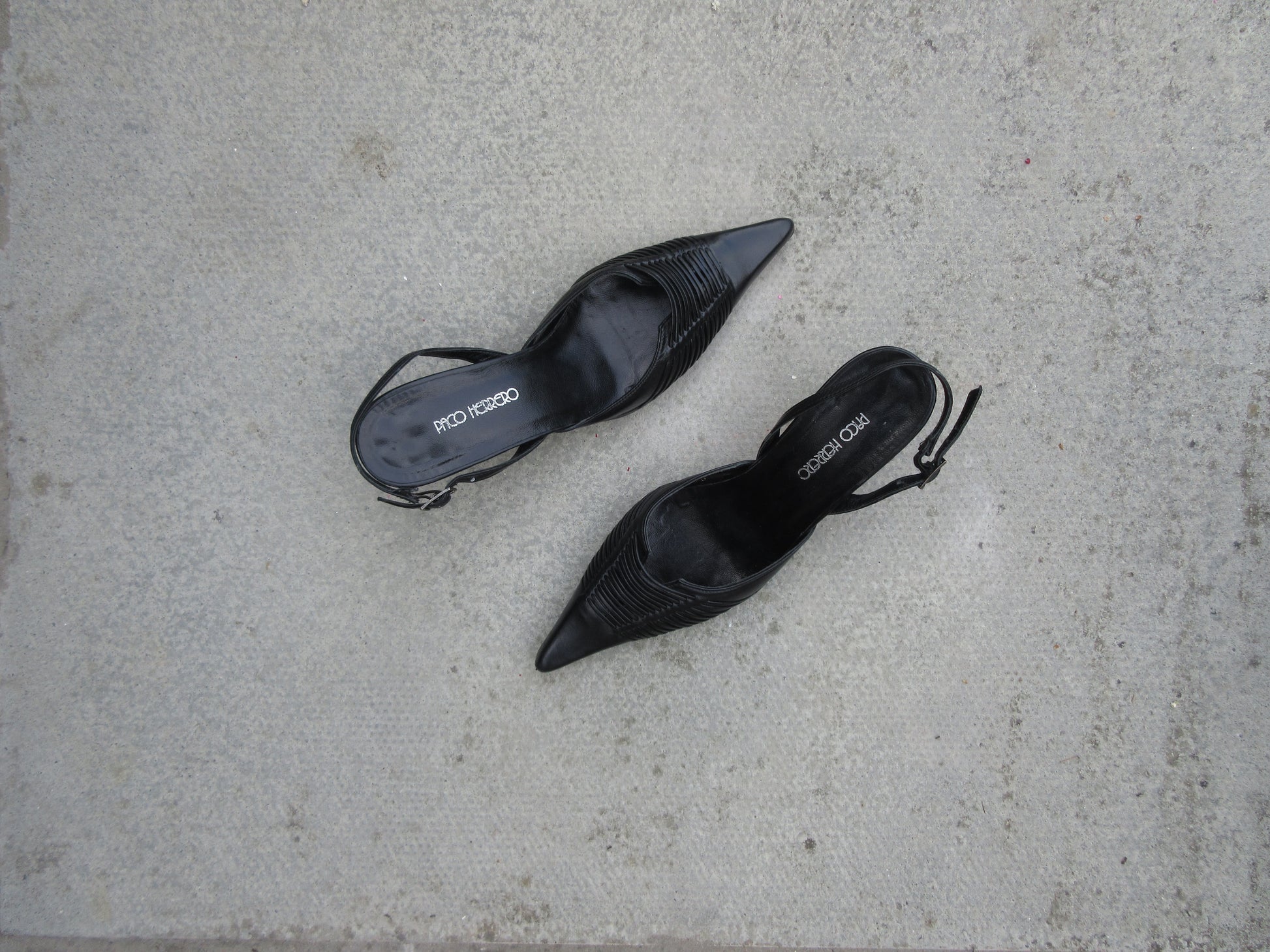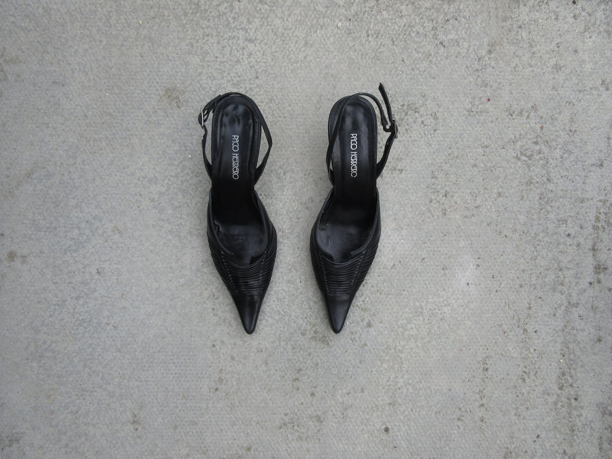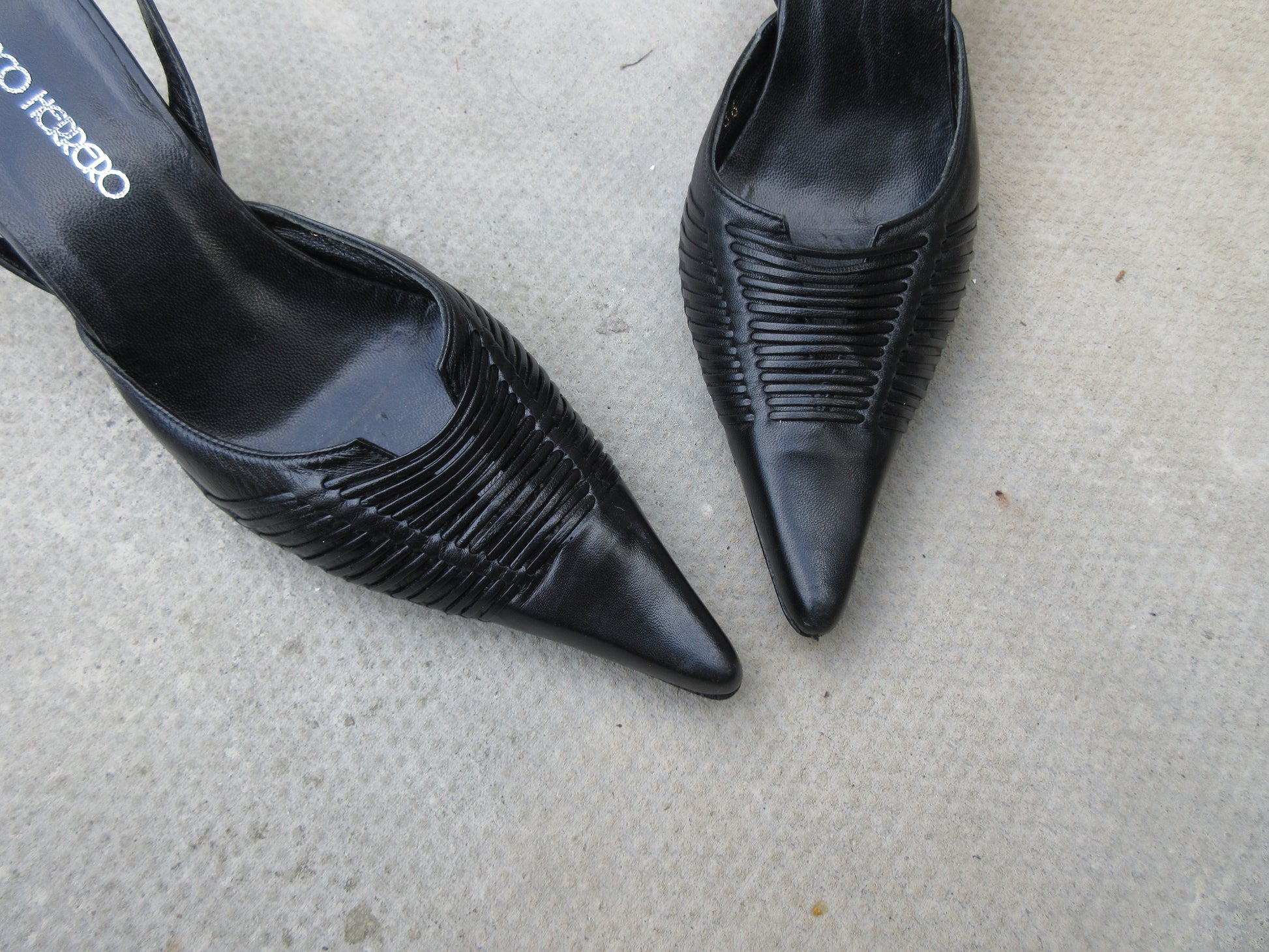 Genuine leather black pointed toe slingback heels with front cross lace stitching detail.