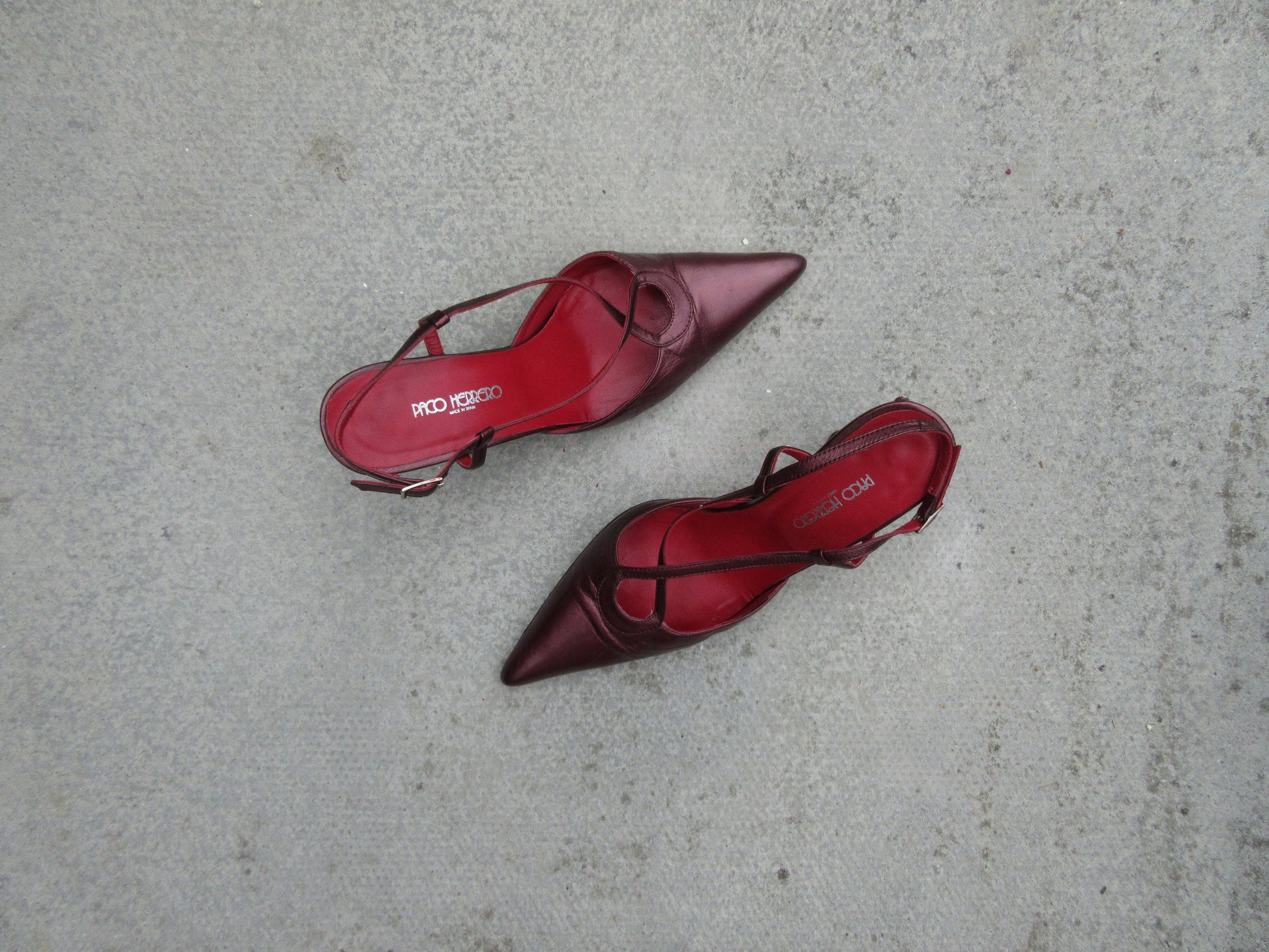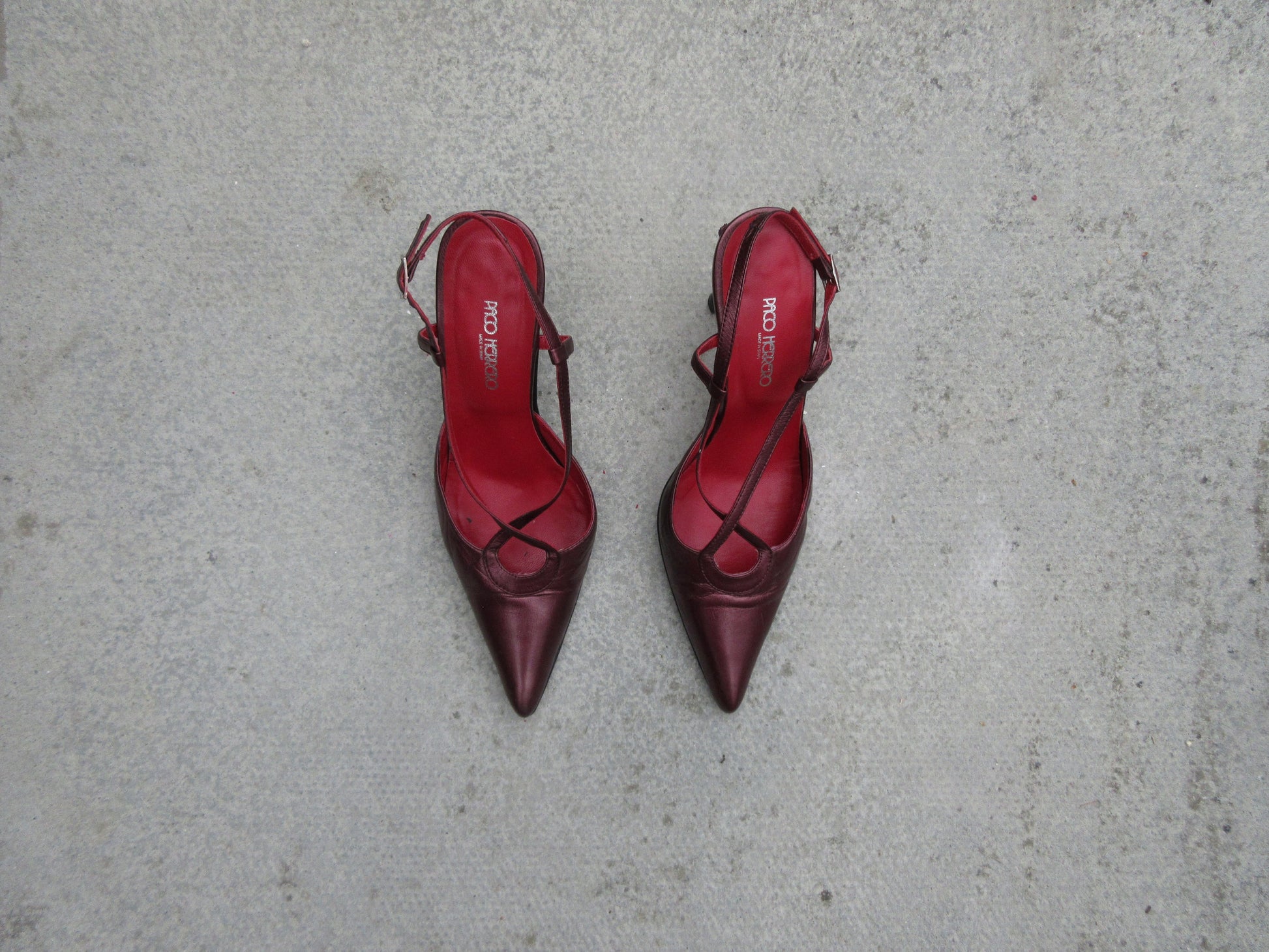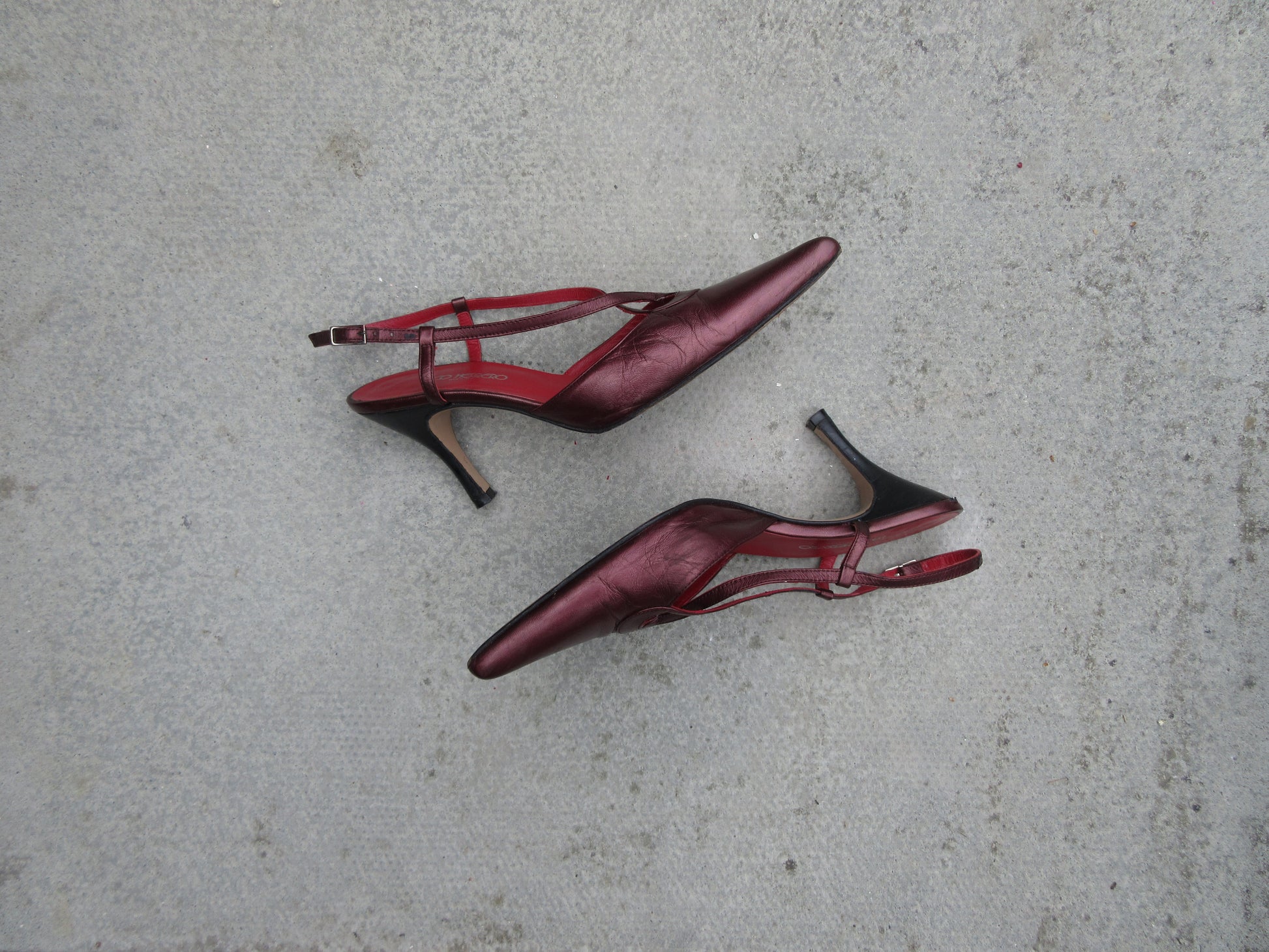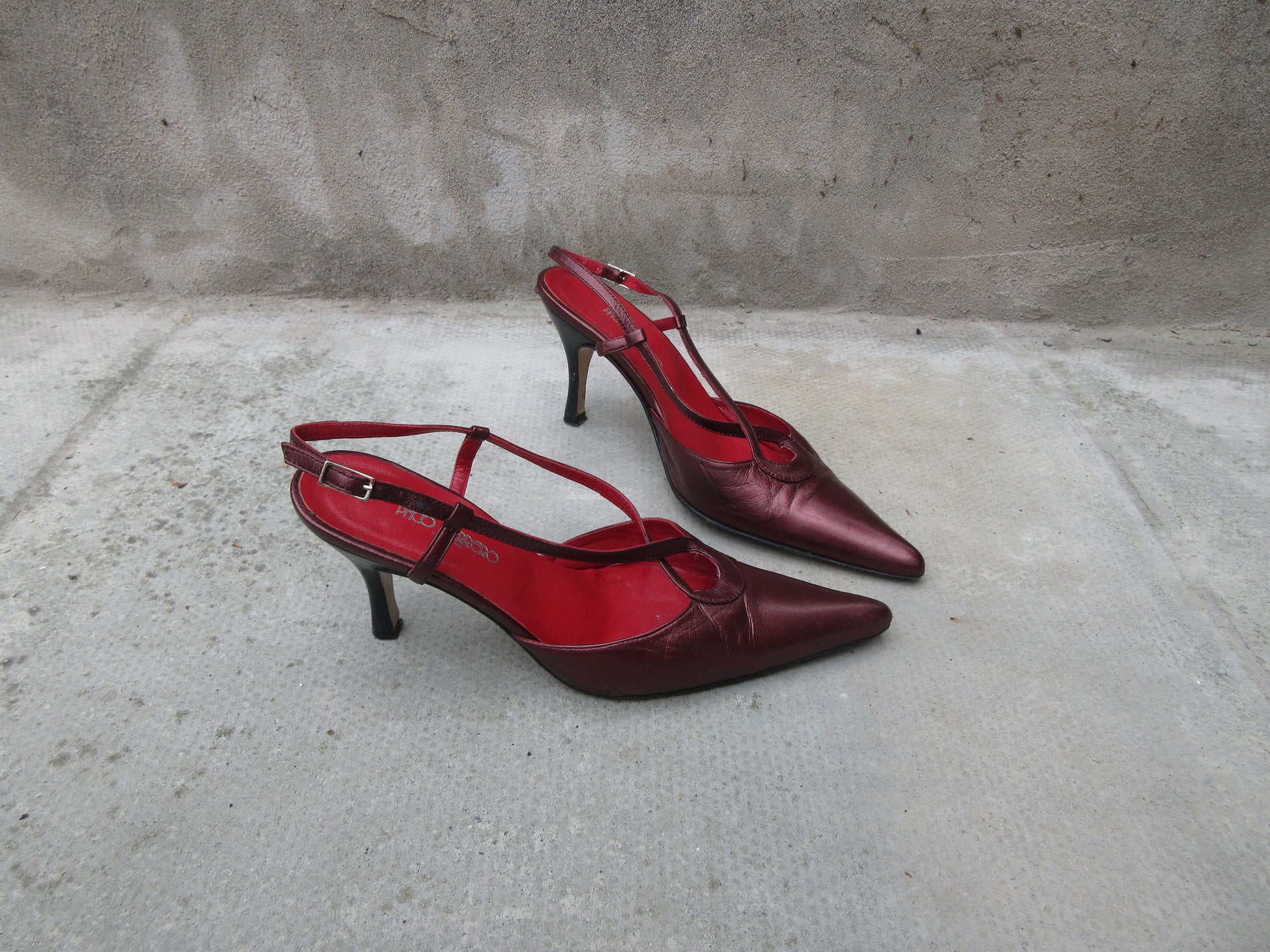 Genuine leather purple hue burgundy slingback heels with front criss cross detail, can be adjusted with slingback buckle fastener. Stunning black heel.