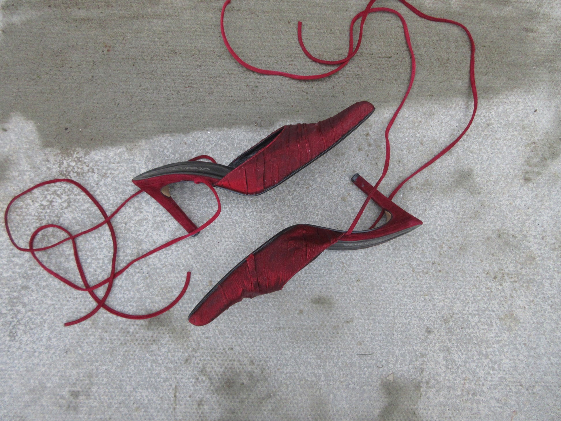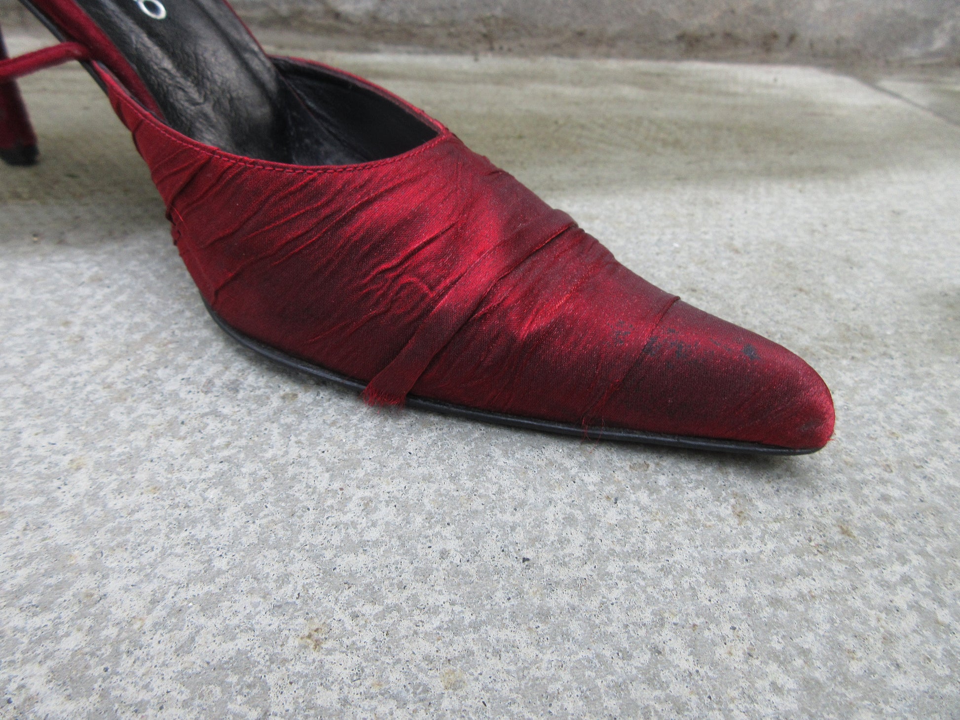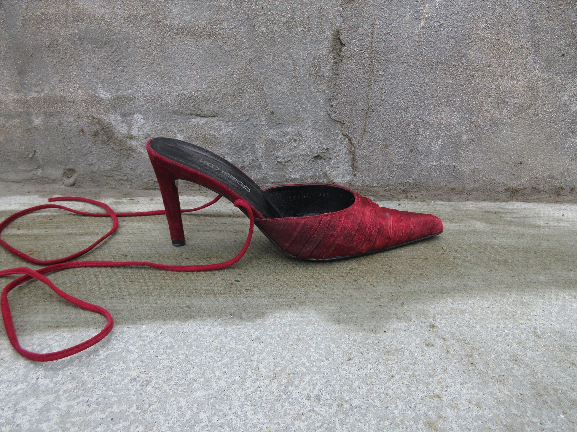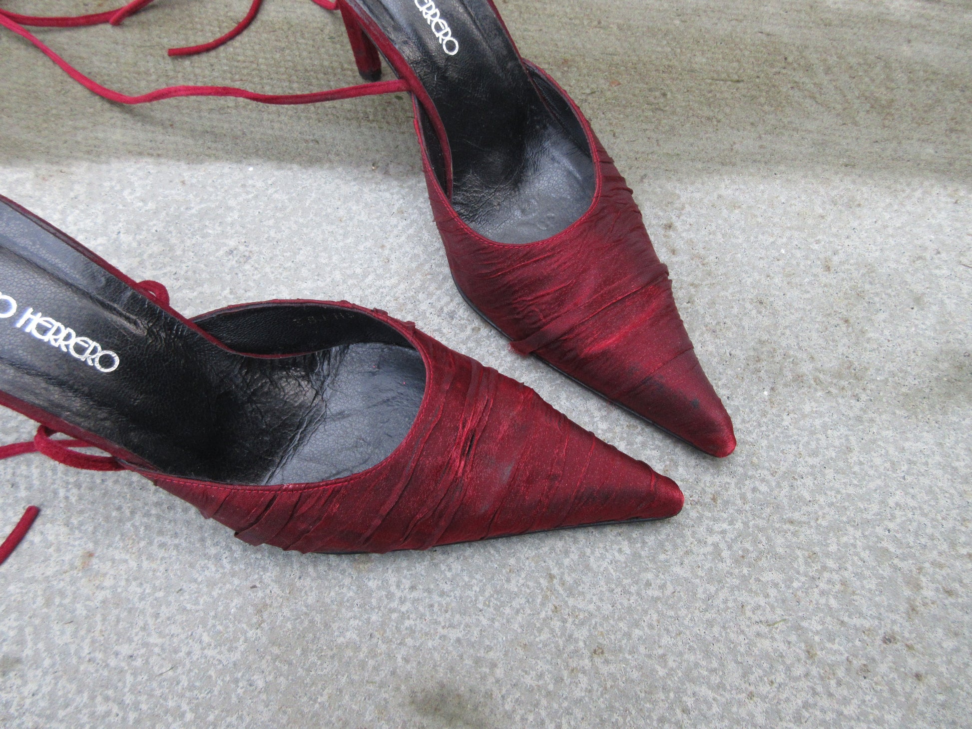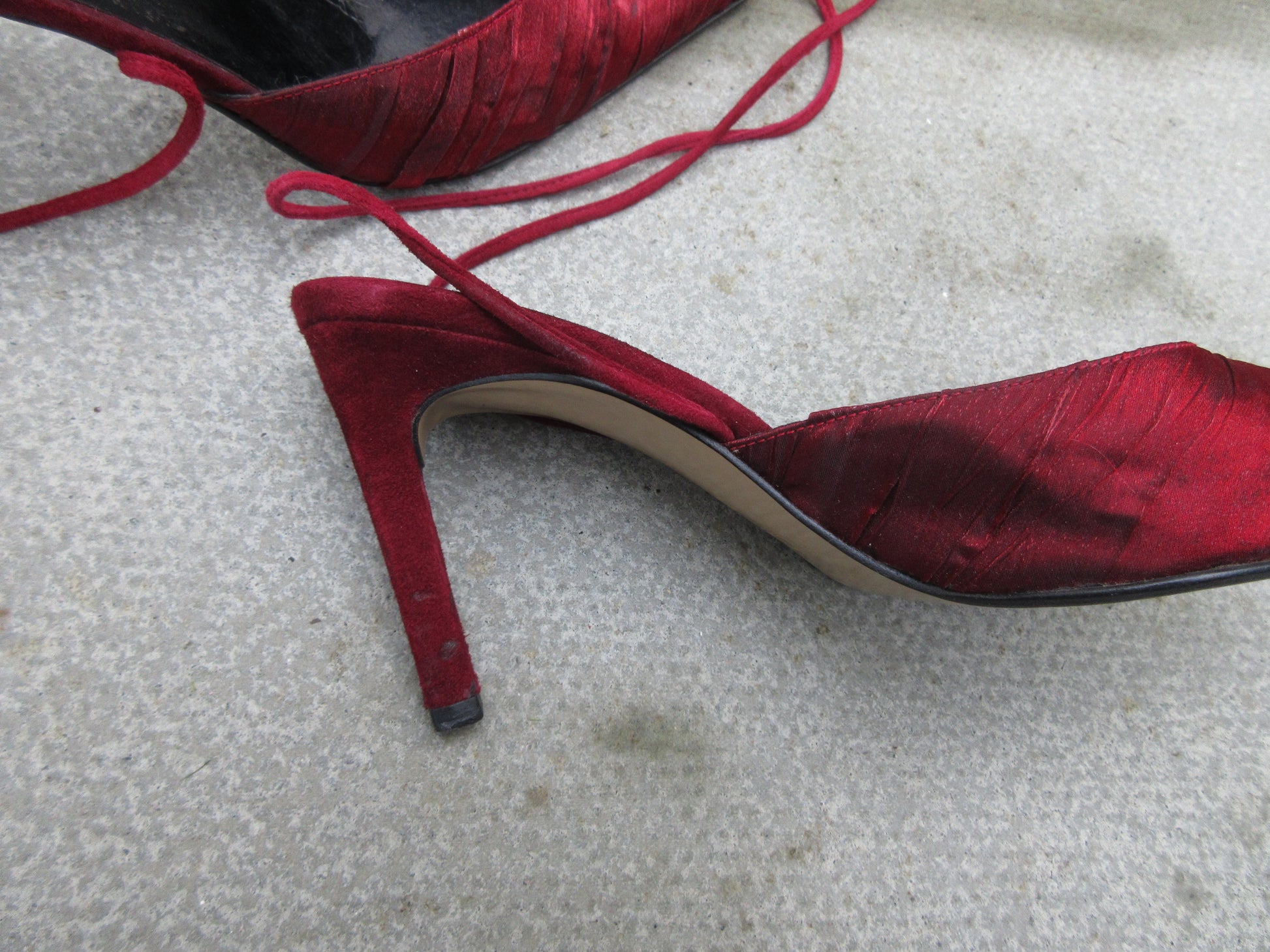 Genuine leather suede leather heels with Christmas red shimmery fabric covering the front, lace up strap is suede leather.