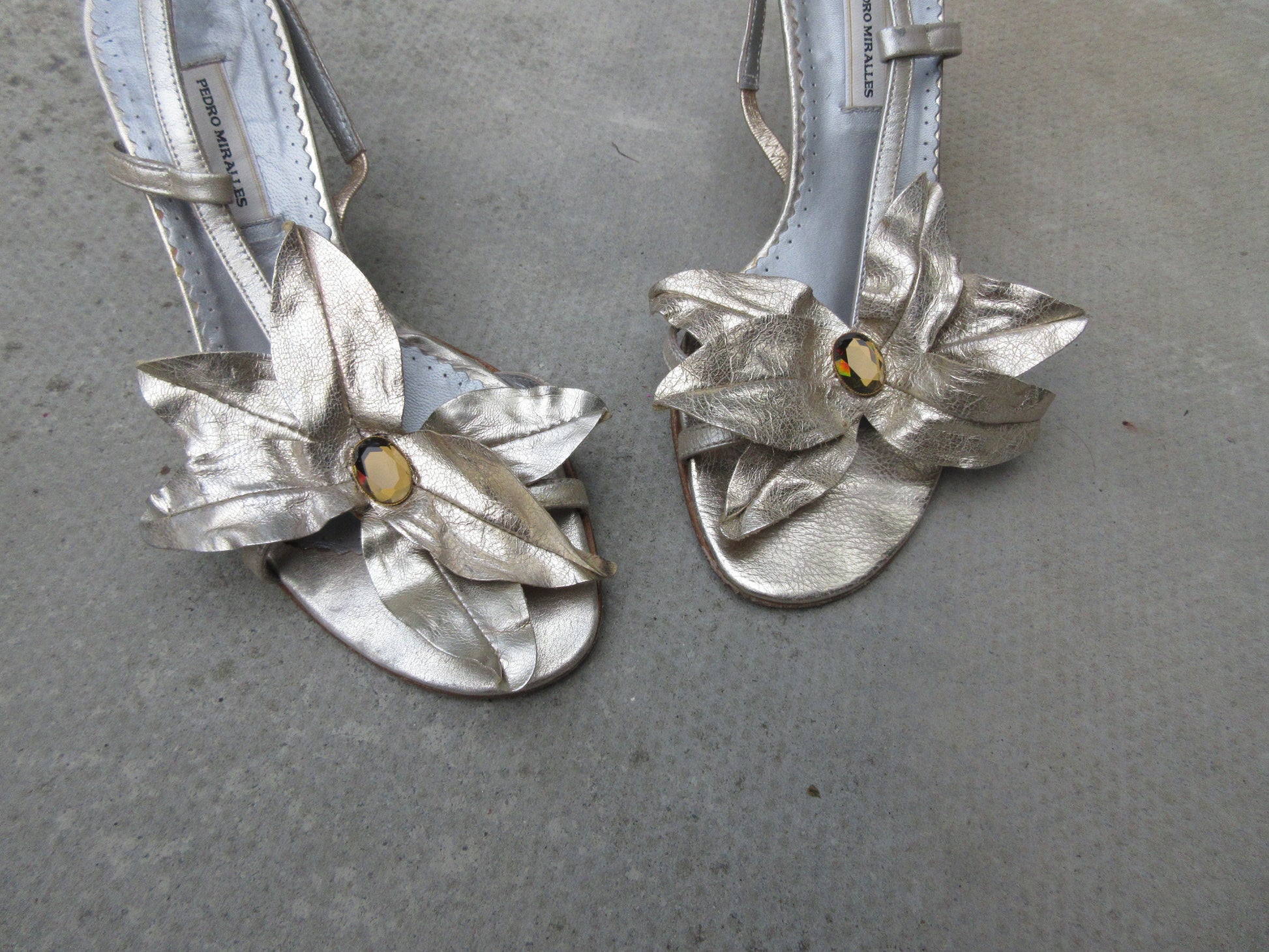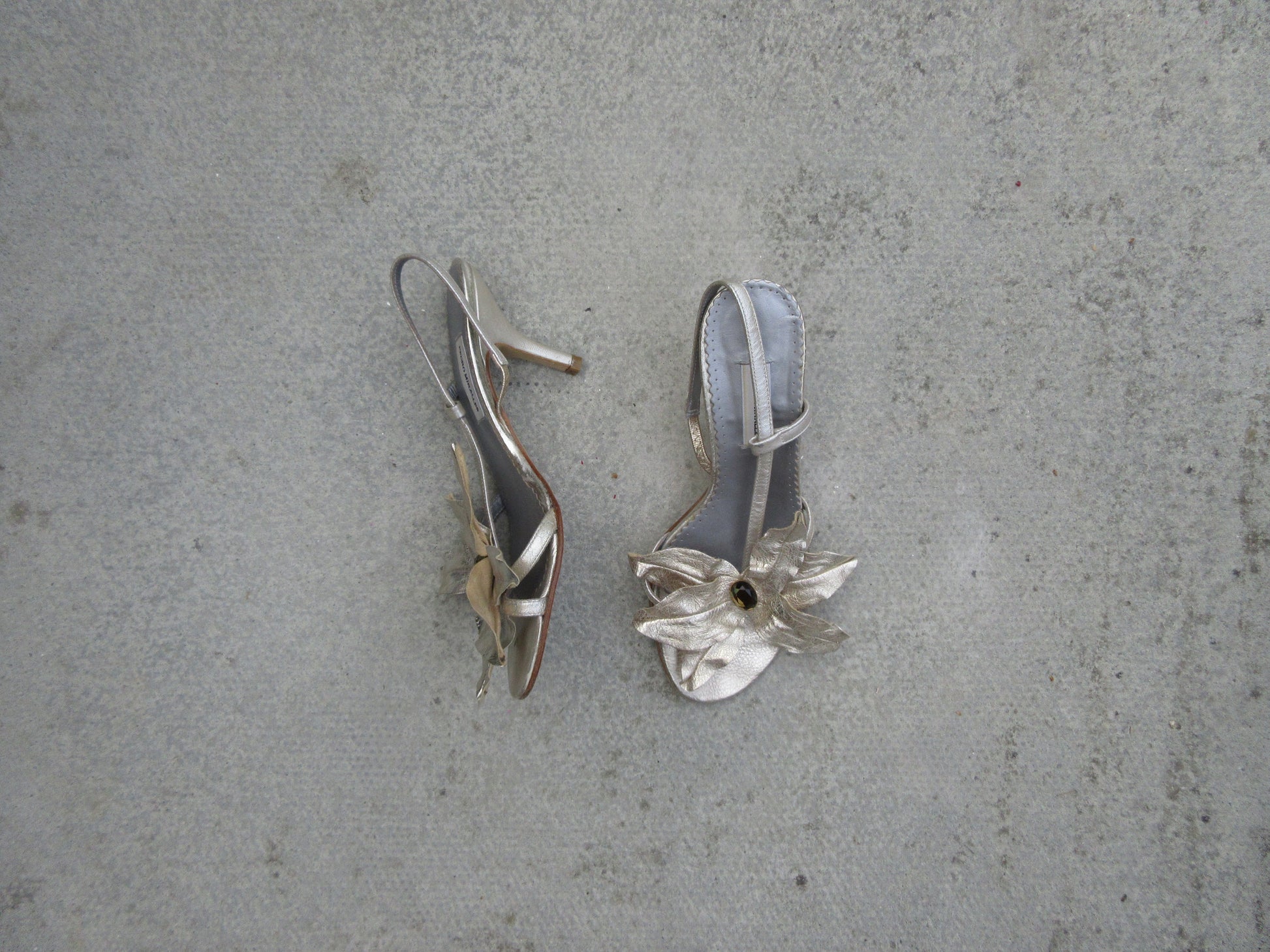Genuine leather open toe 3D flower strappy slingback heels with light brown gem in the middle of the flower. Champagne gold colour. Strap has stretch to it.