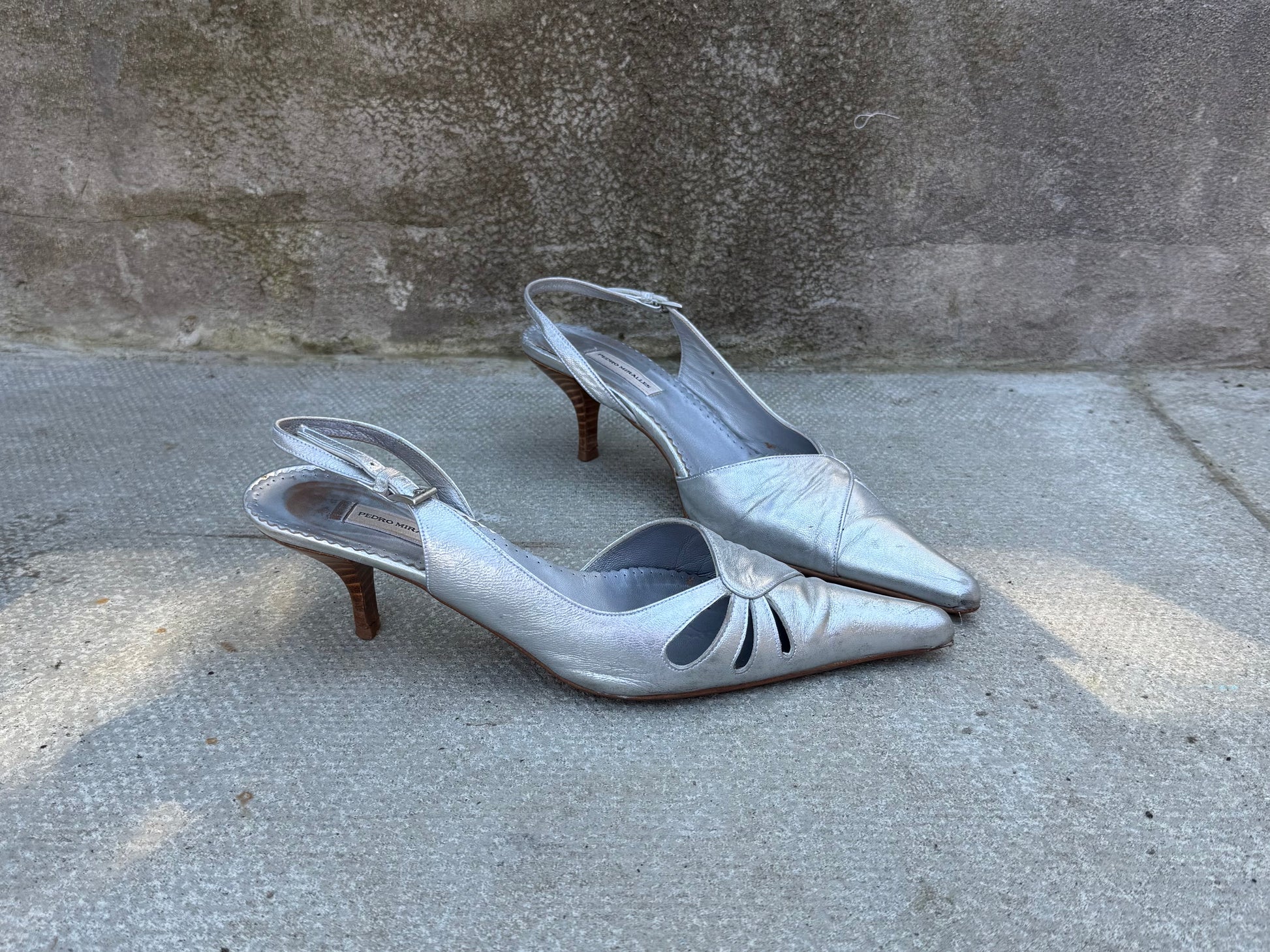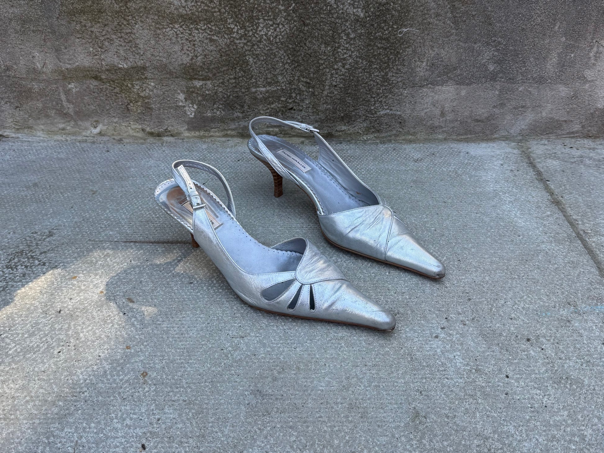 Genuine Spanish leather, silver metallic shiny pointed toe kitten heels with slingback strap, front has cute cut out details.