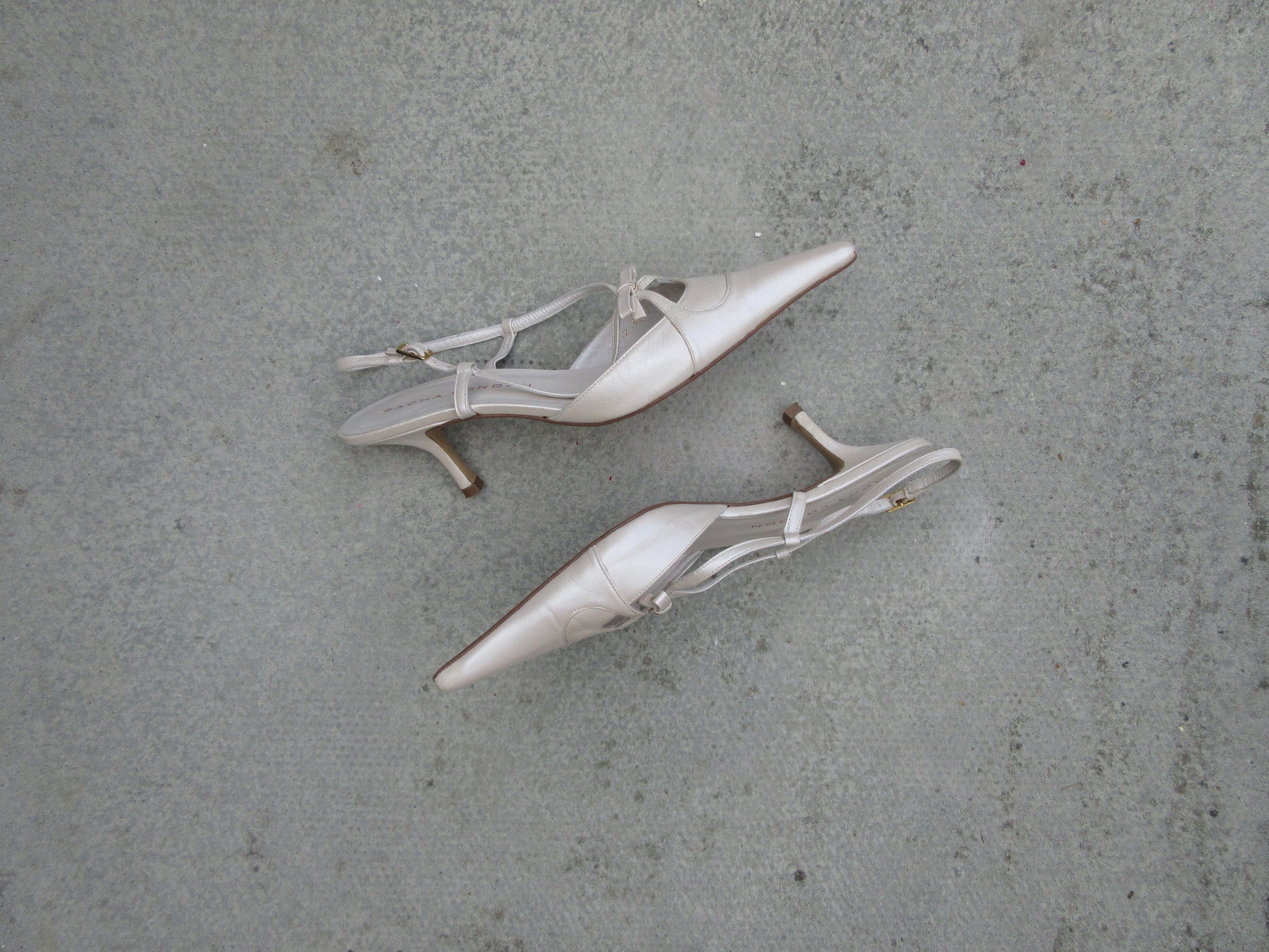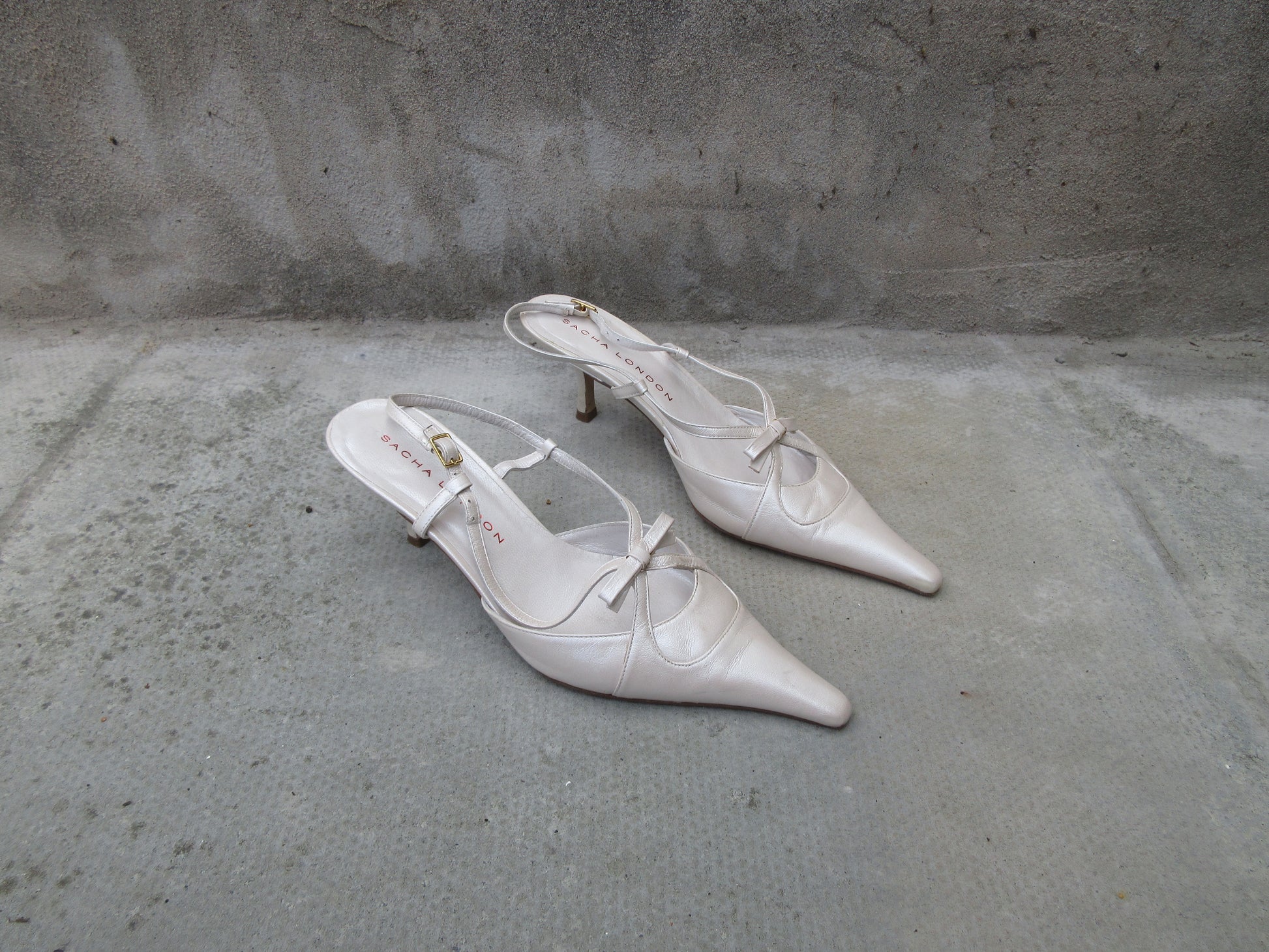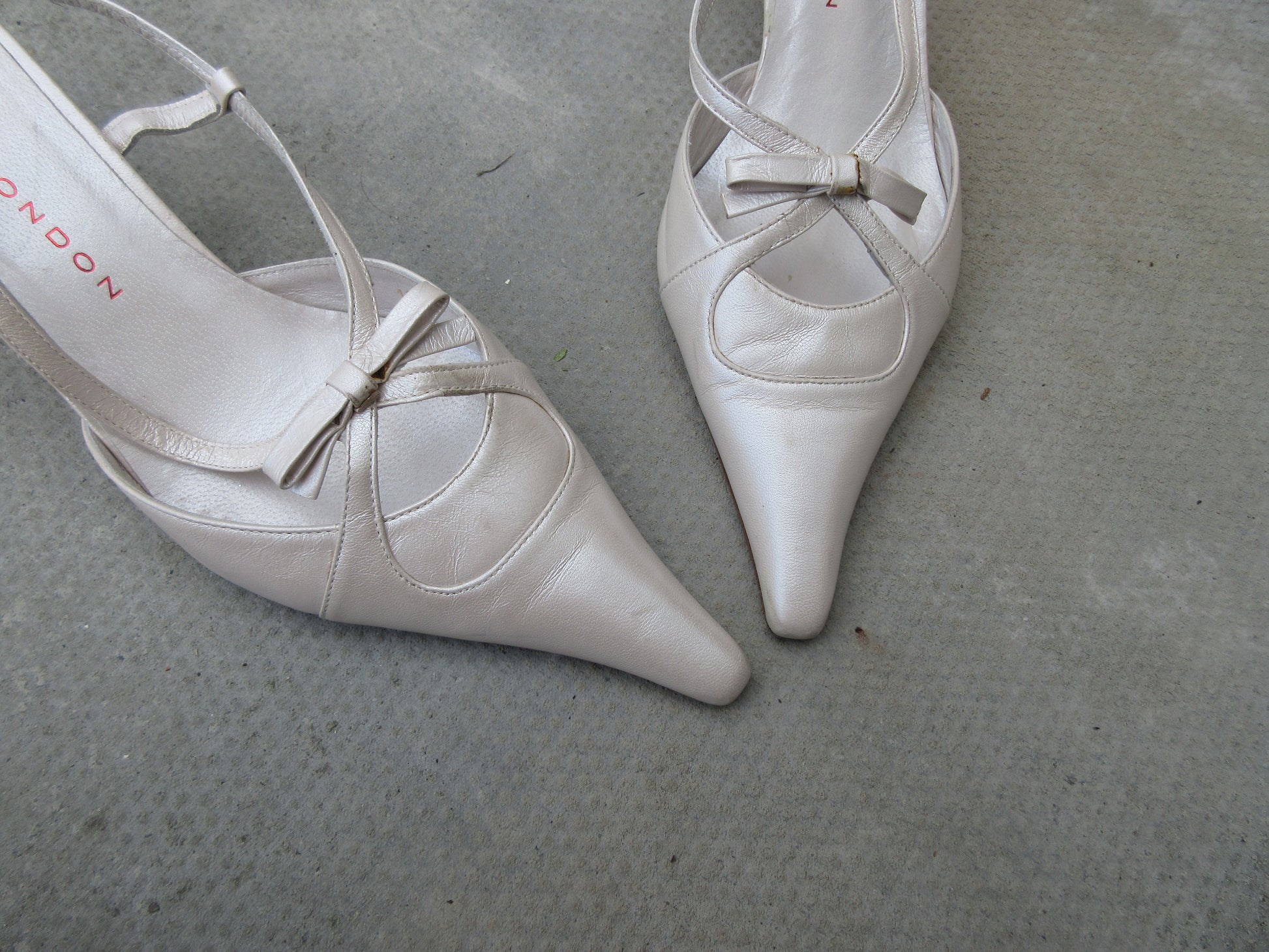 Genuine leather iridescent white silver slingback heels with bow across the front.
