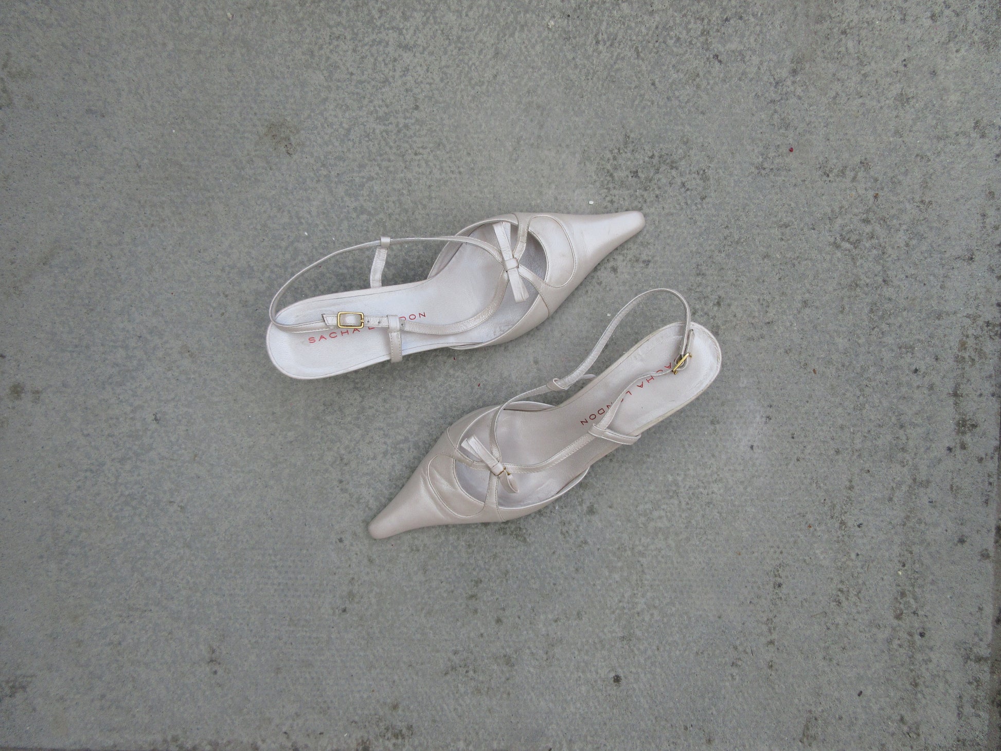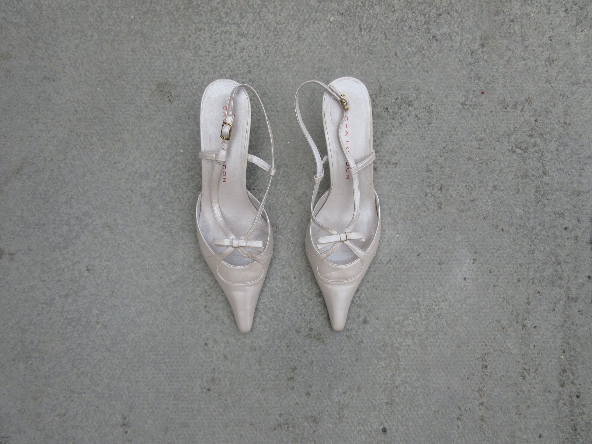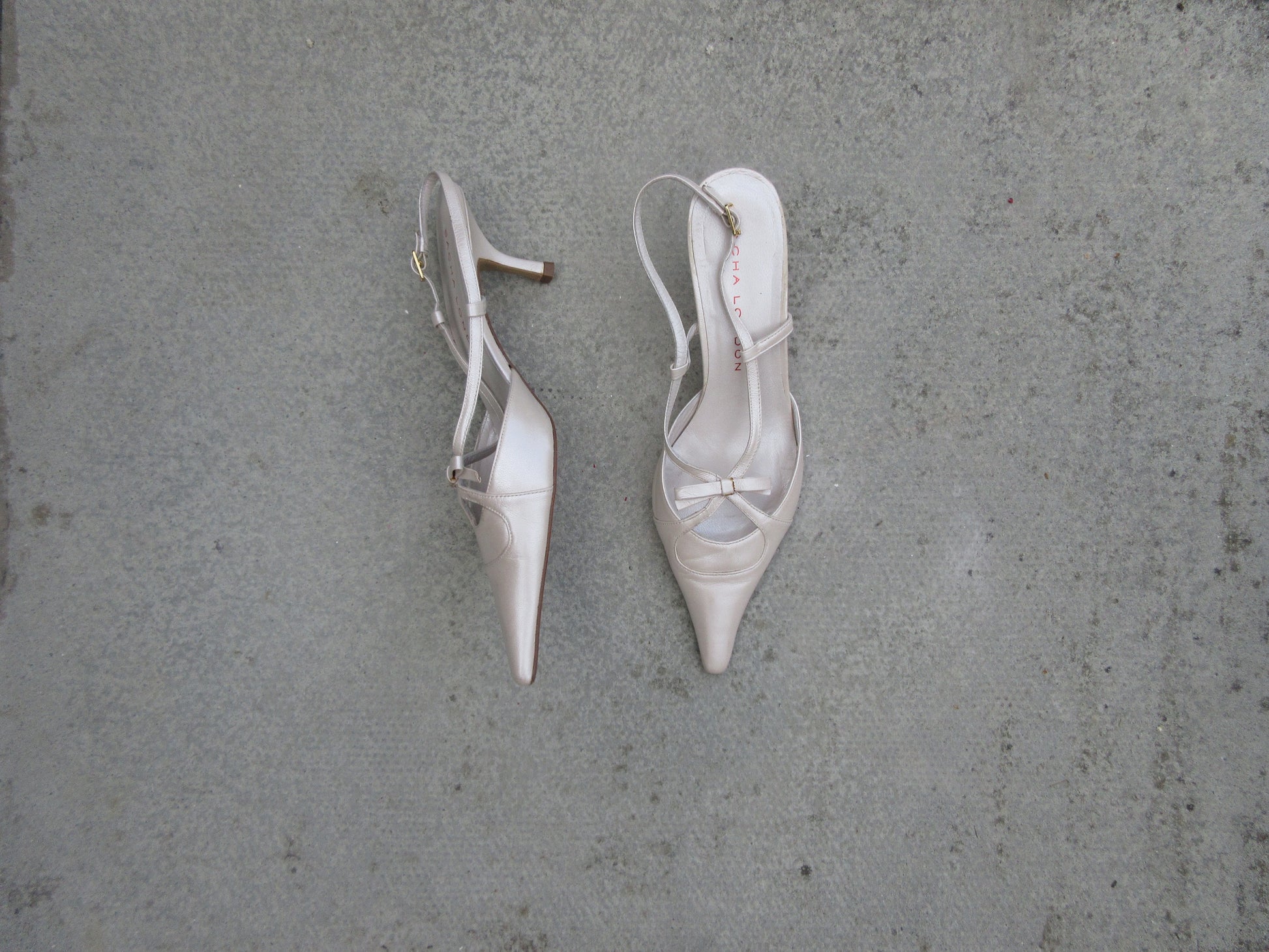 Genuine leather iridescent white silver slingback heels with bow across the front.