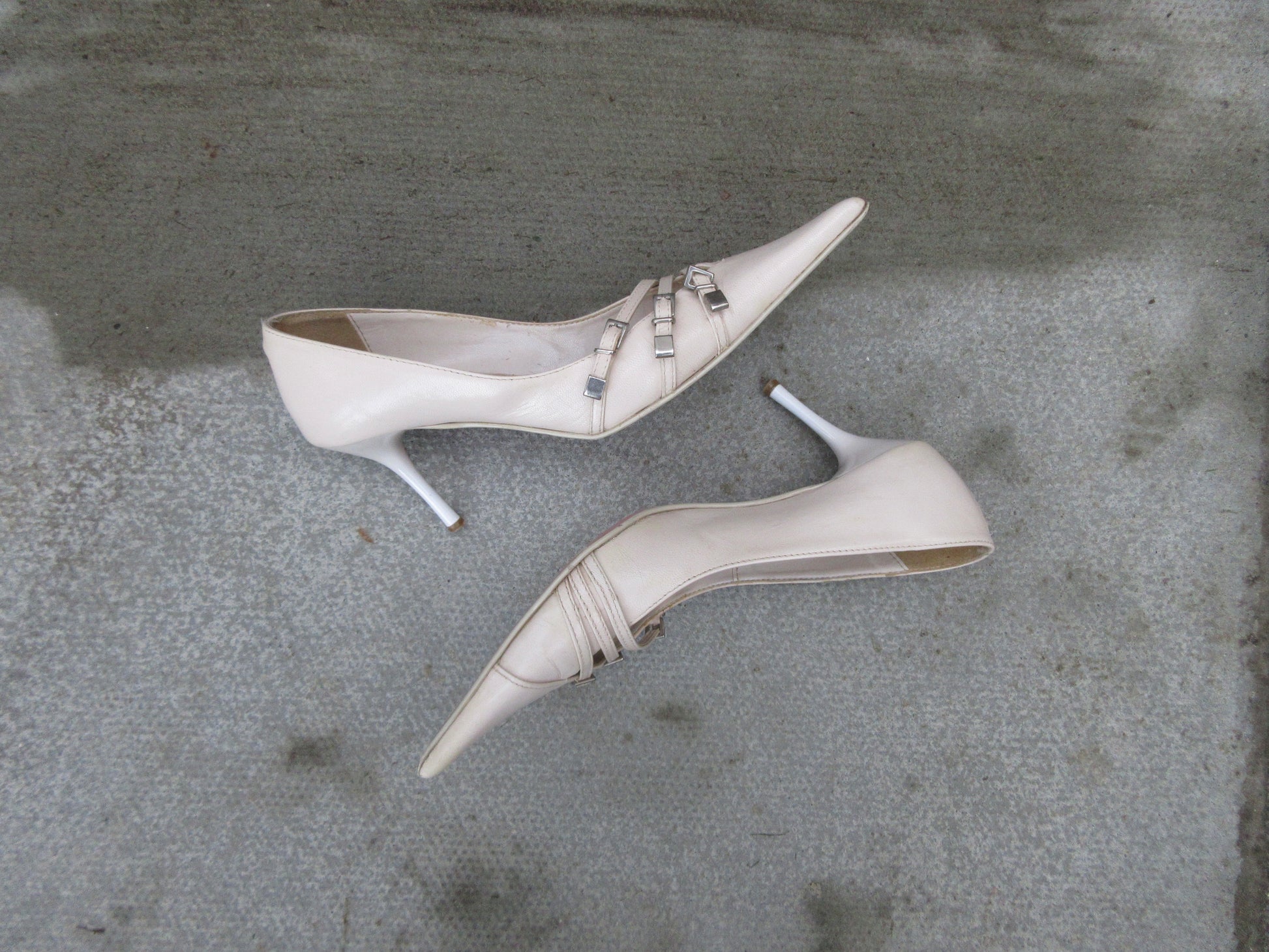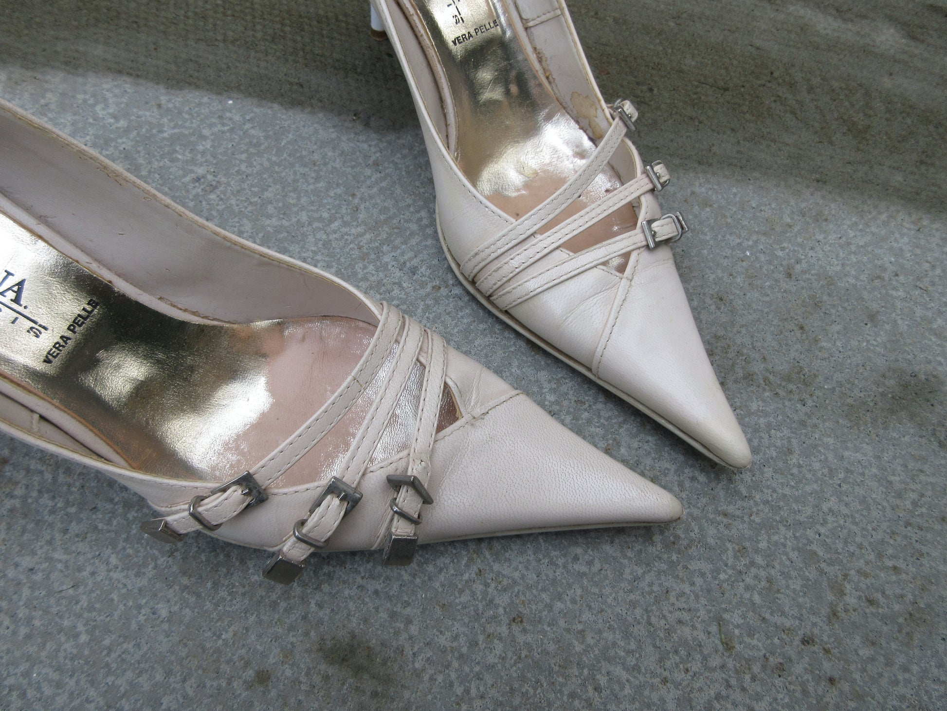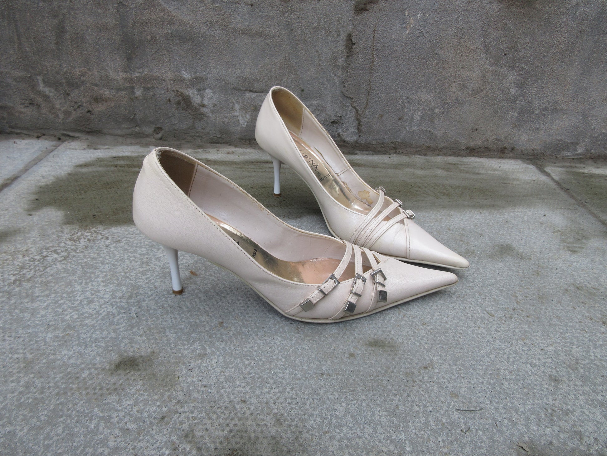 Genuine leather cream heels with white heel. Three mini buckles across the front with silver metal details.