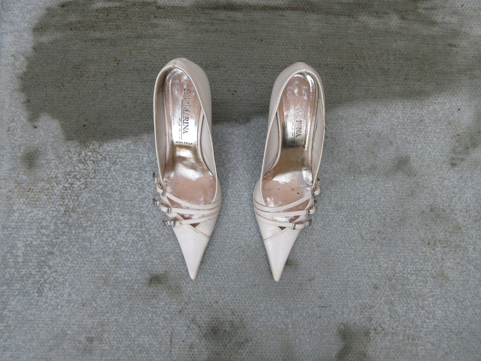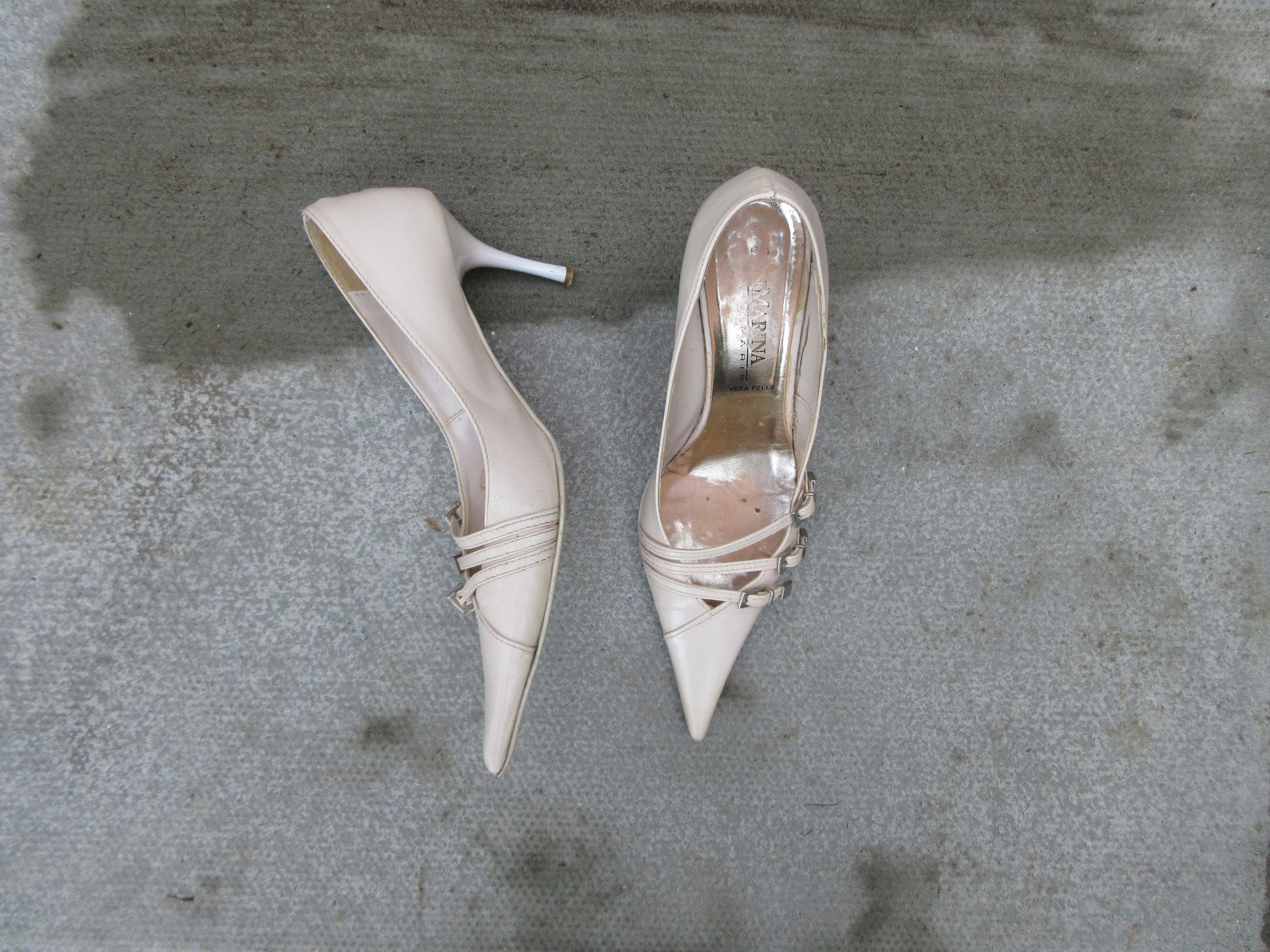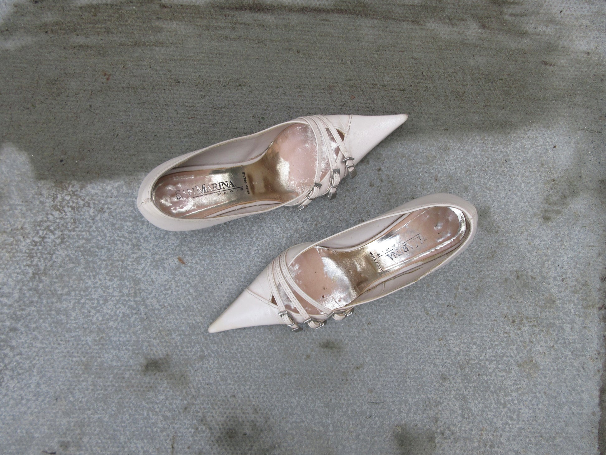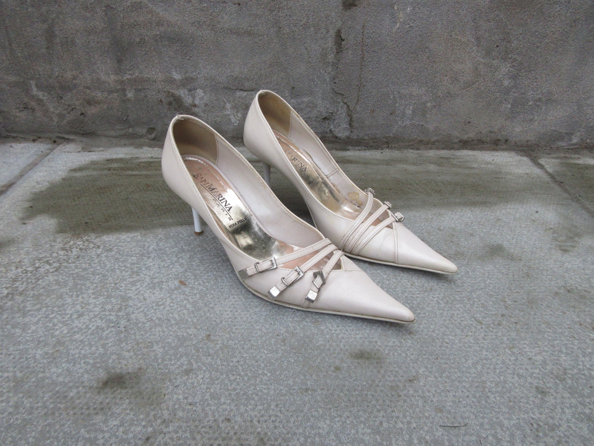 Genuine leather cream heels with white heel. Three mini buckles across the front with silver metal details.