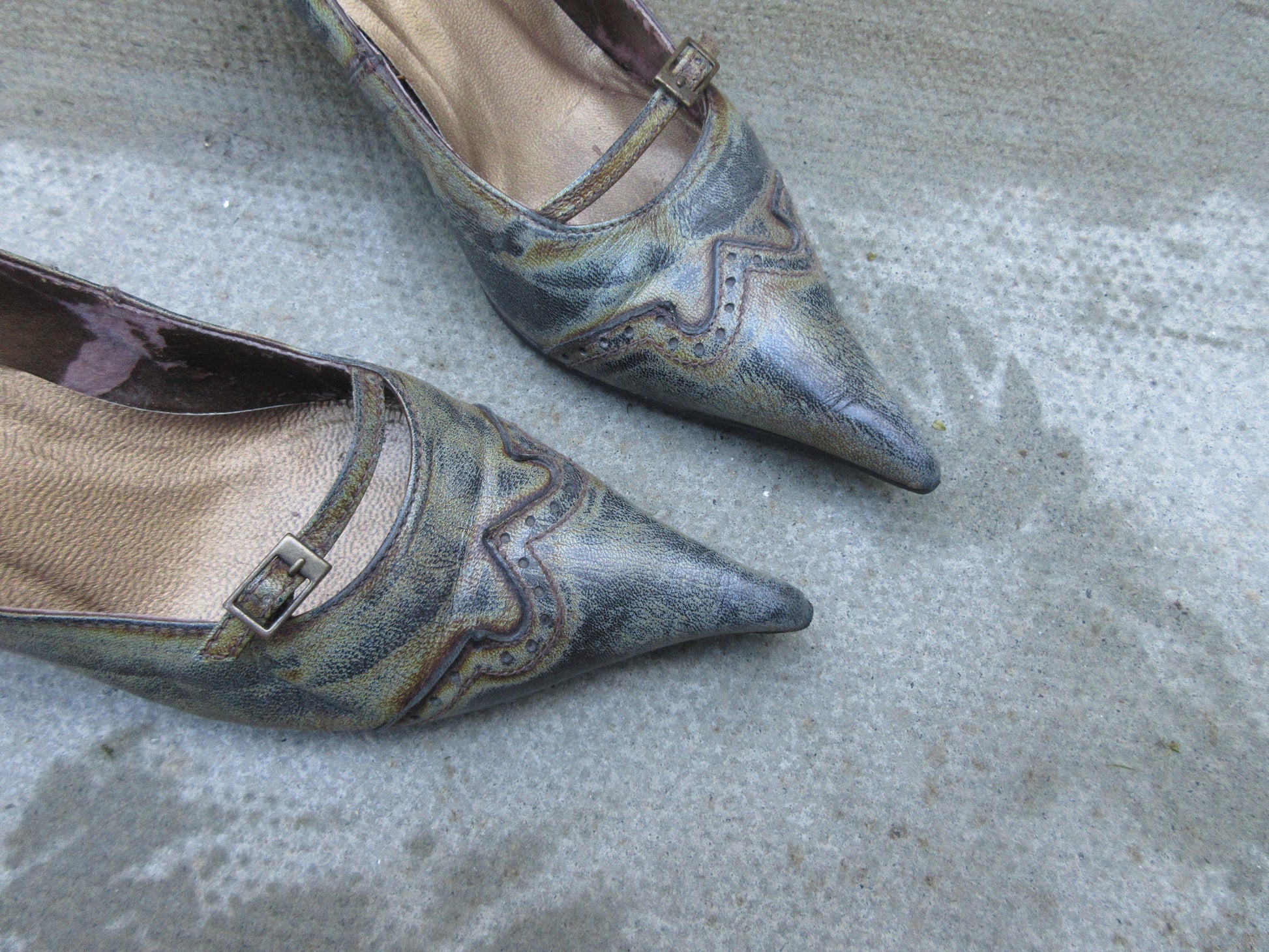 Genuine leather dark green pointed toe court heels with mini front buckle, cowboy leather stitching detail.