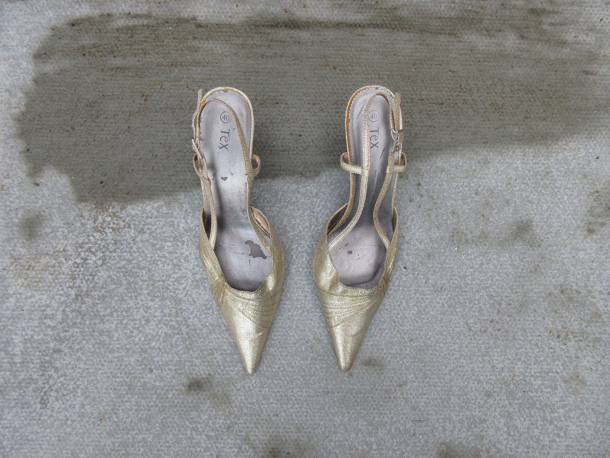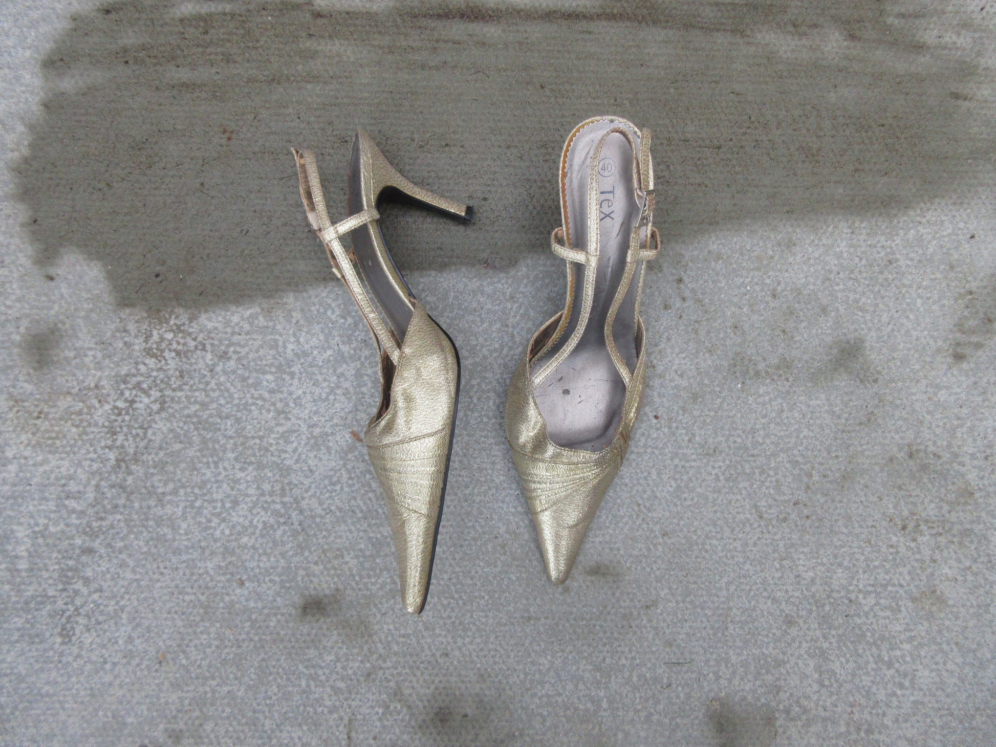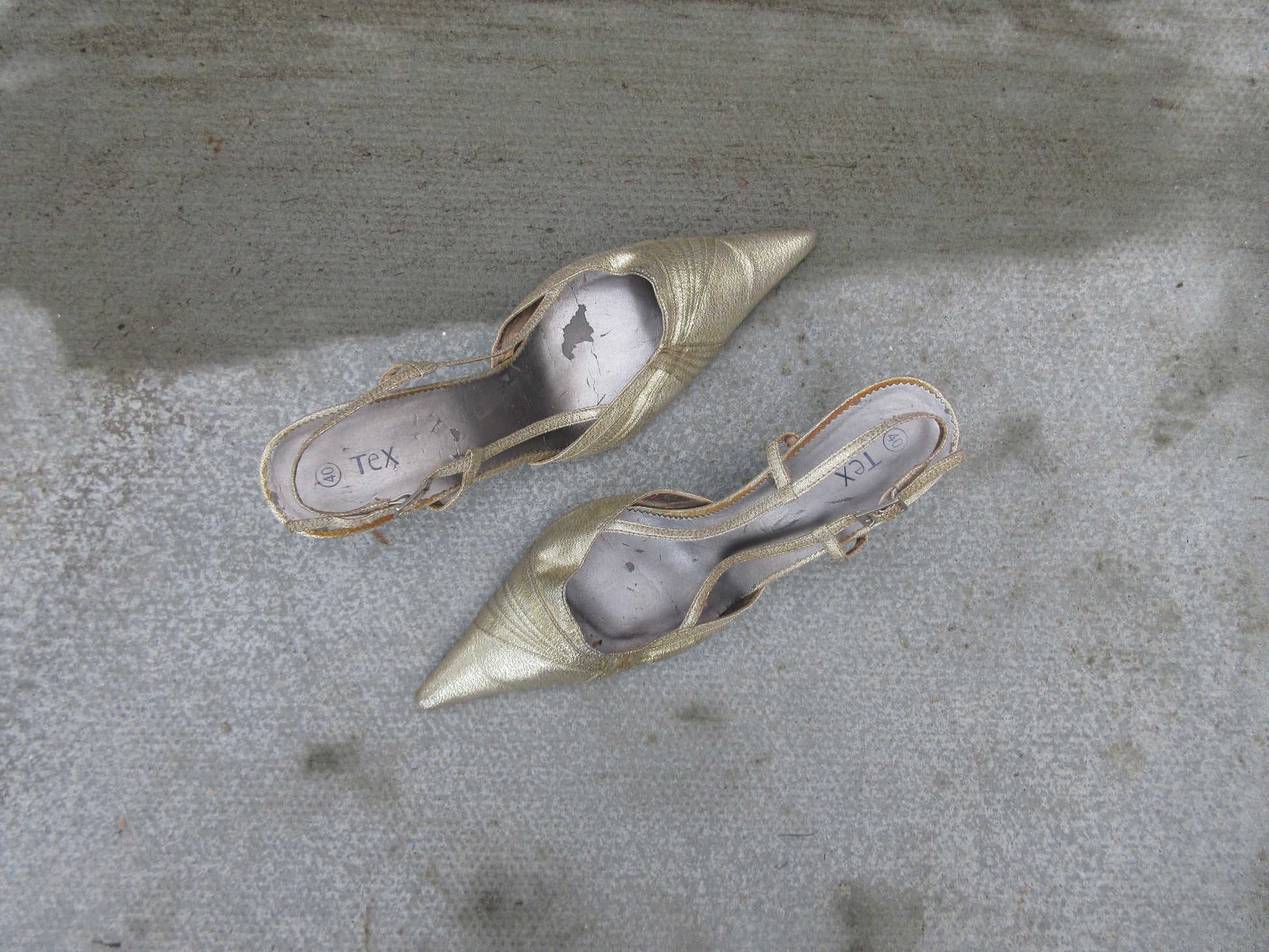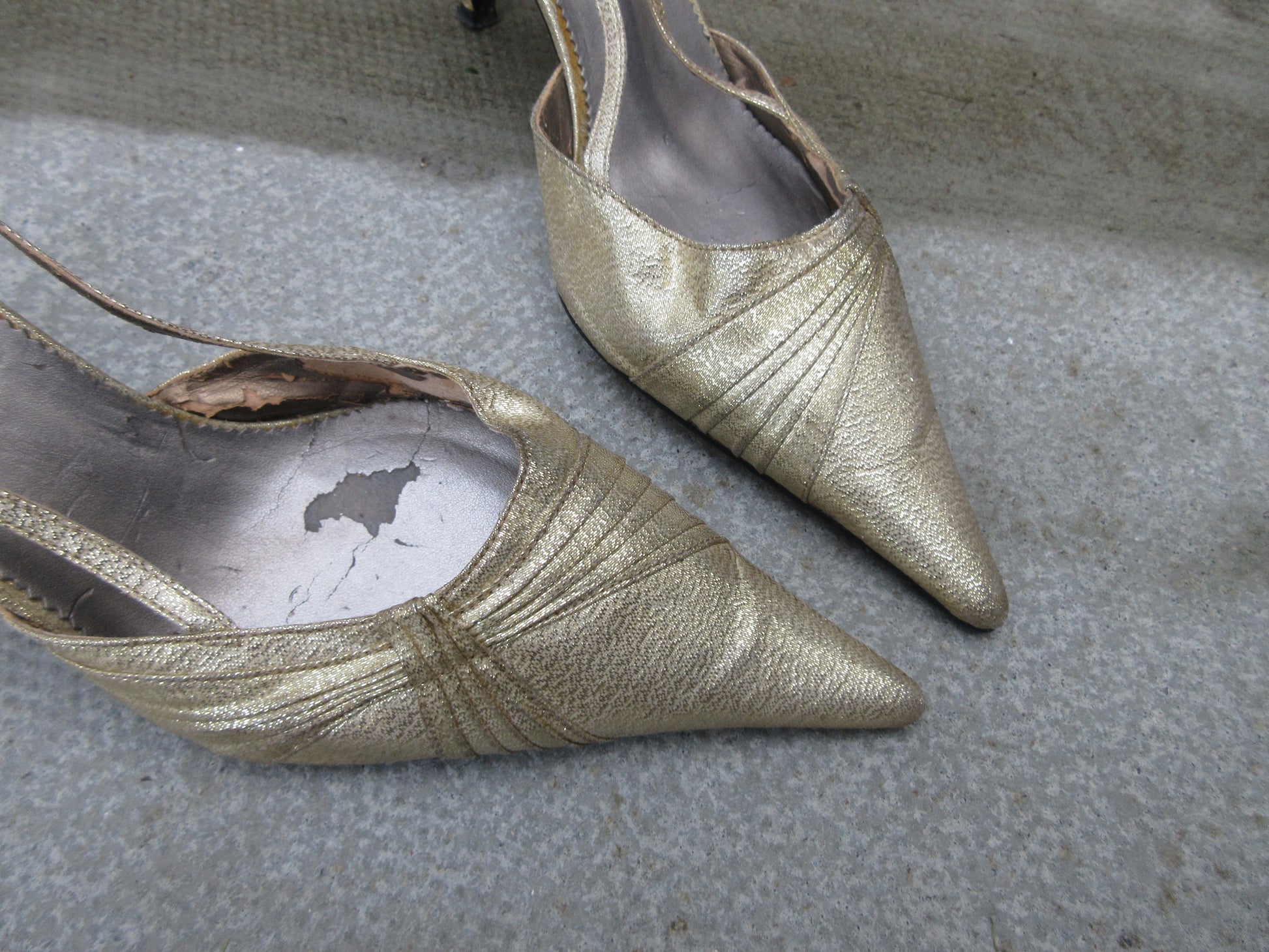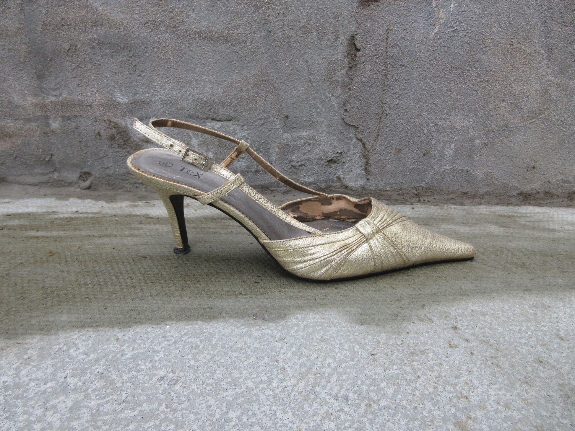 Gold shimmer glitter Christmas party pointed toe court heels slingback heels, front has pleated layer detail.