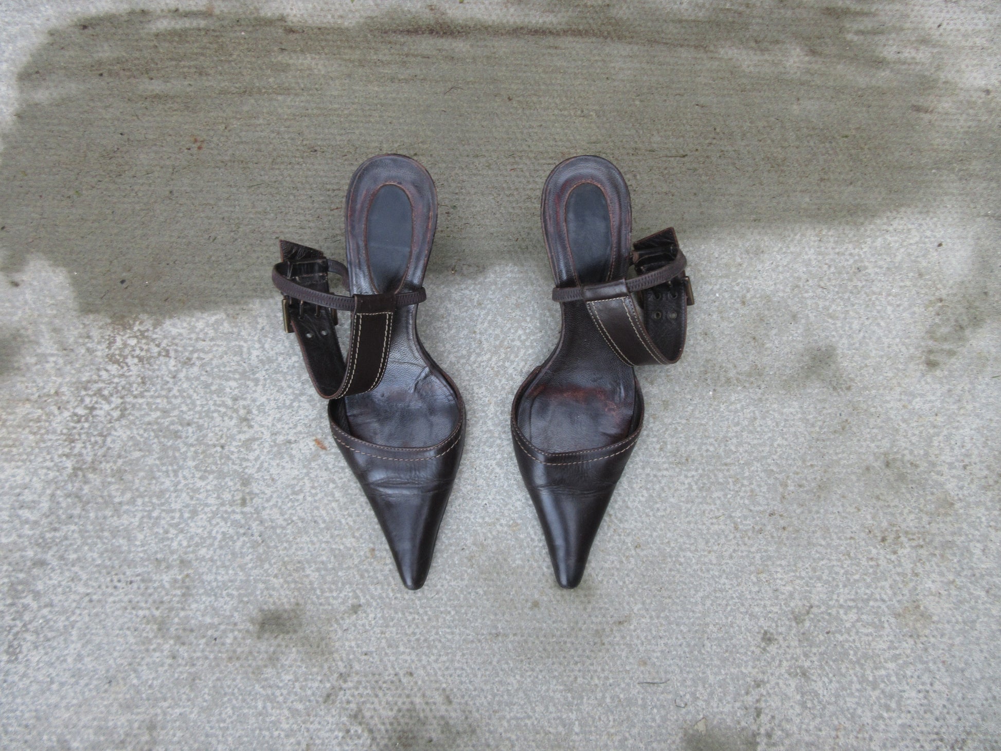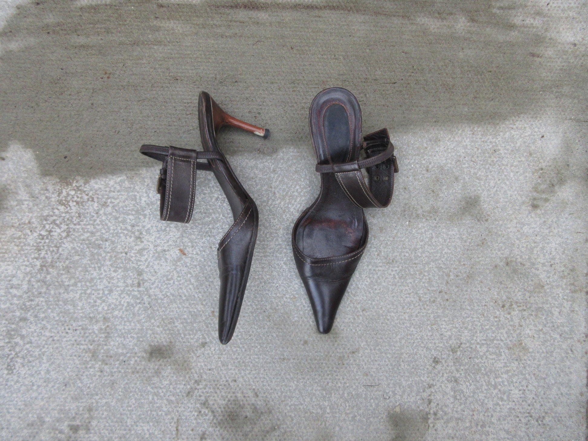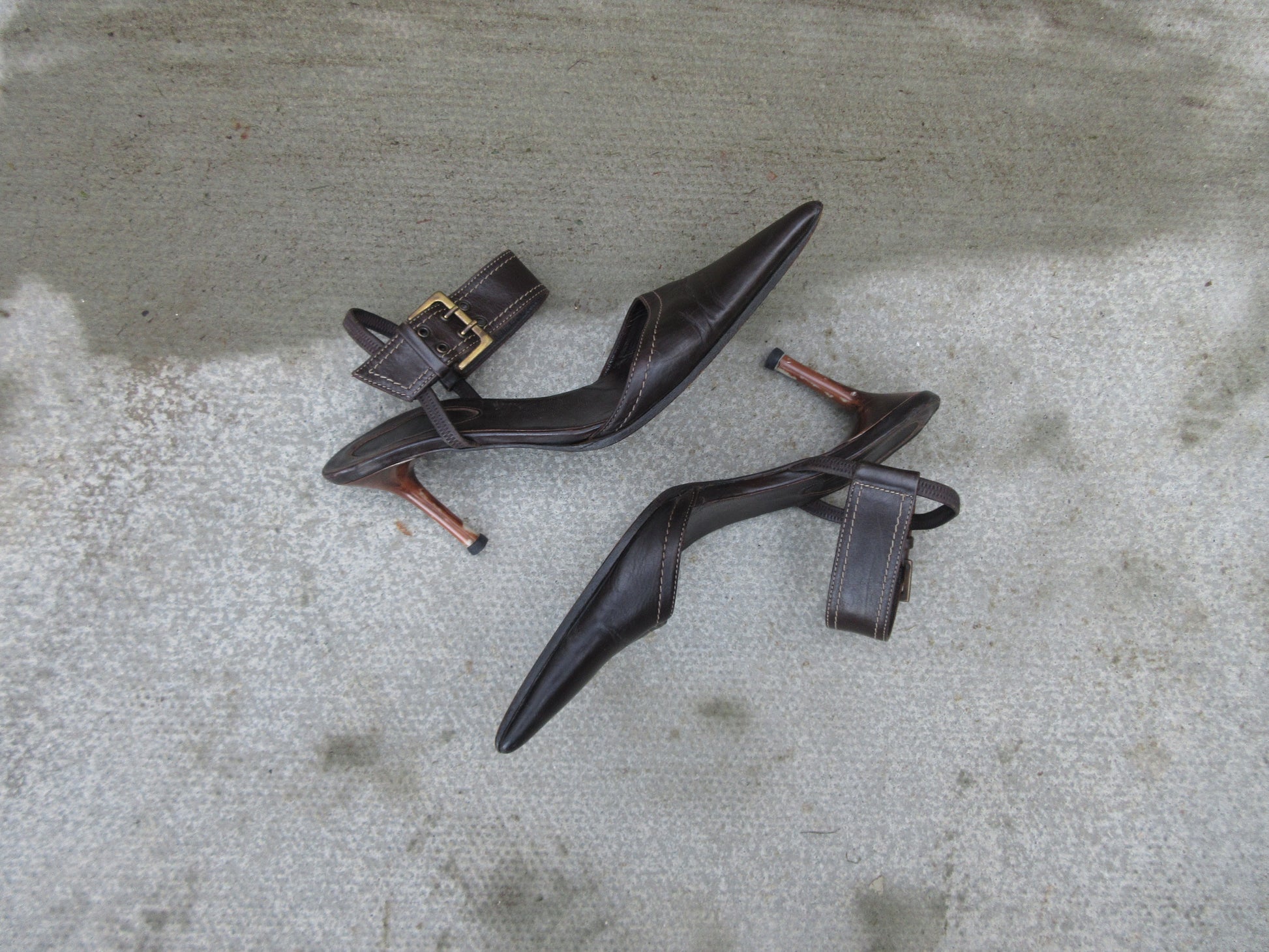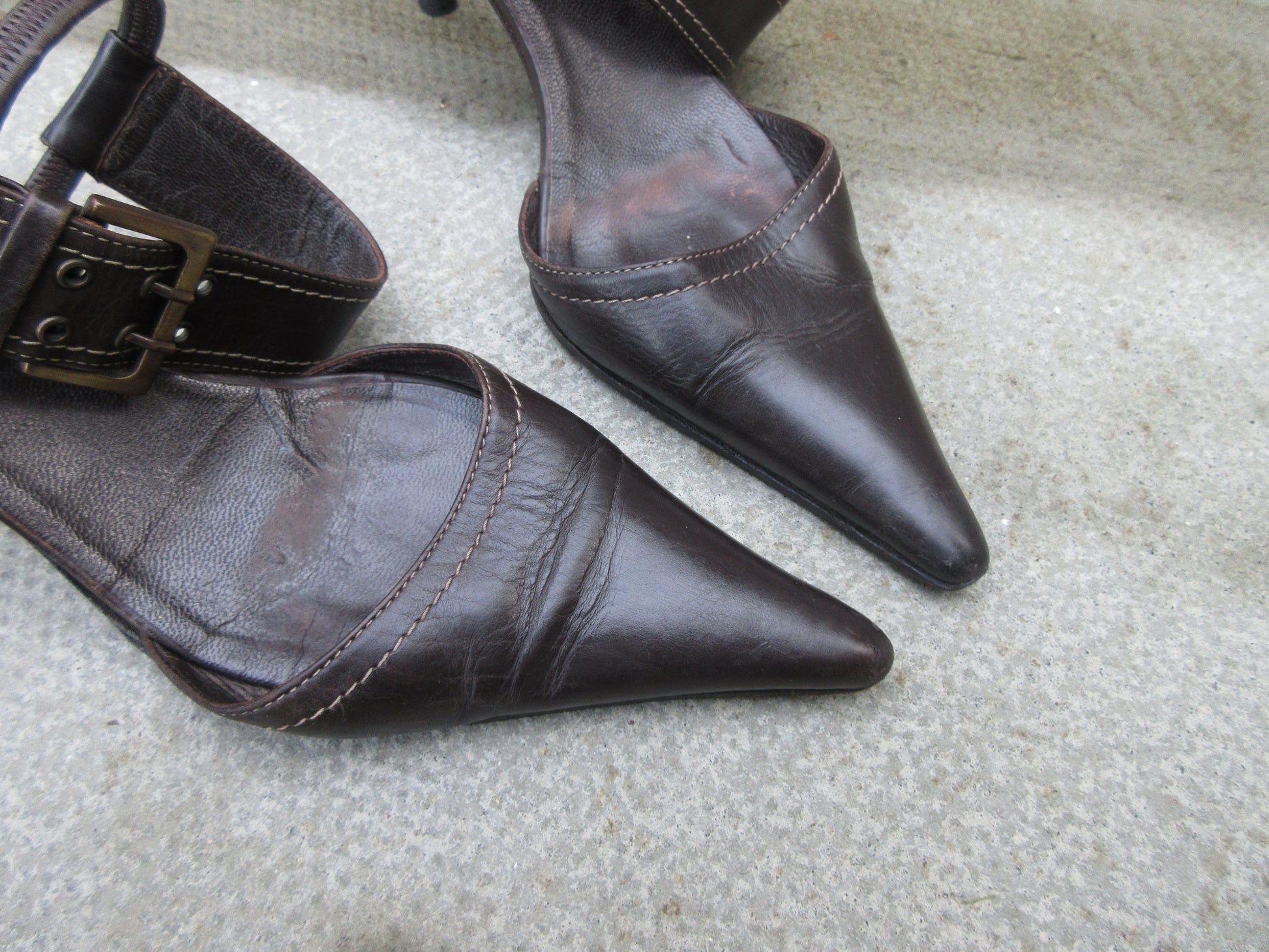 Genuine dark brown leather pointed toe heels with cream stitching detail, ankle strap has stretch and large brass metal buckle.