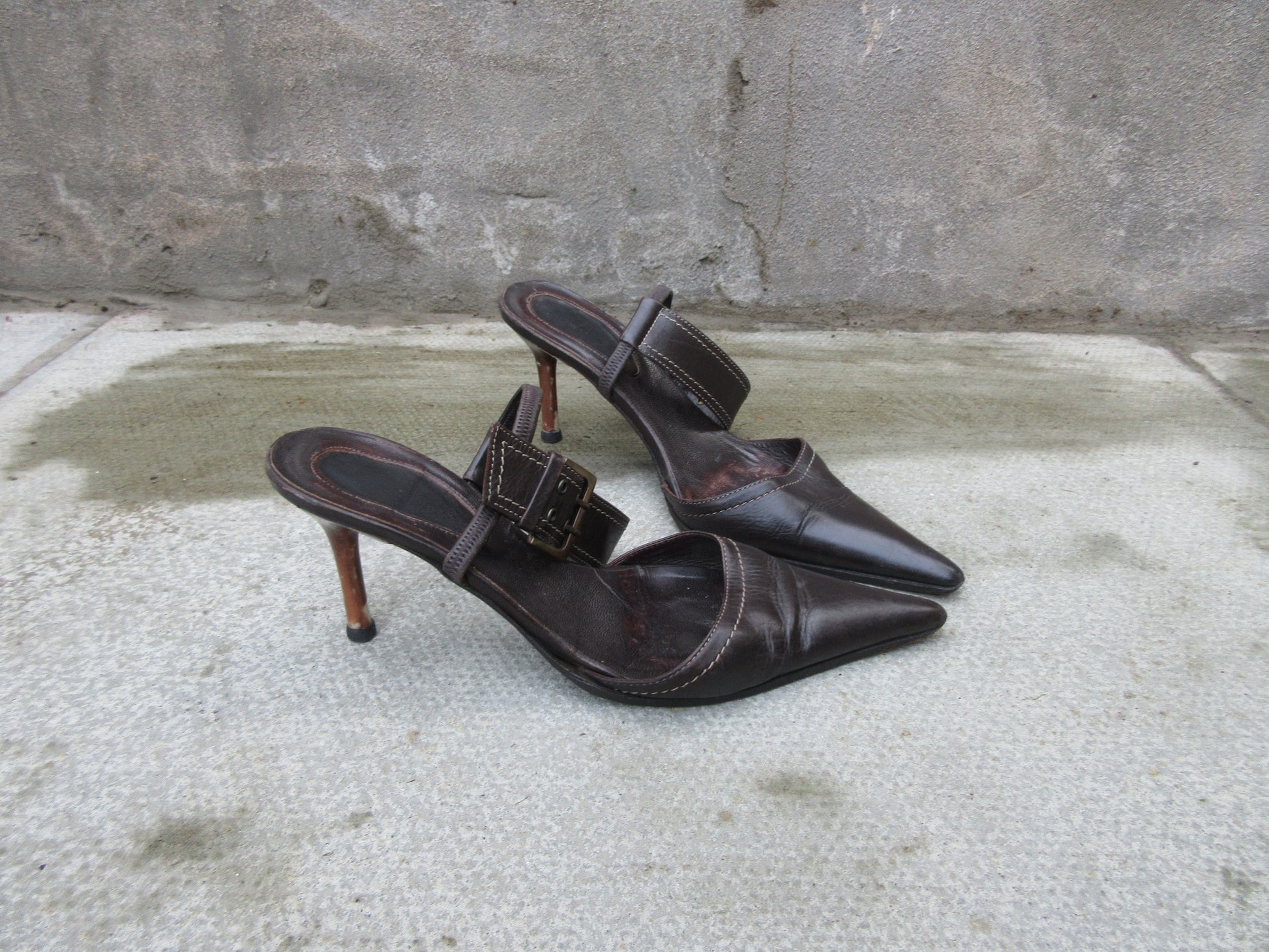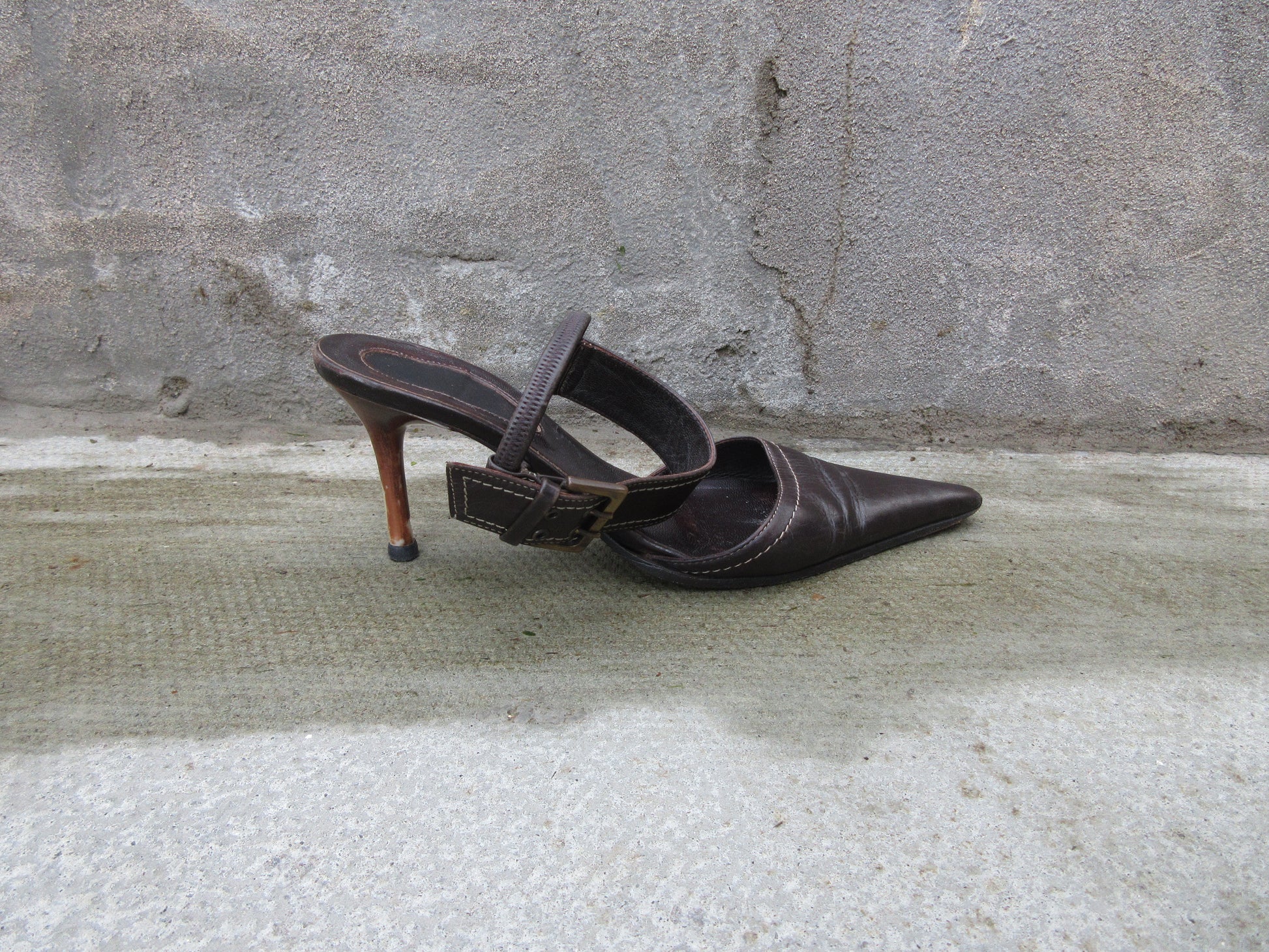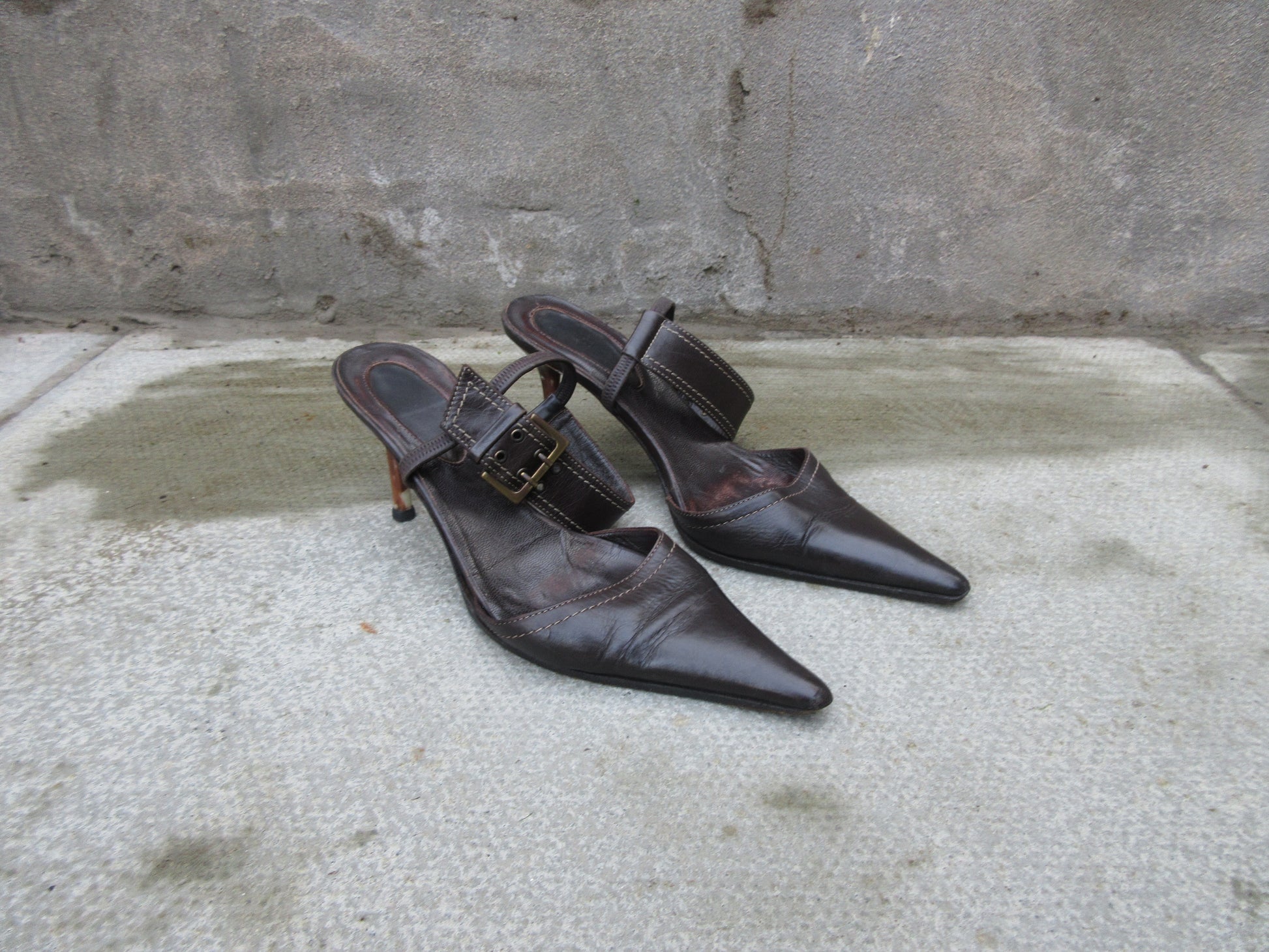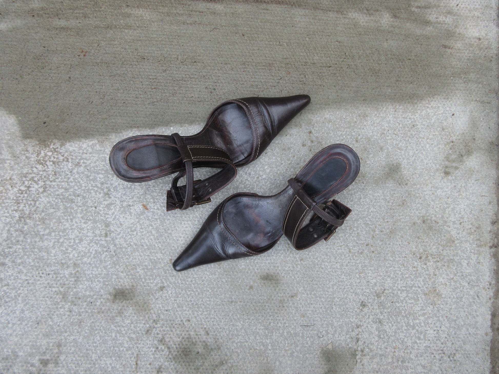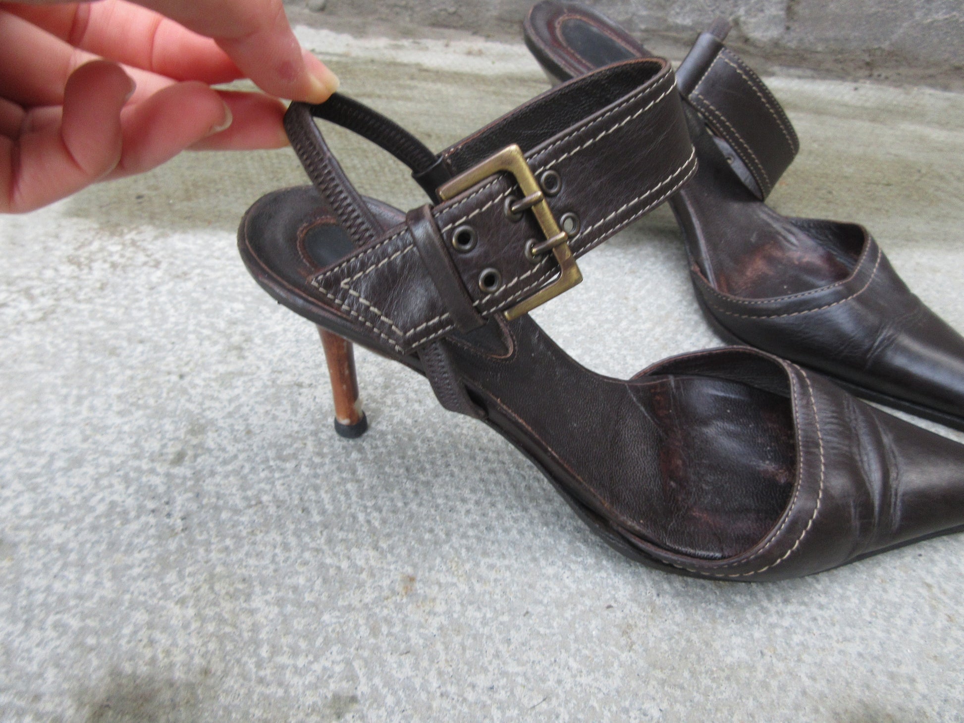 Genuine dark brown leather pointed toe heels with cream stitching detail, ankle strap has stretch and large brass metal buckle.