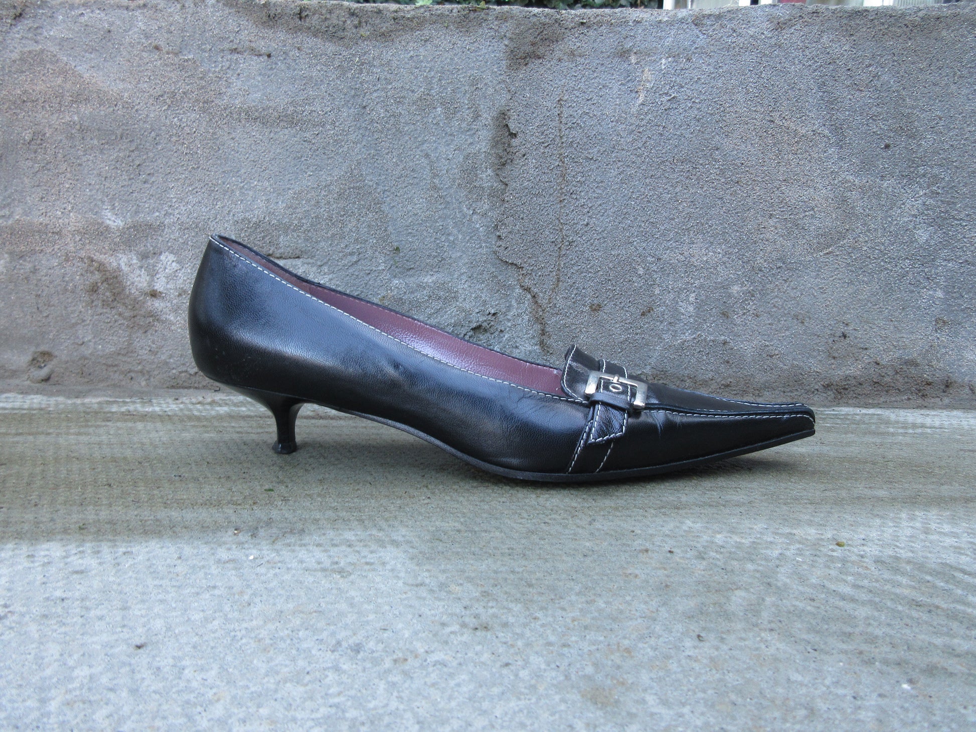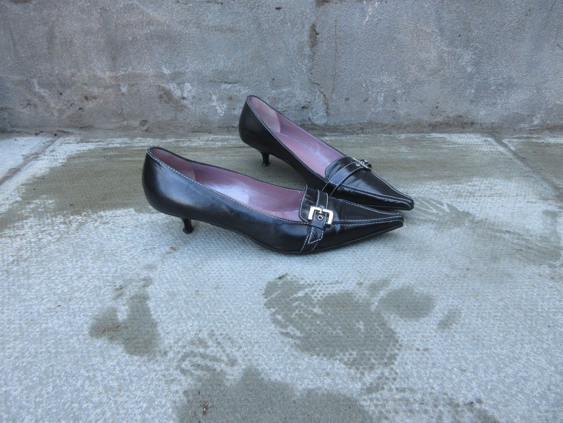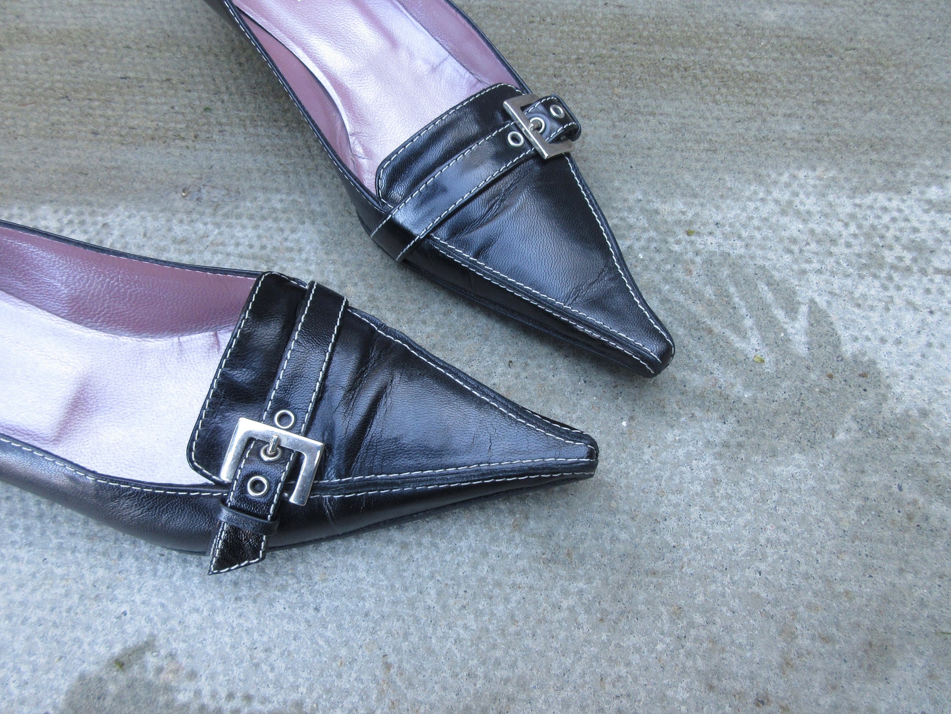 Genuine leather black pointed toe loafer heels with white stitching with front buckle detail.
