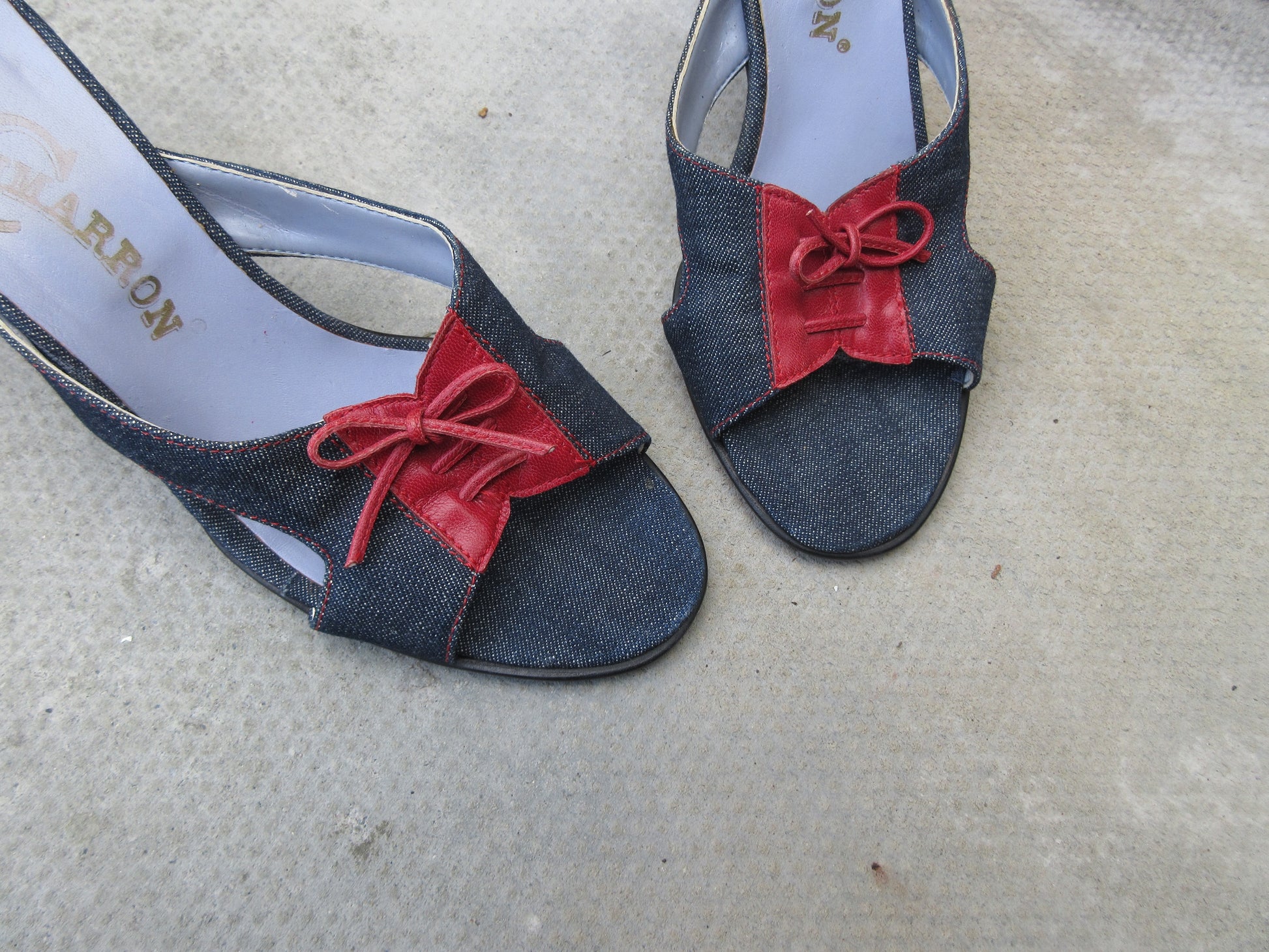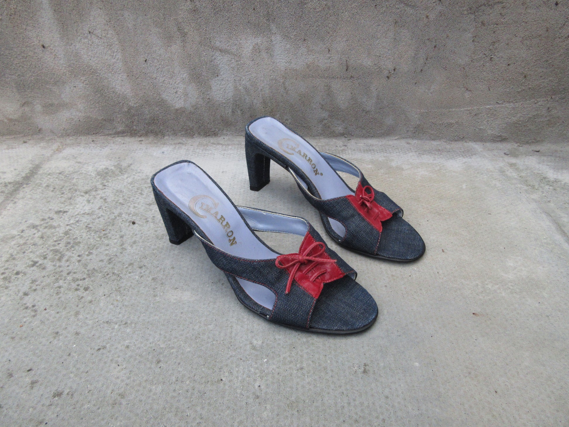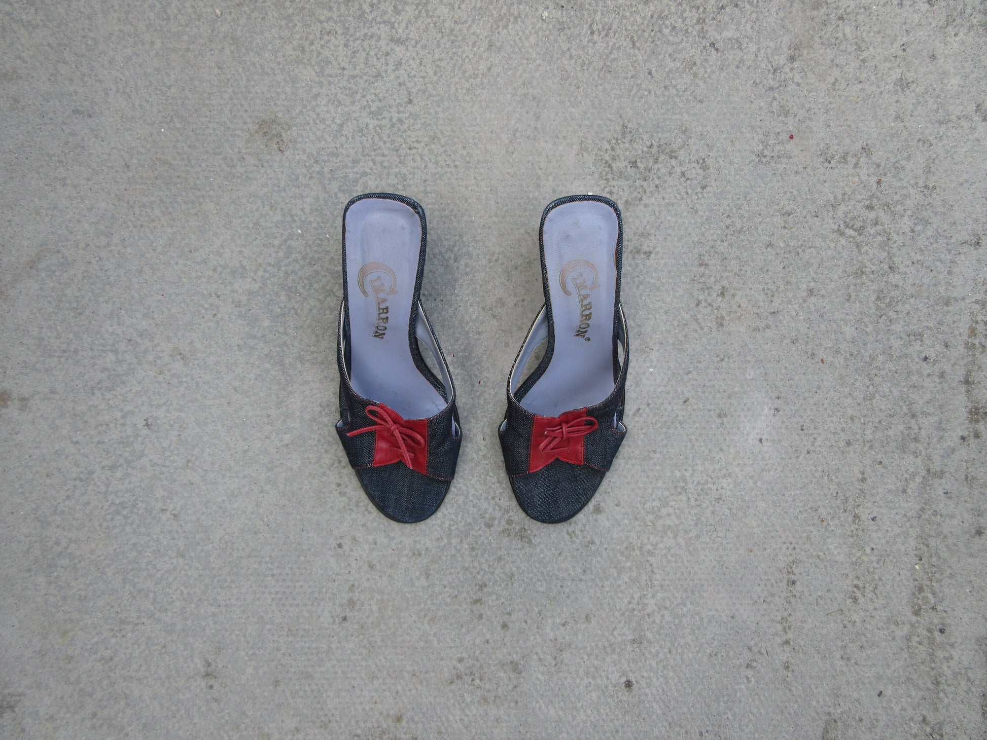 Dark wash denim mules with cut outs and a red leather lace up accent across the front.