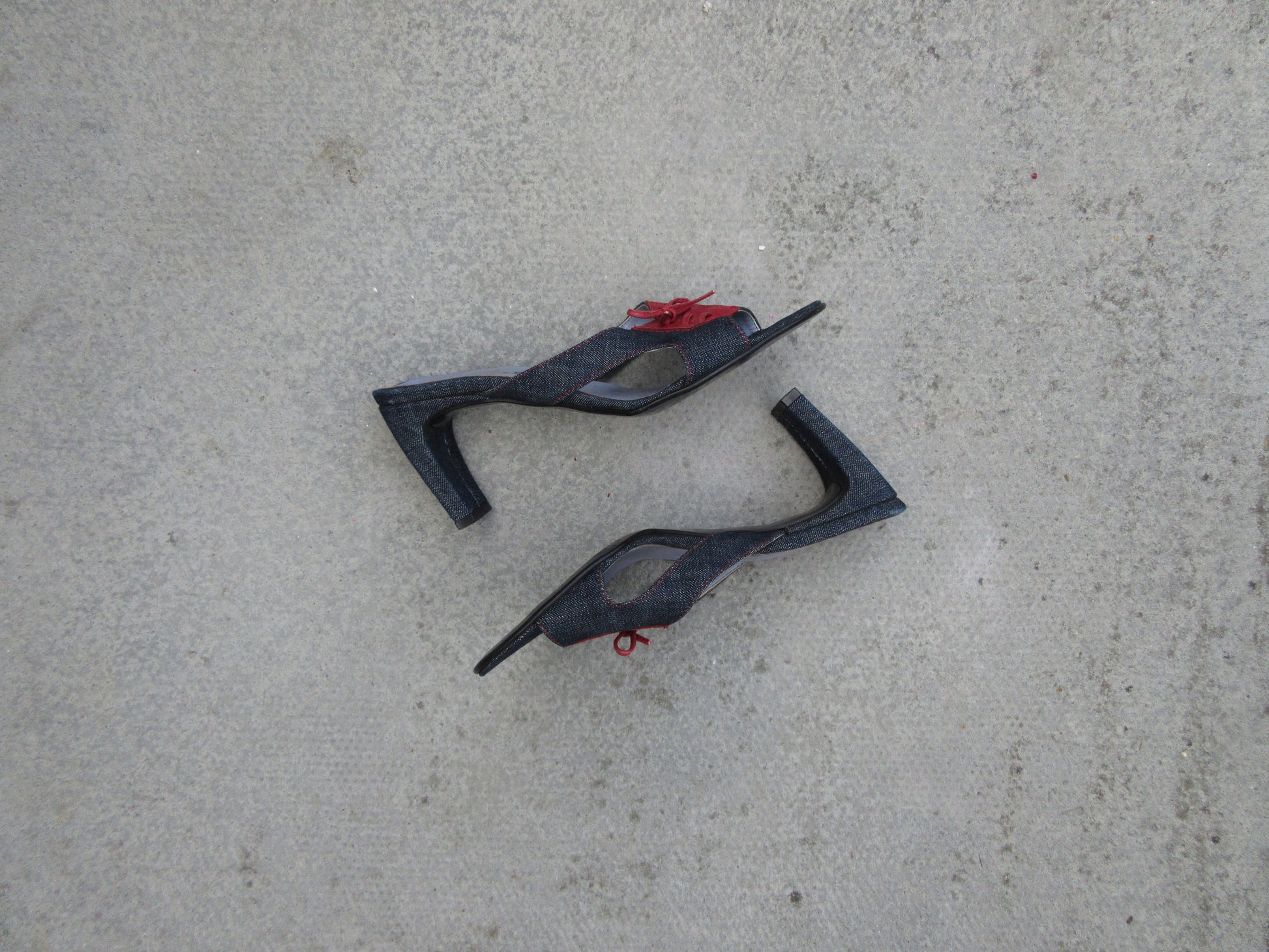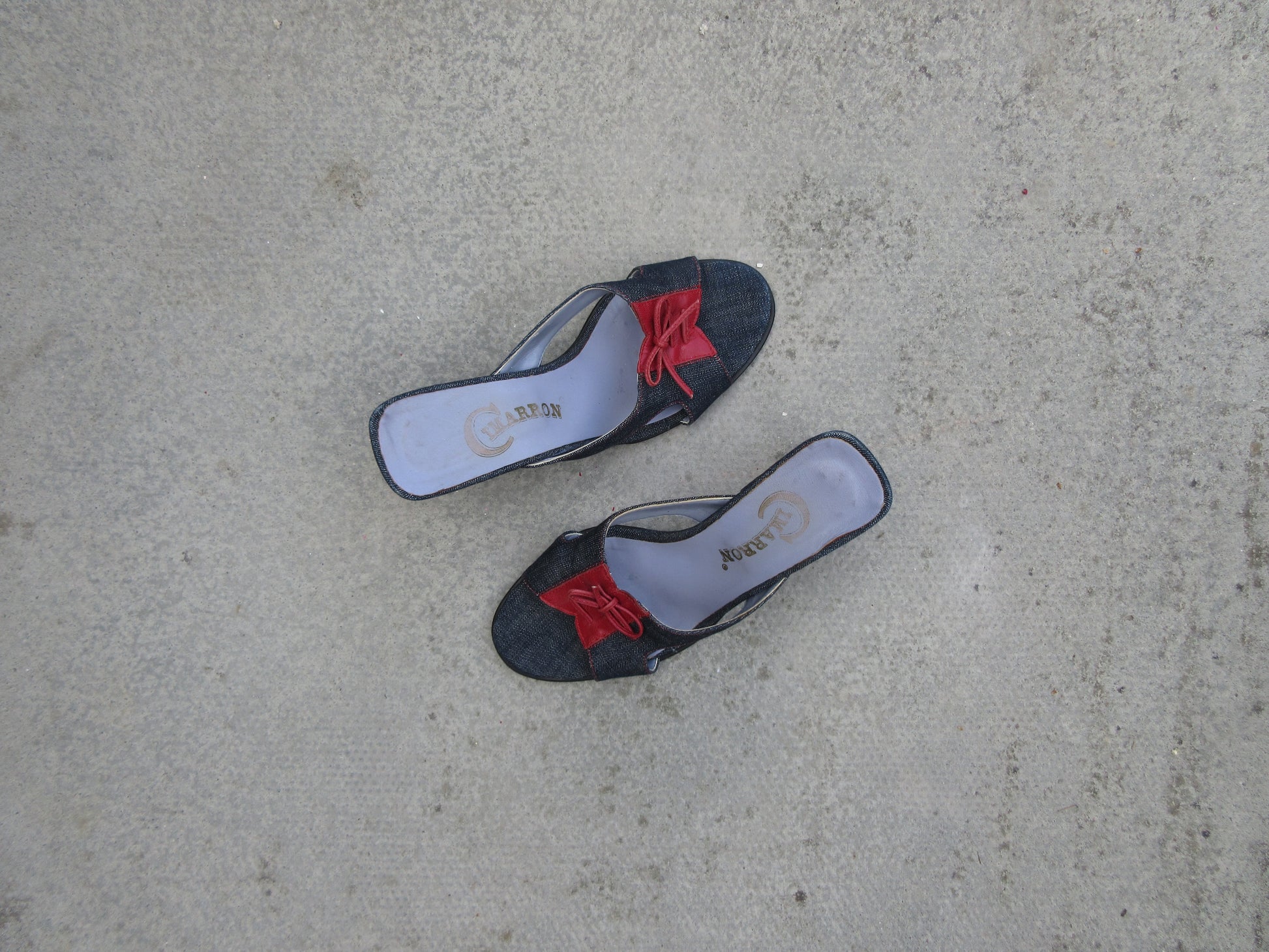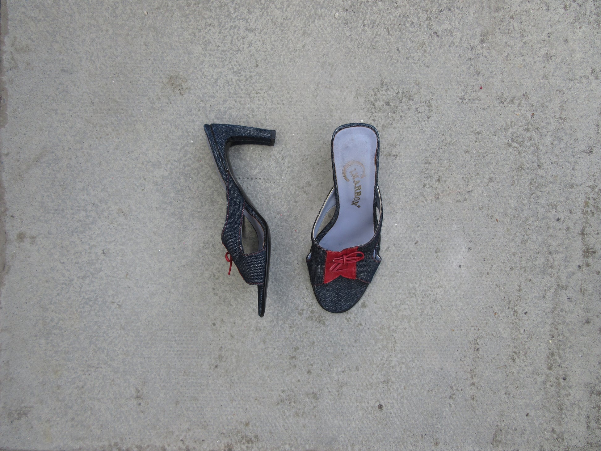 Dark wash denim mules with cut outs and a red leather lace up accent across the front.