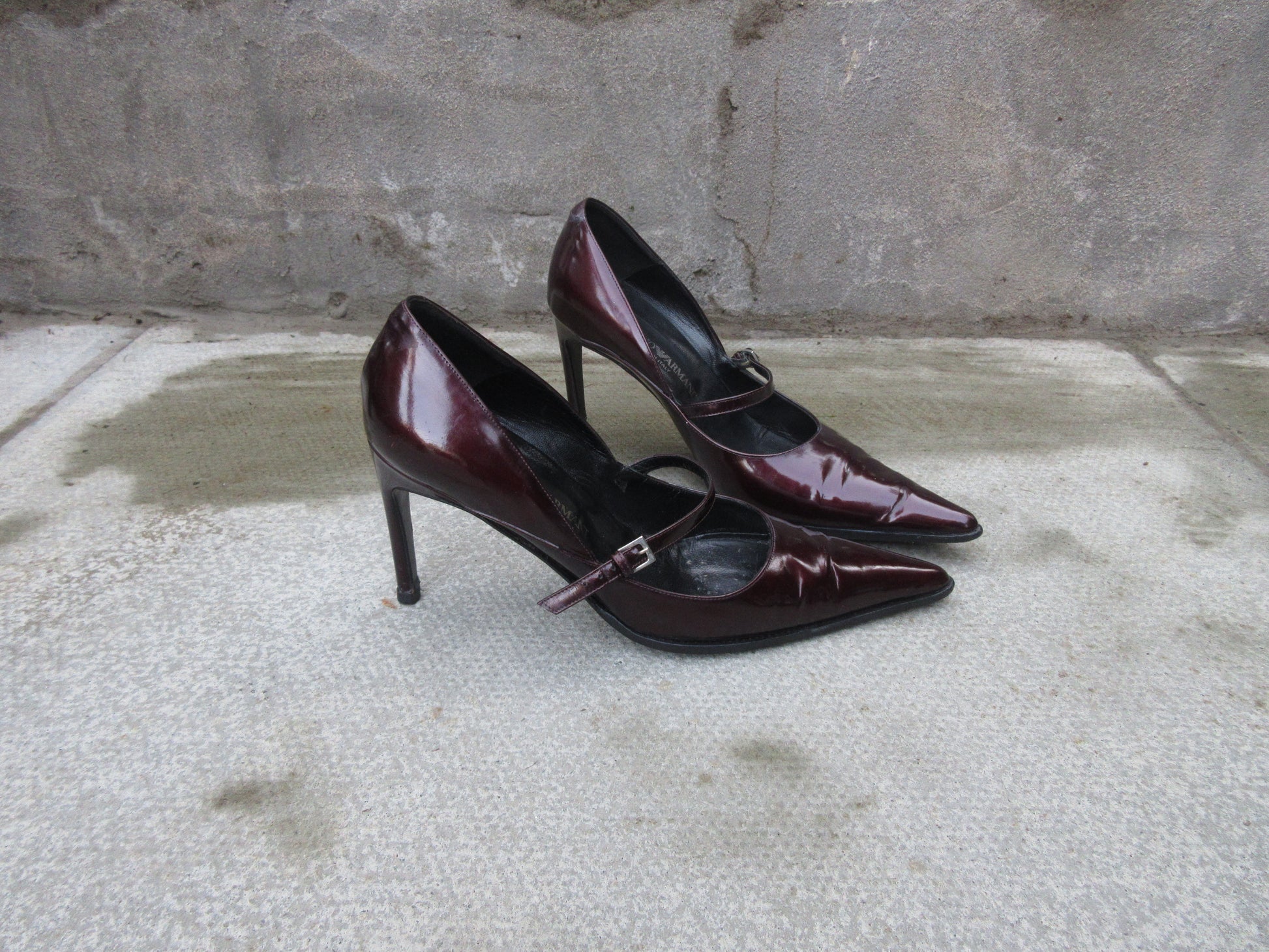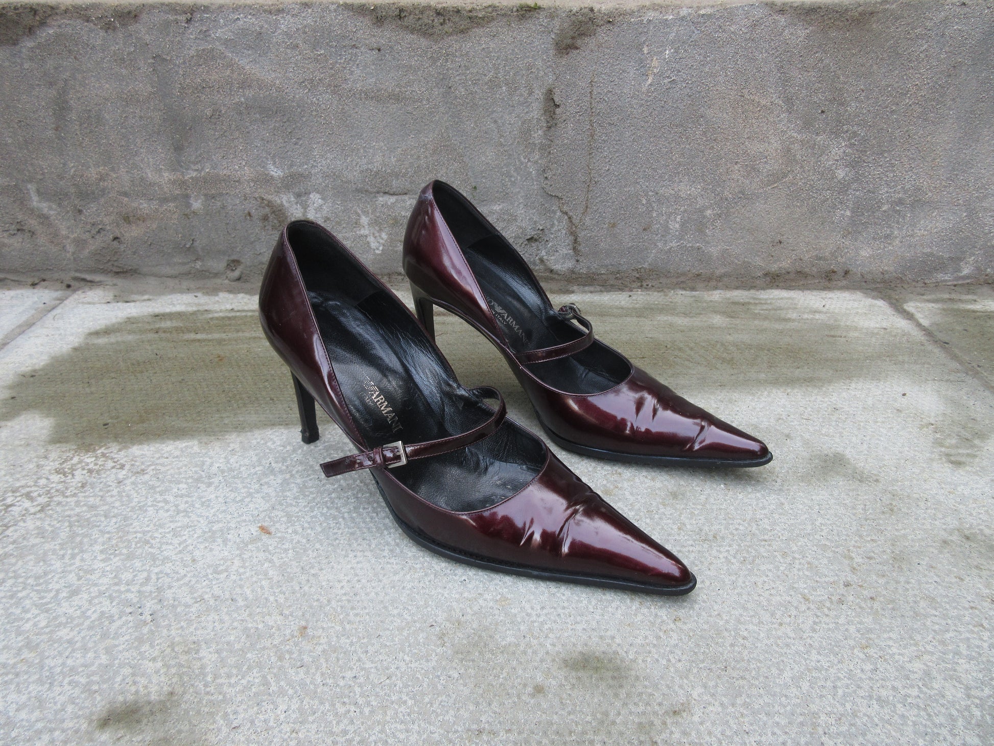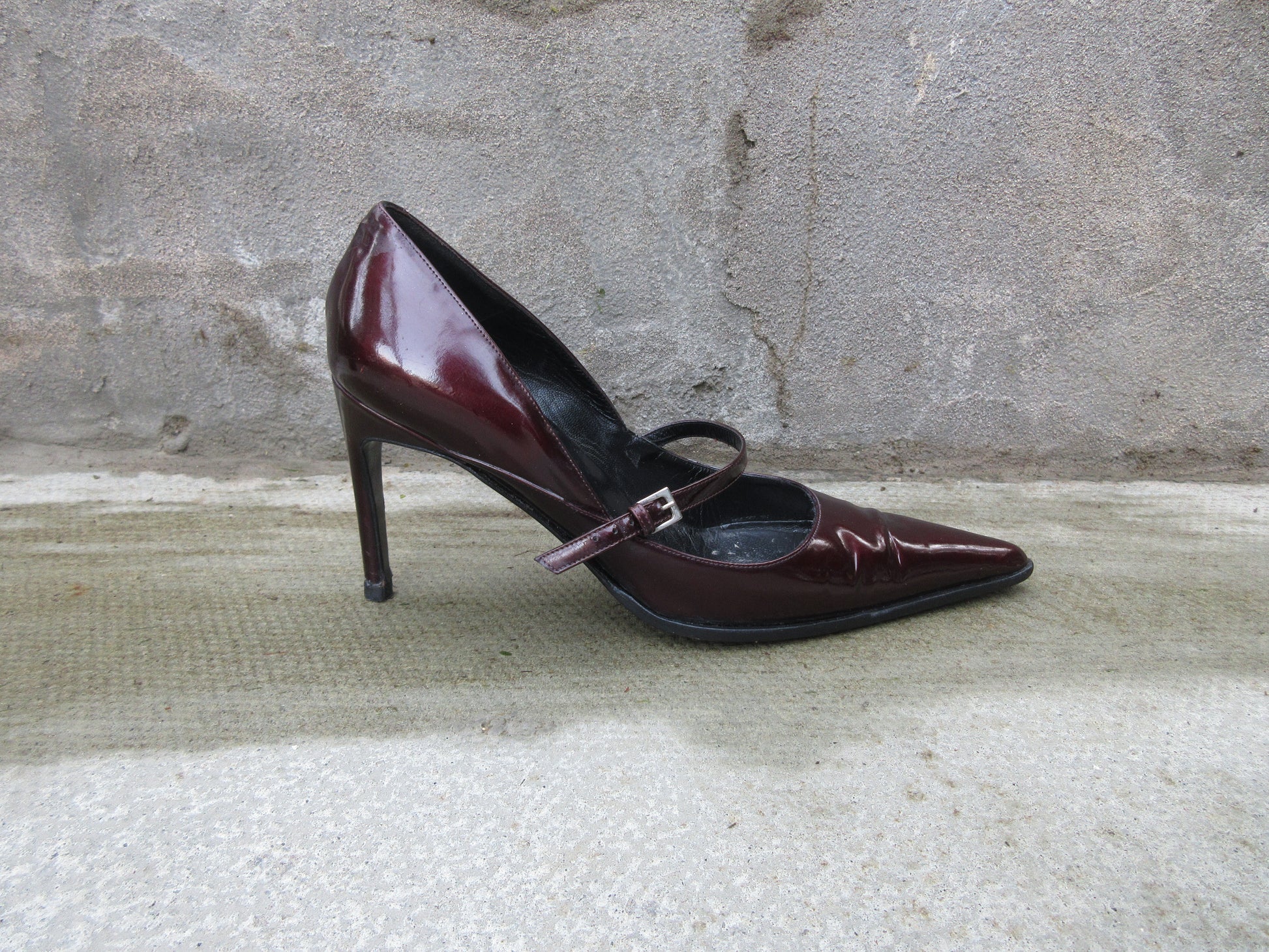 Genuine patent shiny leather in an aubergine purple colour, pointed toe court heels with Mary Jane buckle strap.