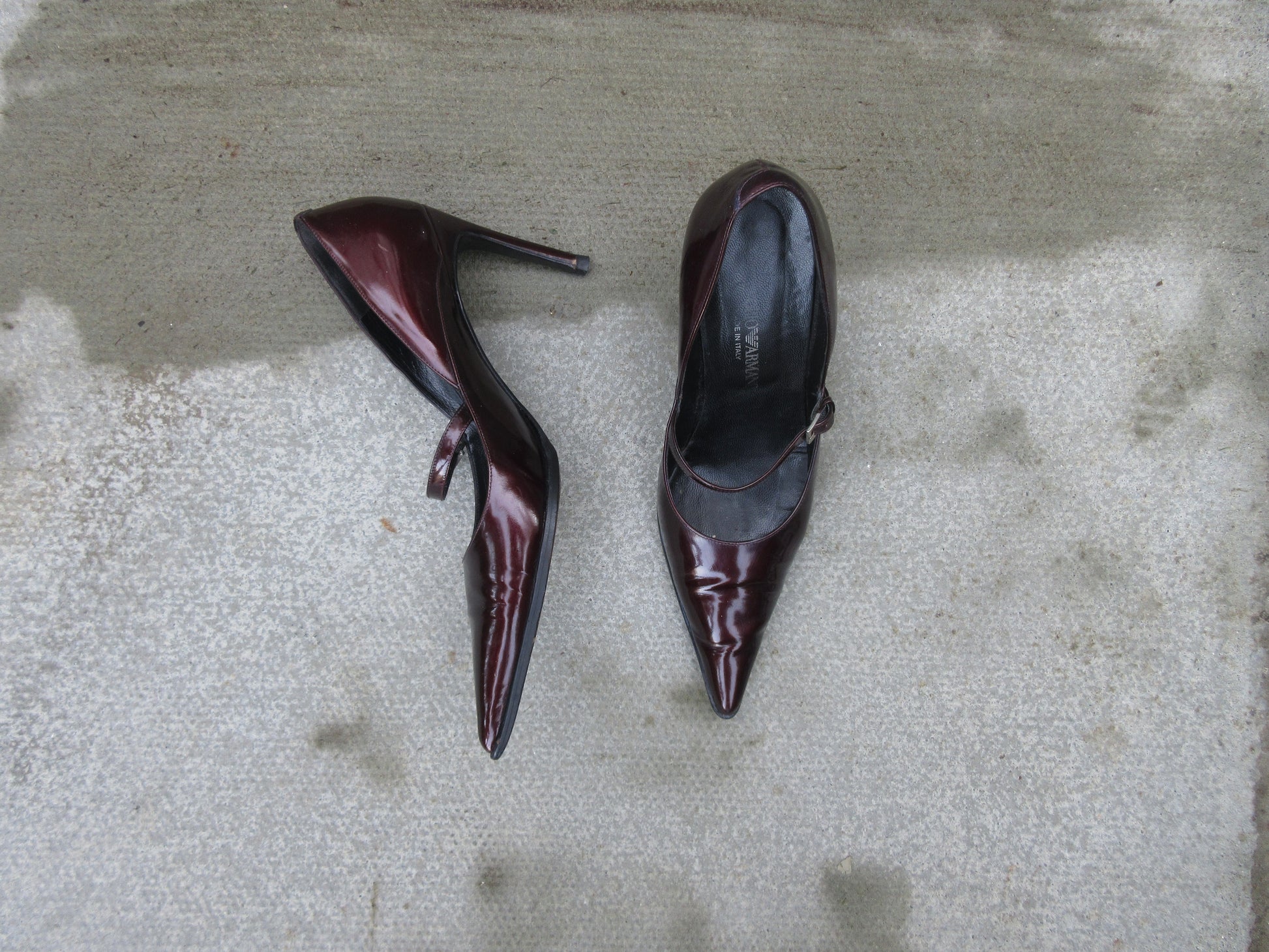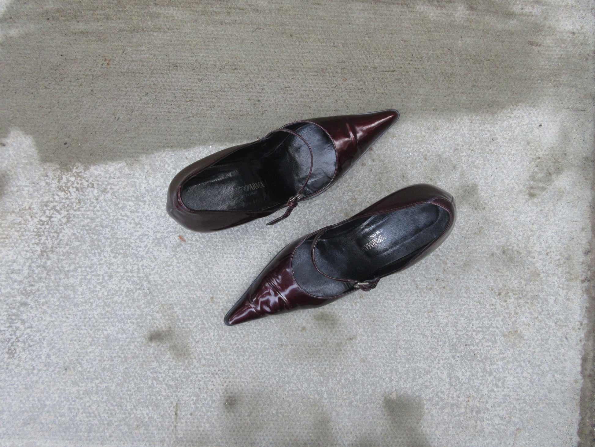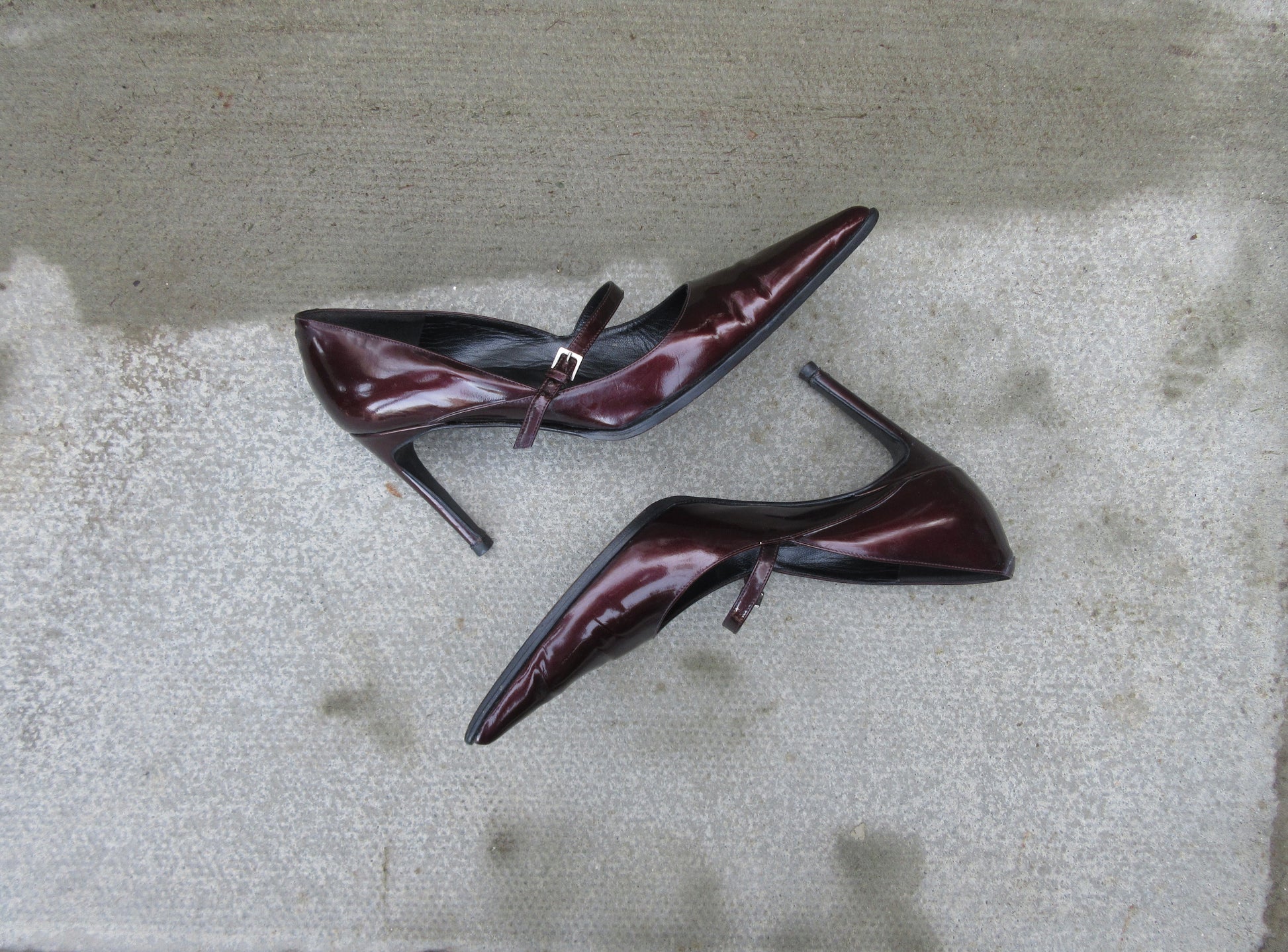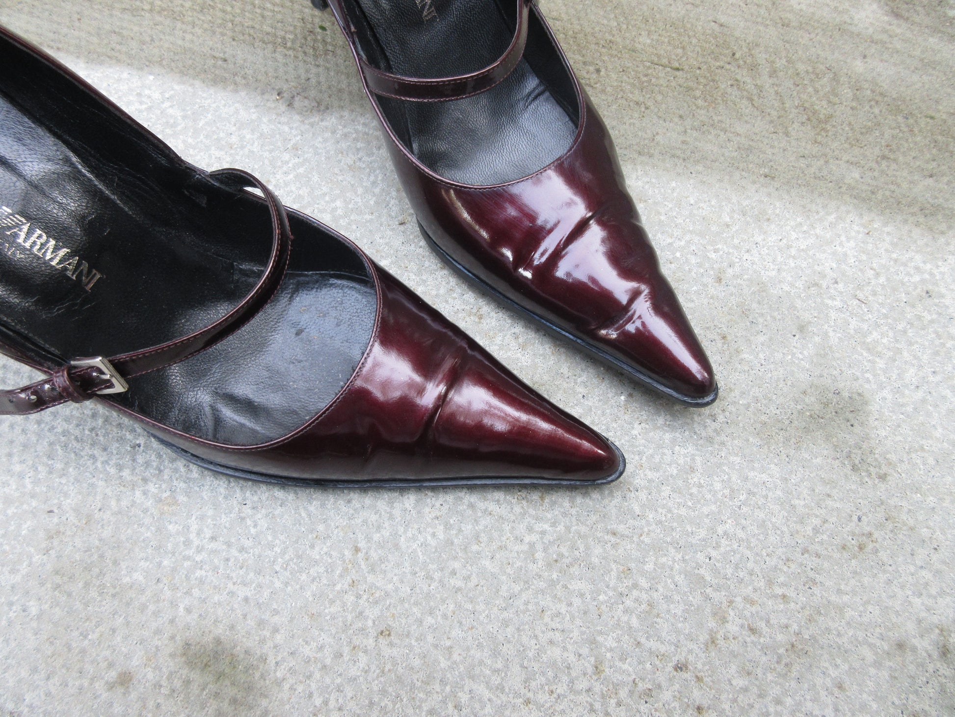 Genuine patent shiny leather in an aubergine purple colour, pointed toe court heels with Mary Jane buckle strap.
