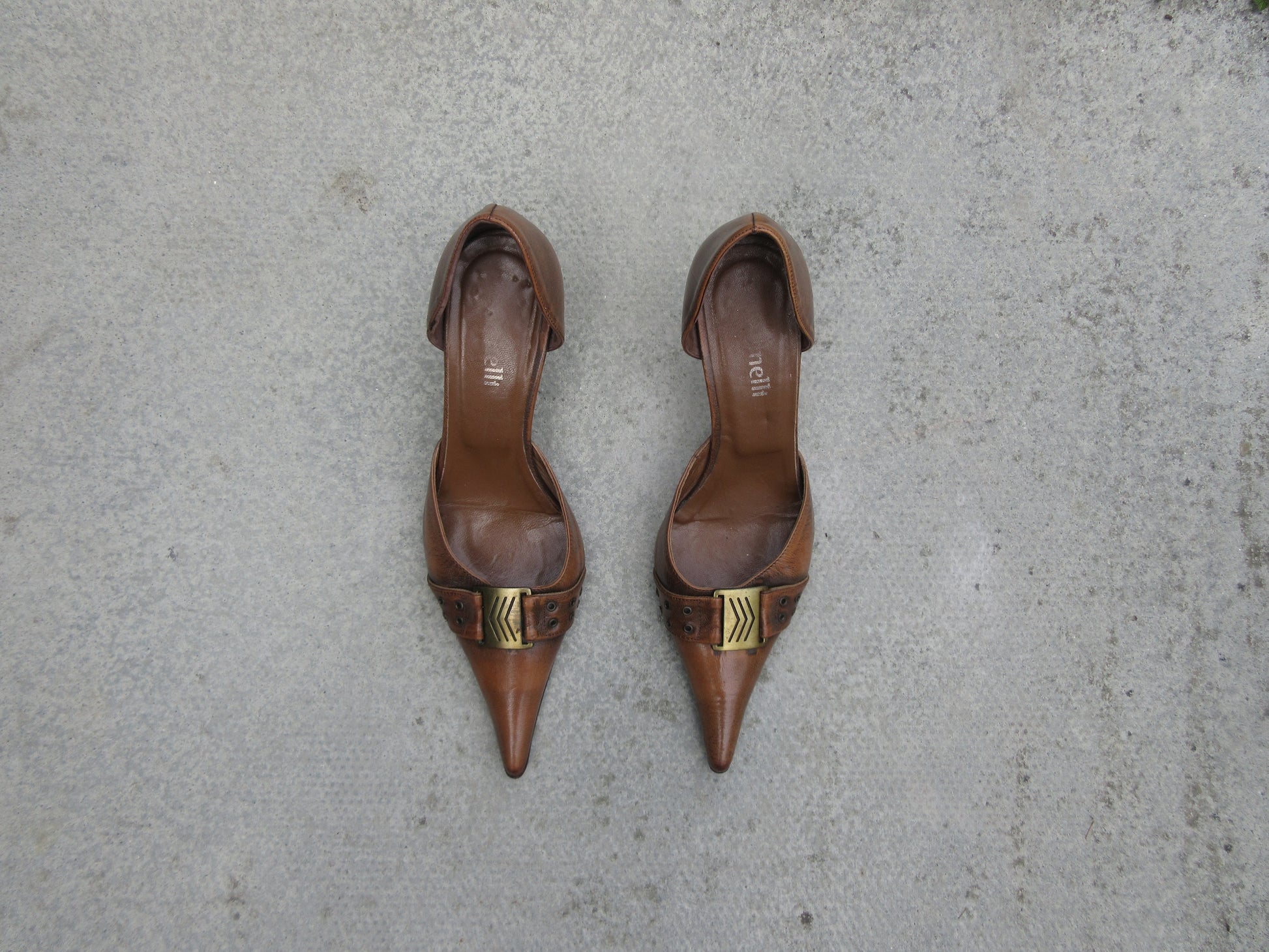 Genuine leather dark tan brown pointed heels with front gold buckle detail