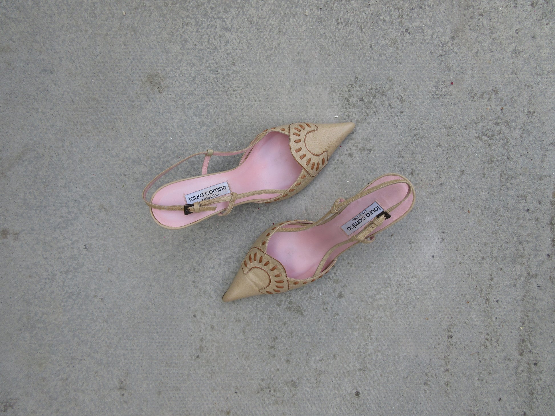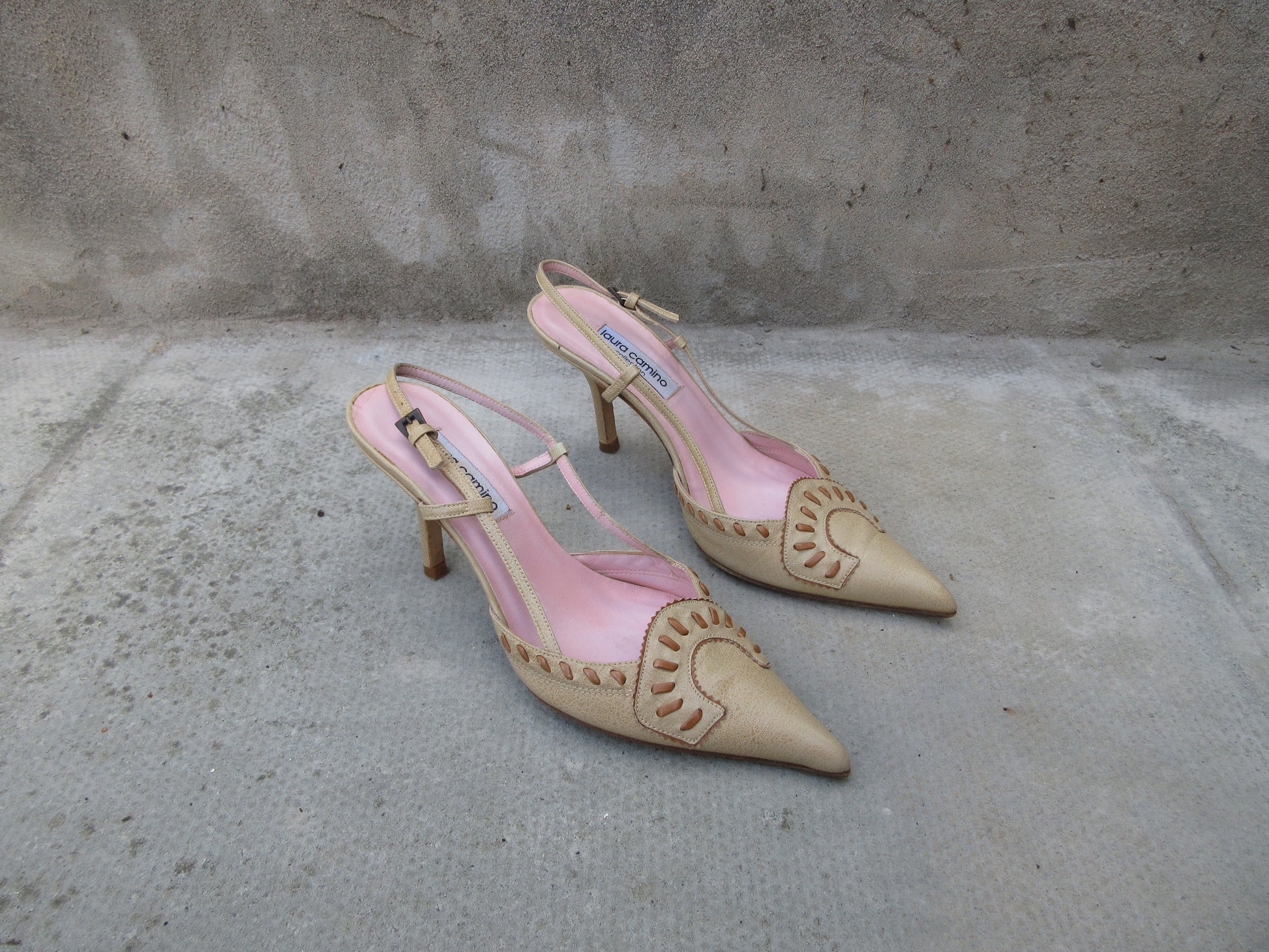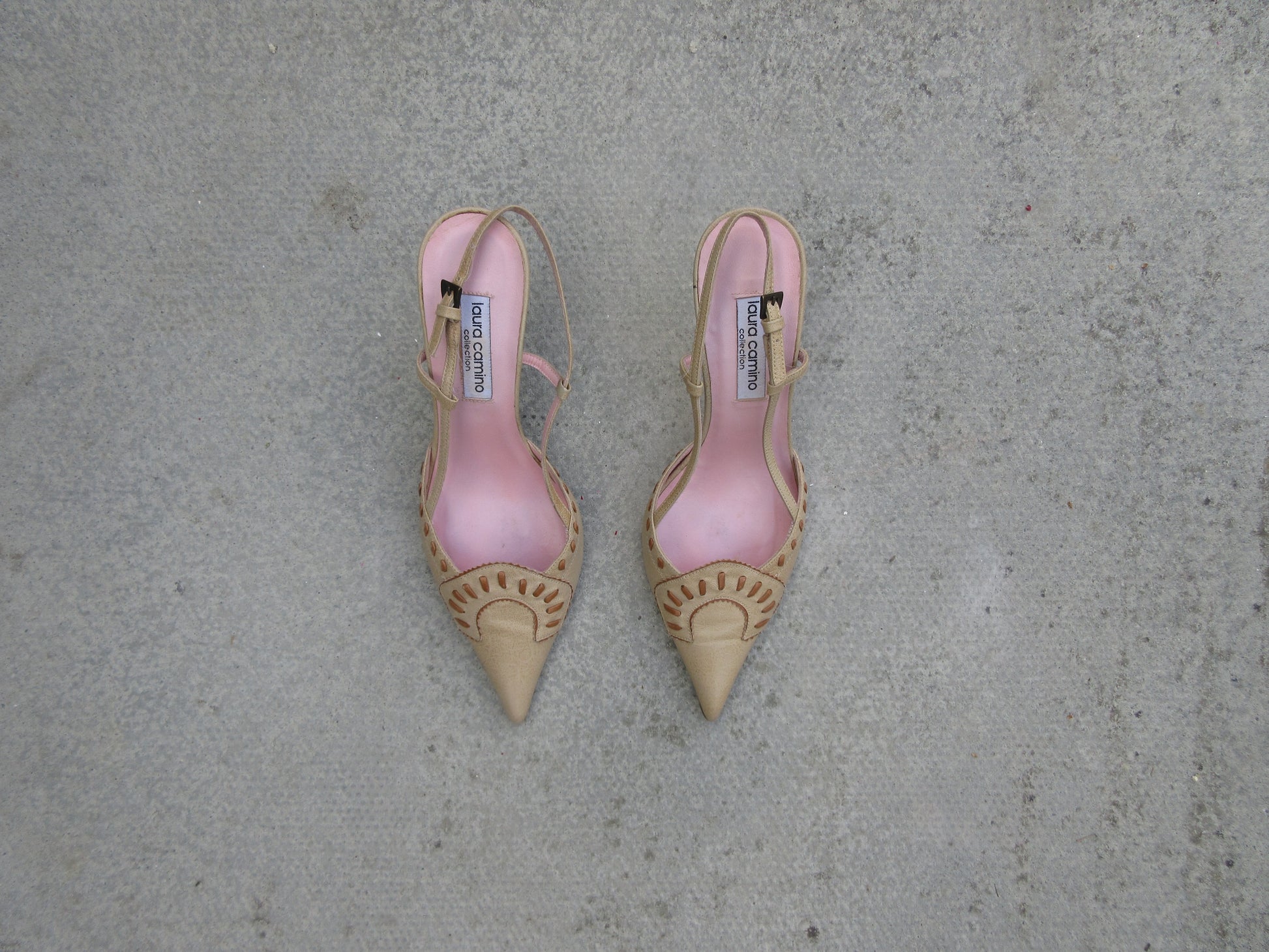 Genuine leather cream and neutral tones pointed slingback heels with tan brown leather trim and stitching detail.