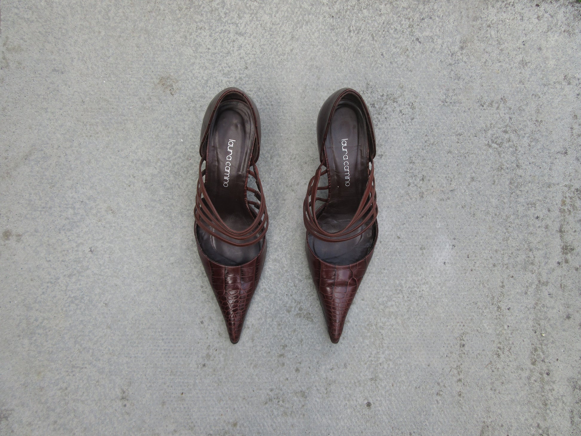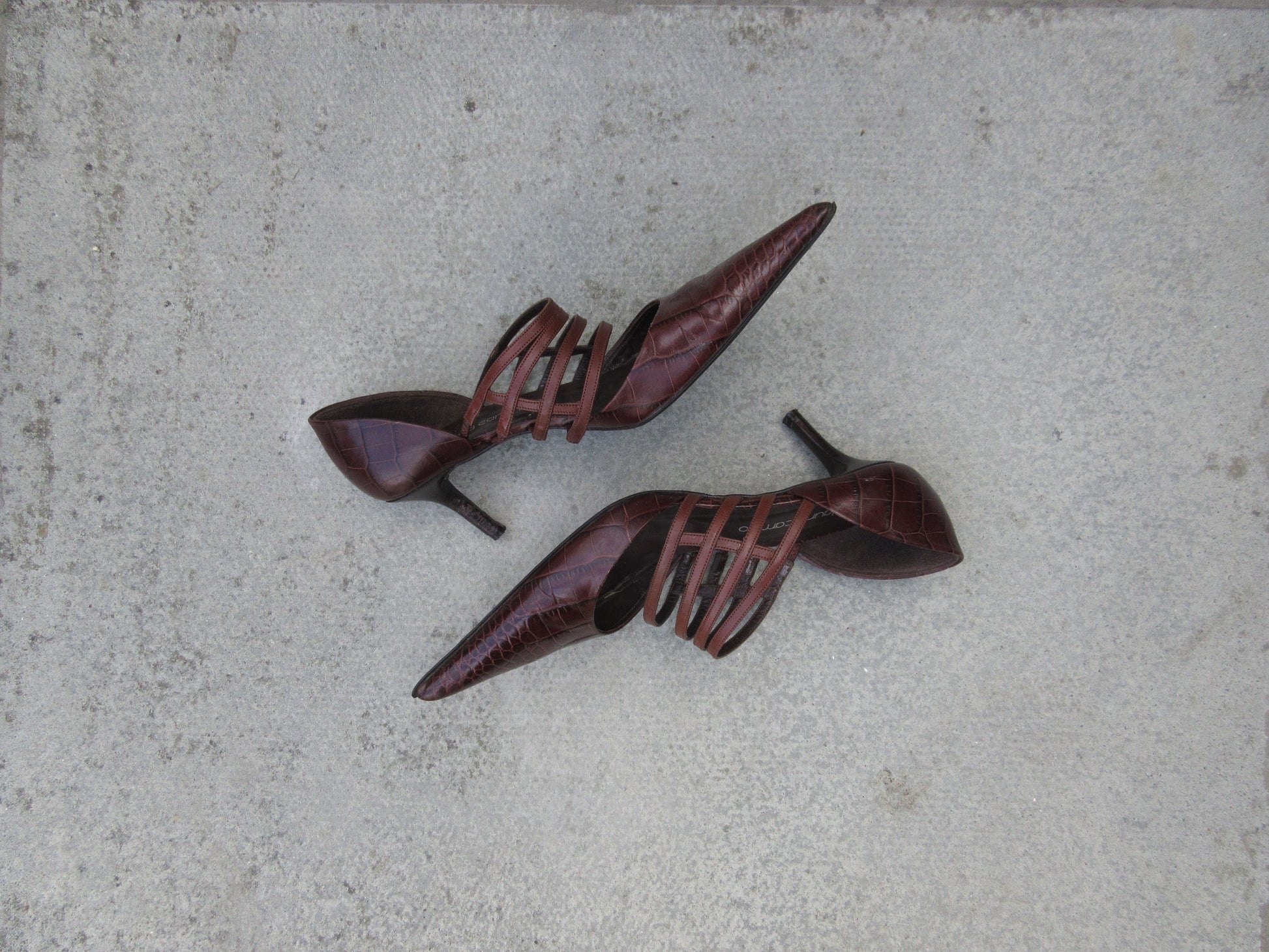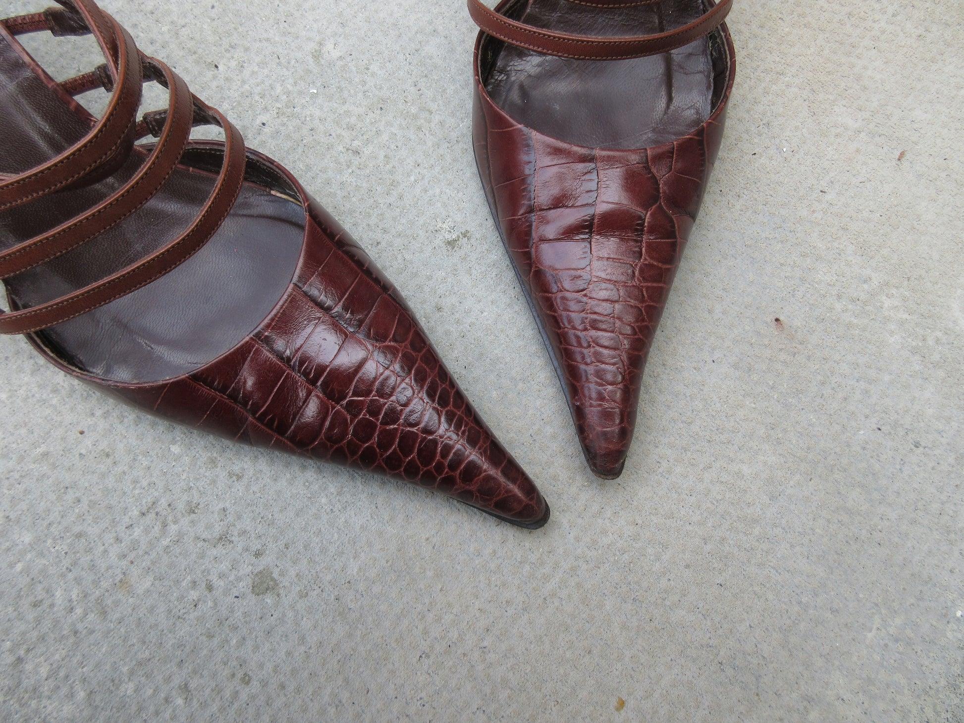 Genuine leather brown leather crocodile effect pointed toe heels with strap design across the front.