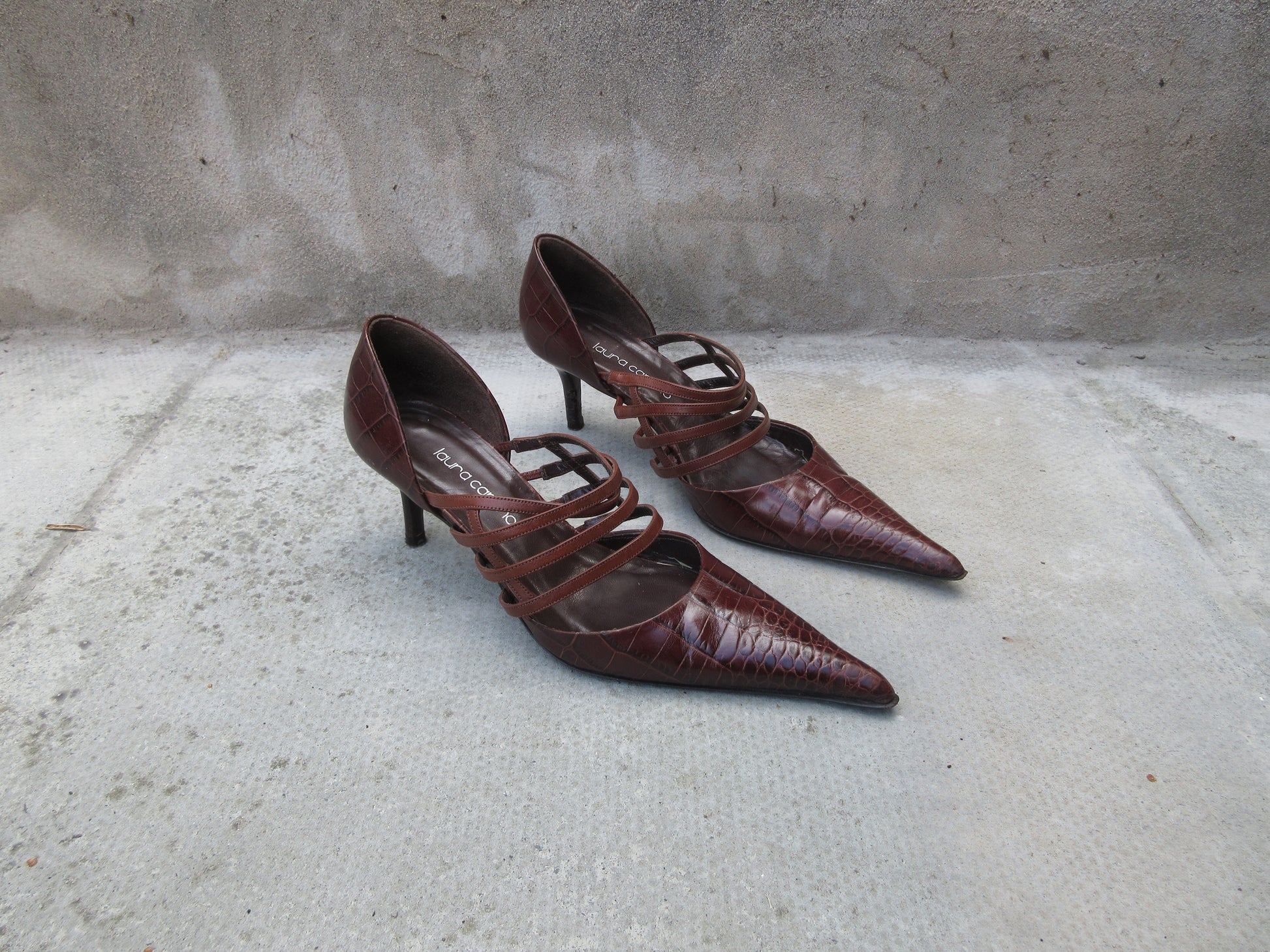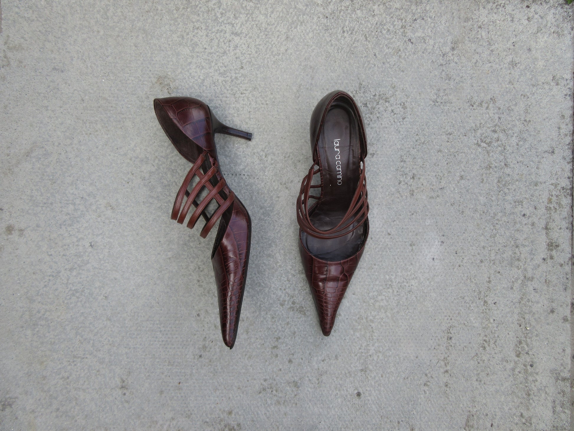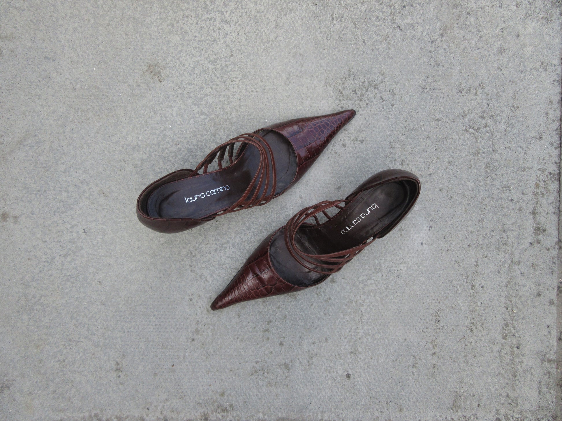 Genuine leather brown leather crocodile effect pointed toe heels with strap design across the front.