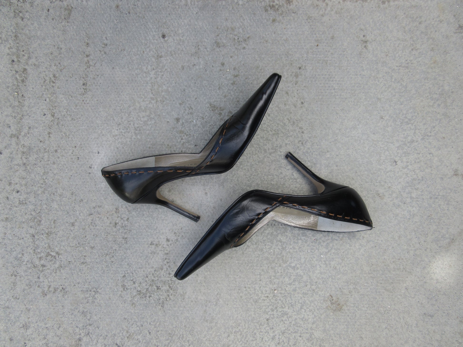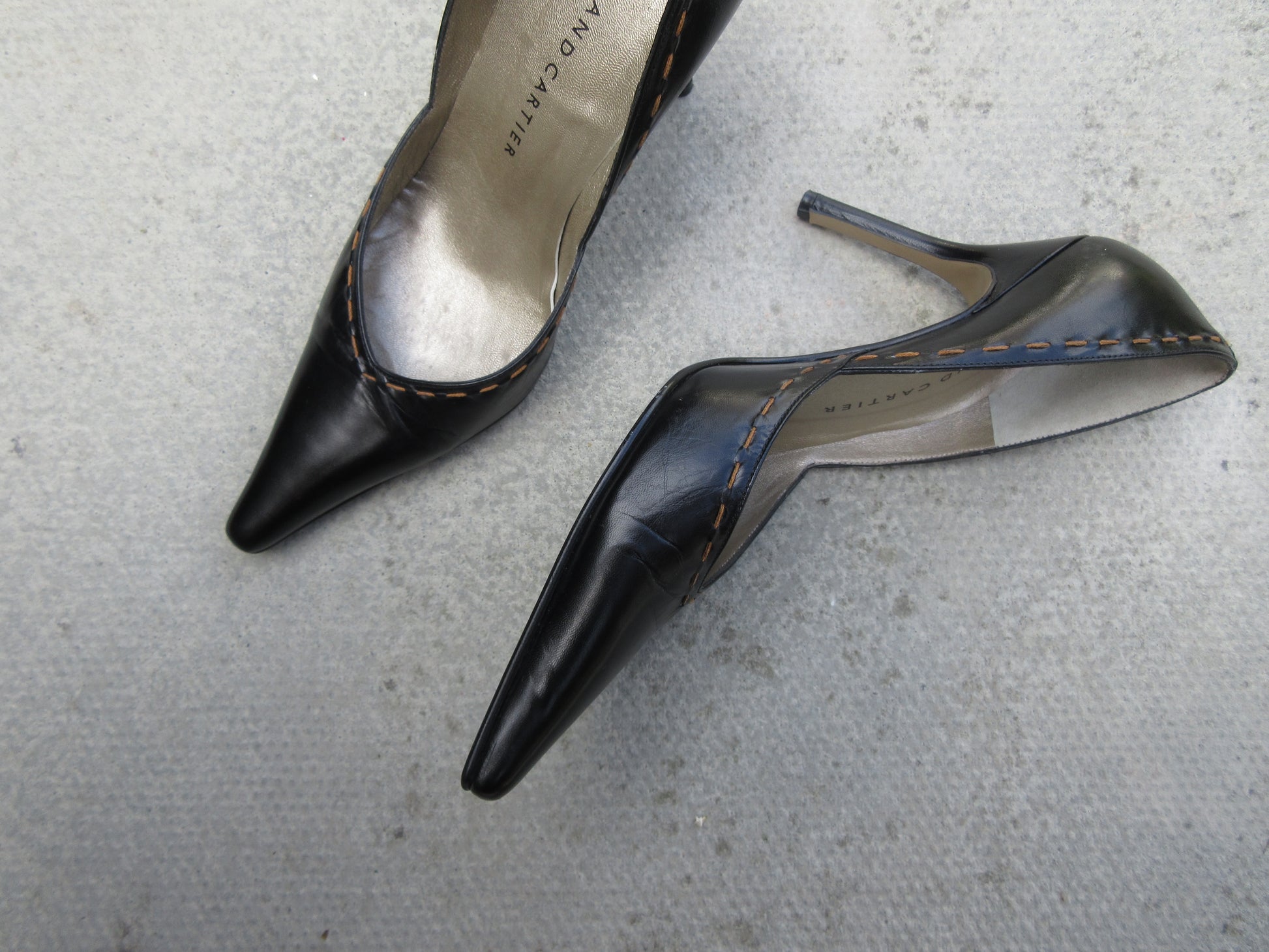 Leather black pointed toe heel with fine detailing along the edges, accented by light brown stitching.