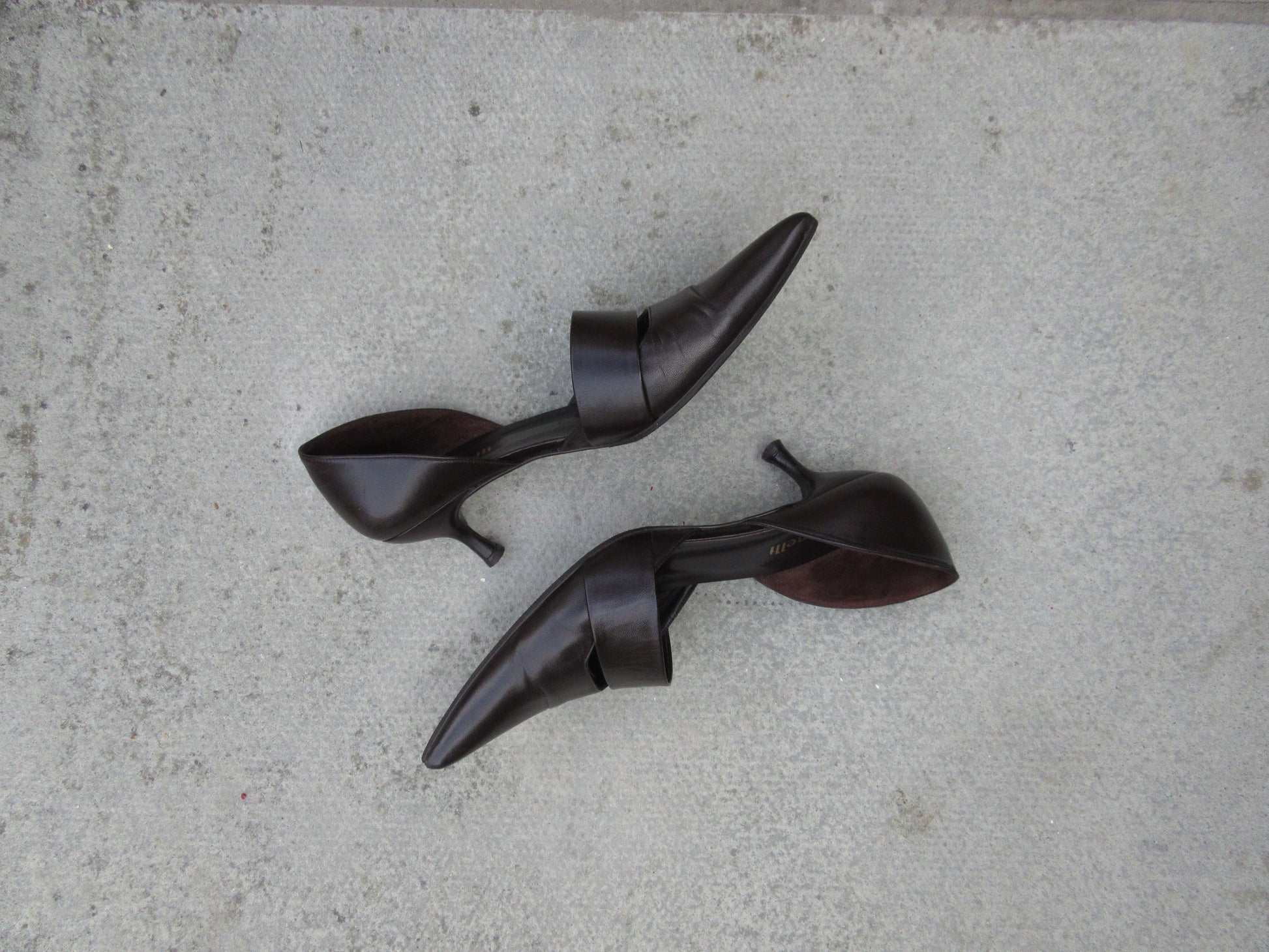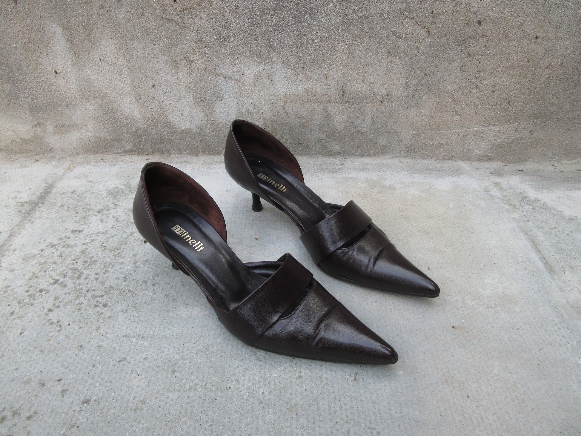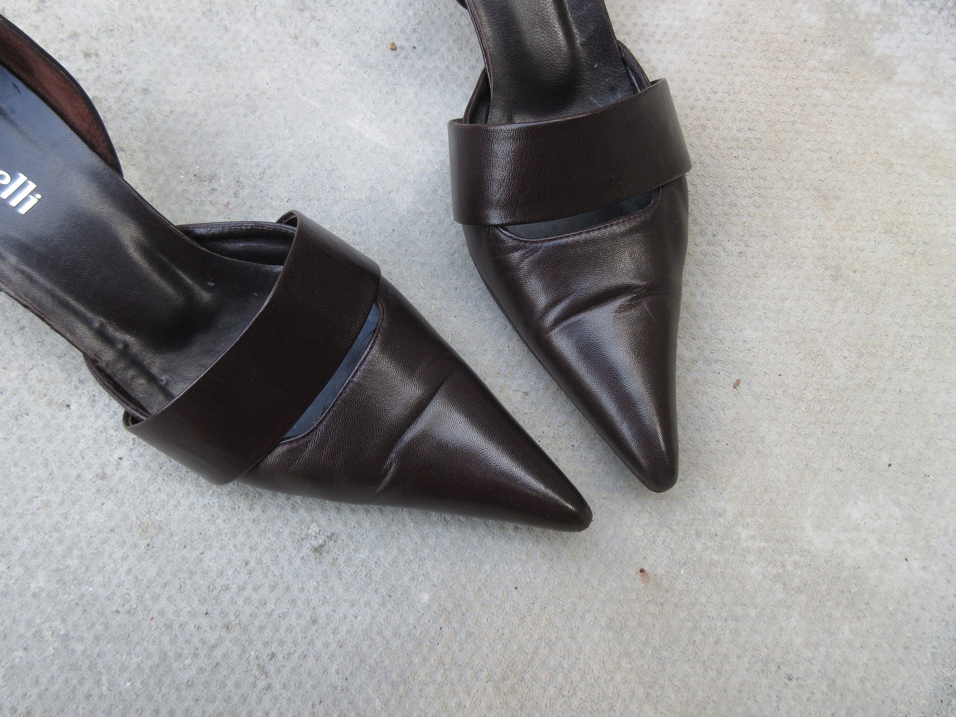 Genuine leather dark brown pointed toe heels with front slither cut out detail.