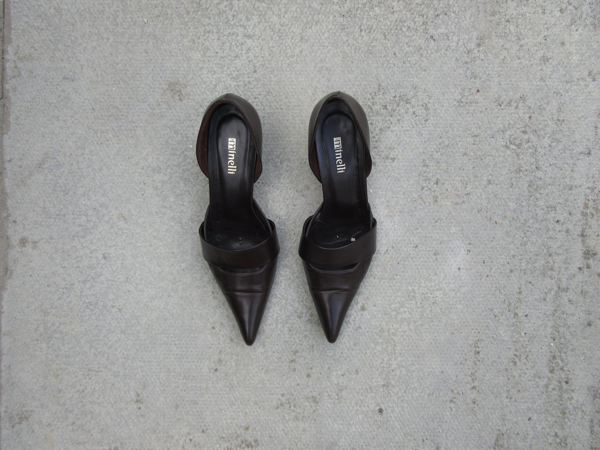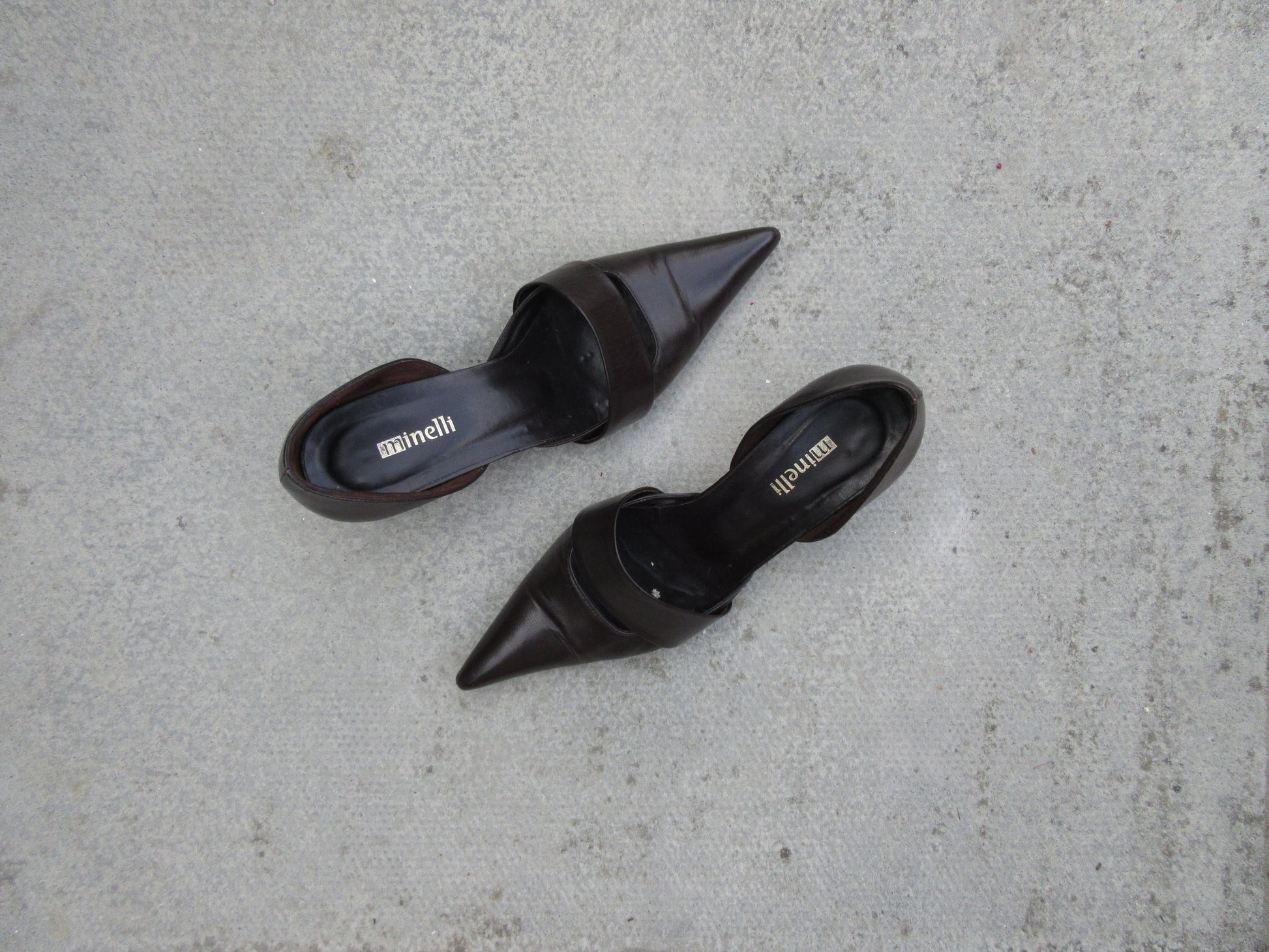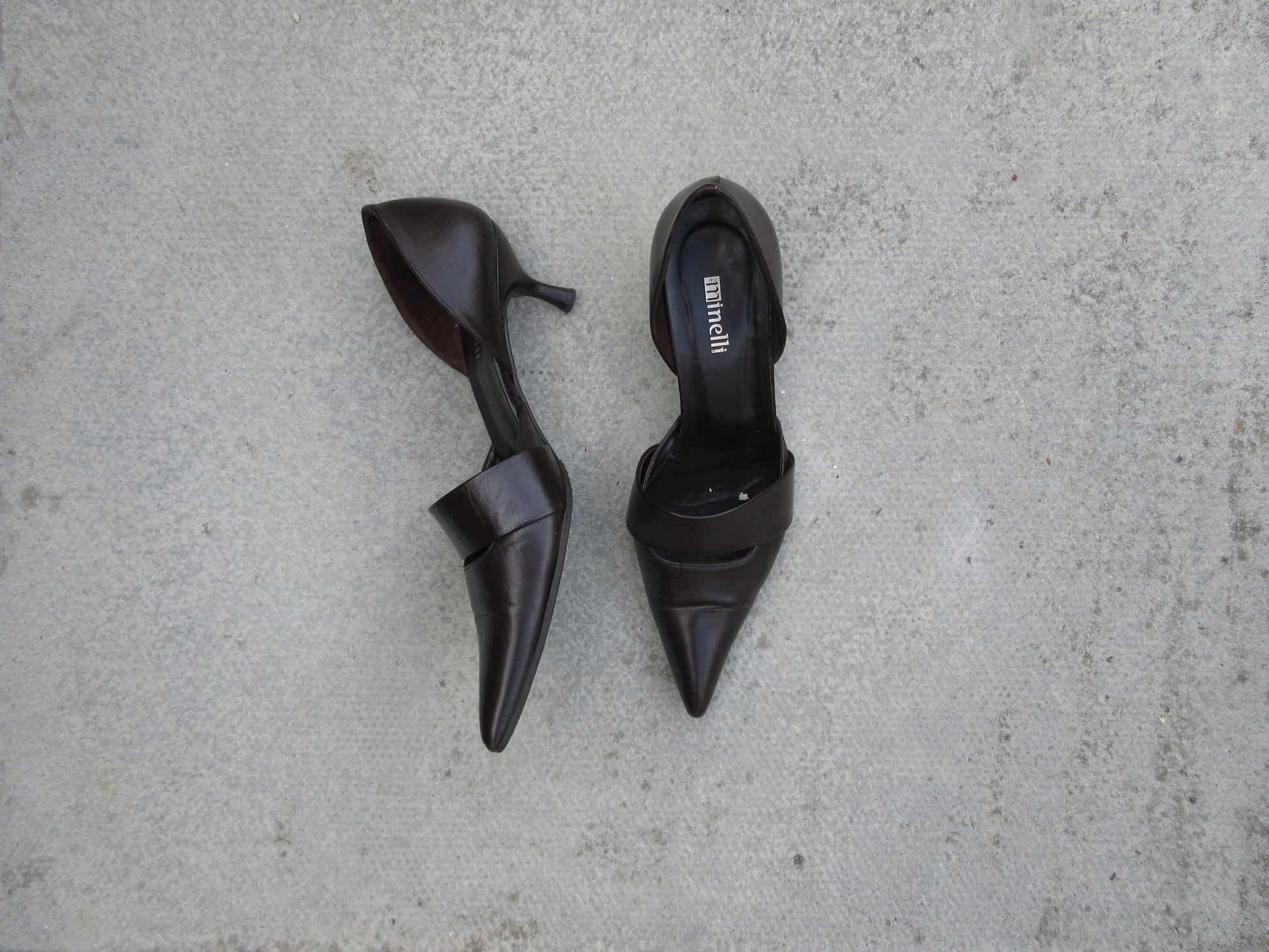 Genuine leather dark brown pointed toe heels with front slither cut out detail.